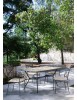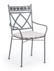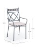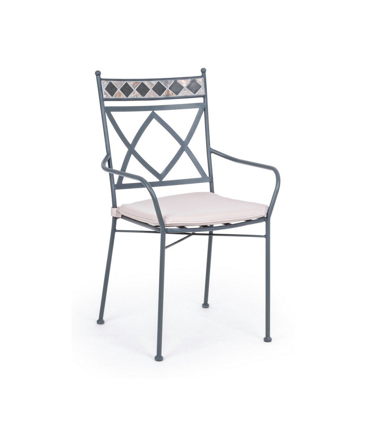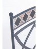 STRUTTURA IN ACCIAIO TRATTATO PER ESTERNO TRAMITE ZINCATURA E VERNICIATO A POLVERE (POLIESTERE). SCHIENALE CON DECORO IN CERAMICA CON LAVORAZIONE A MOSAICO. CUSCINO SFODERABILE IN TESSUTO POLIESTERE. IMPILABILE. IMBALLO SENZA CARTONE.