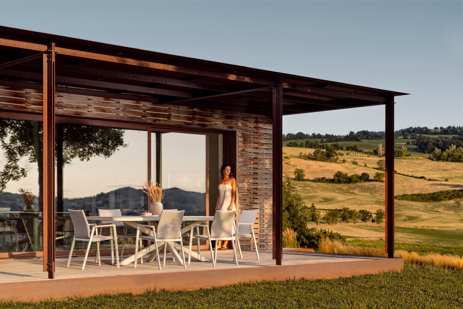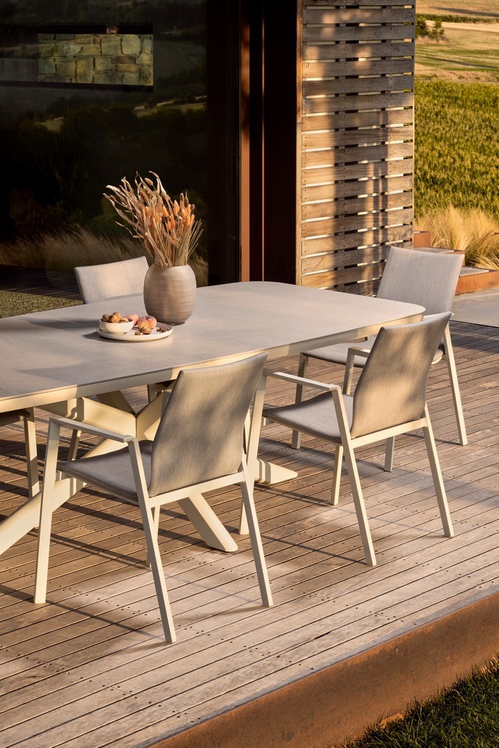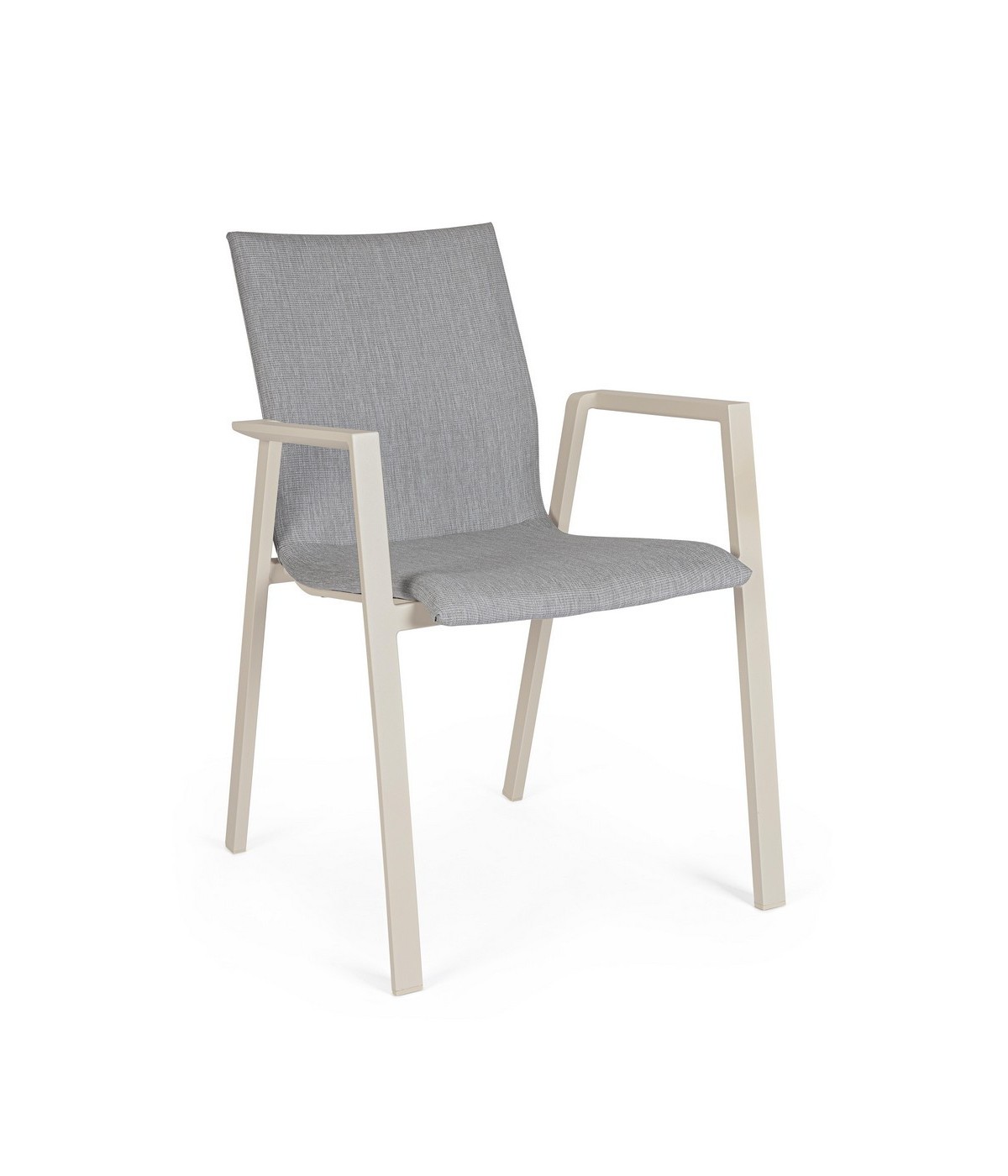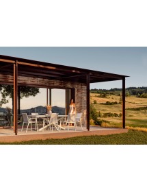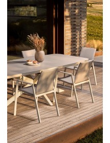 STRUTTURA IN ALLUMINIO VERNICIATA A POLVERE (POLIESTERE). RIVESTIMENTO CON TESSUTO IDROREPELLENTE MISTO (70% TEXTILENE, 30% OLEFIN). IMBOTTITURA PER ESTERNO FAST DRY FOAM. IMPILABILE. IMBALLO SENZA CARTONE.