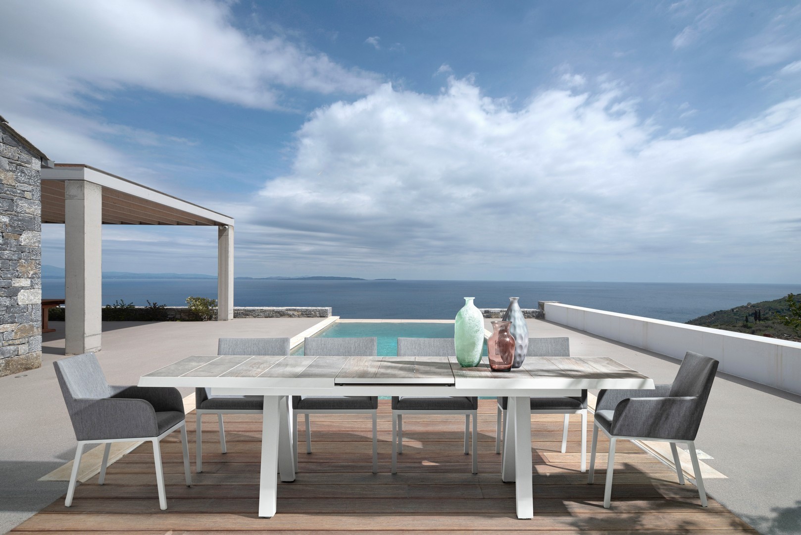 STRUTTURA IN ALLUMINIO VERNICIATA A POLVERE (POLIESTERE). RIVESTIMENTO CON TESSUTO MISTO (70% TEXTILENE E 30% OLEFIN). IMBOTTITURA PER ESTERNO FAST DRY FOAM. GAMBE DA ASSEMBLARE.
