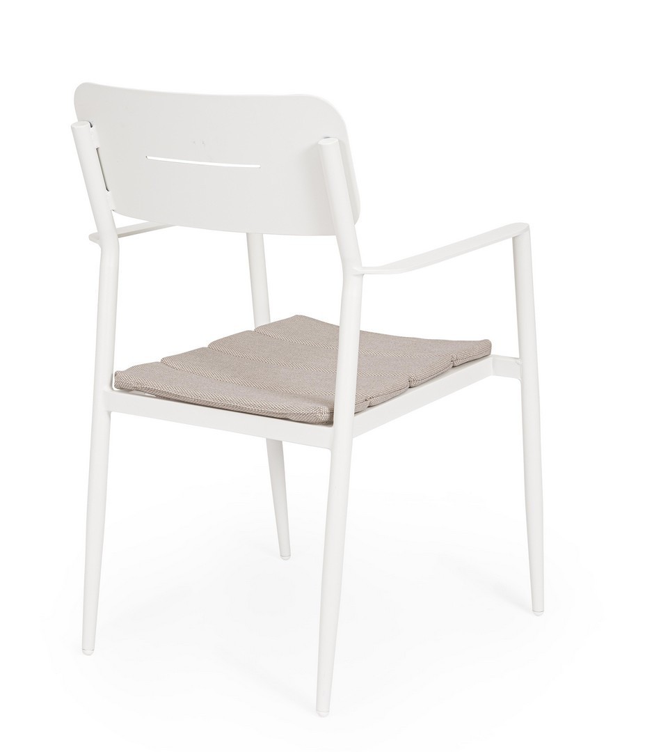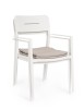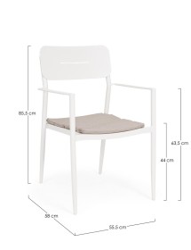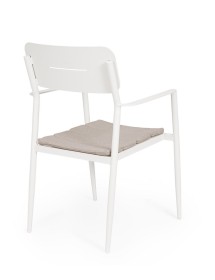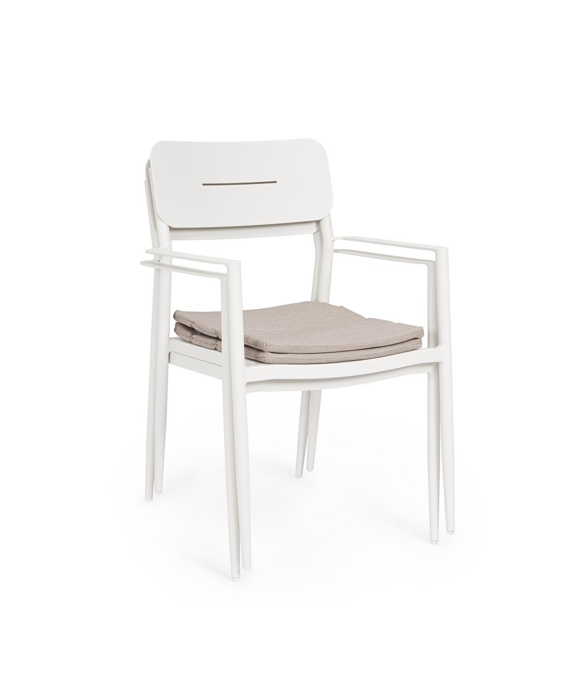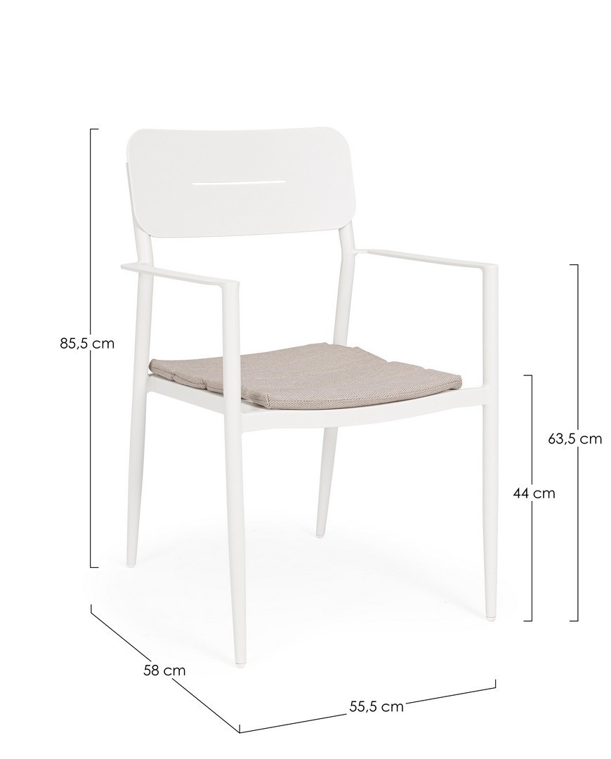 STRUTTURA IN ALLUMINIO VERNICIATO A POLVERE (POLIESTERE). CUSCINO SEDUTA NON SFODERABILE CON TESSUTO IDROREPELLENTE OLEFIN (100% POLIPROPILENE). IMPILABILE. IMBALLO SENZA CARTONE.
