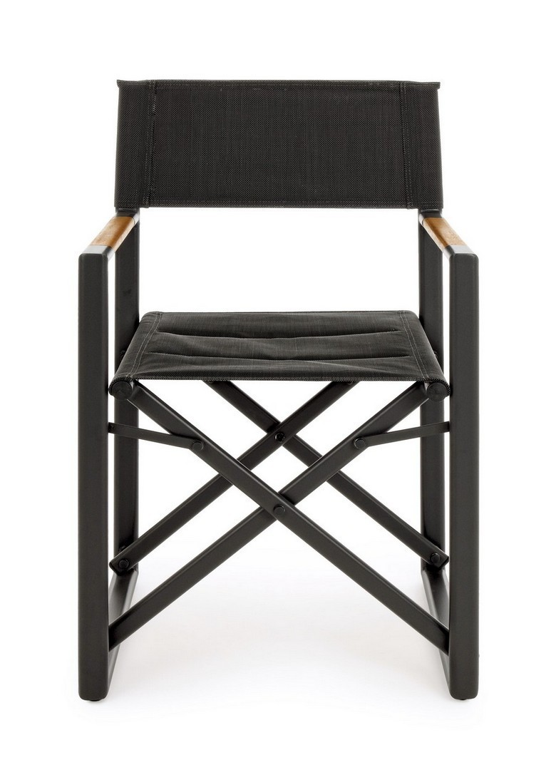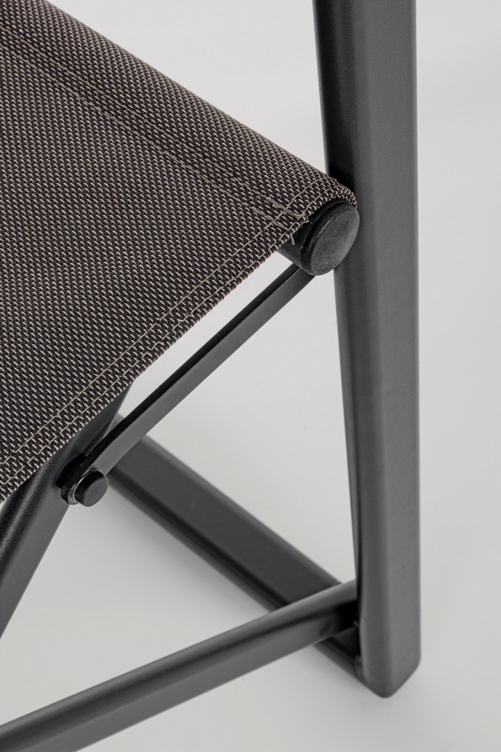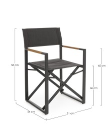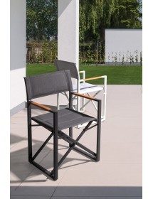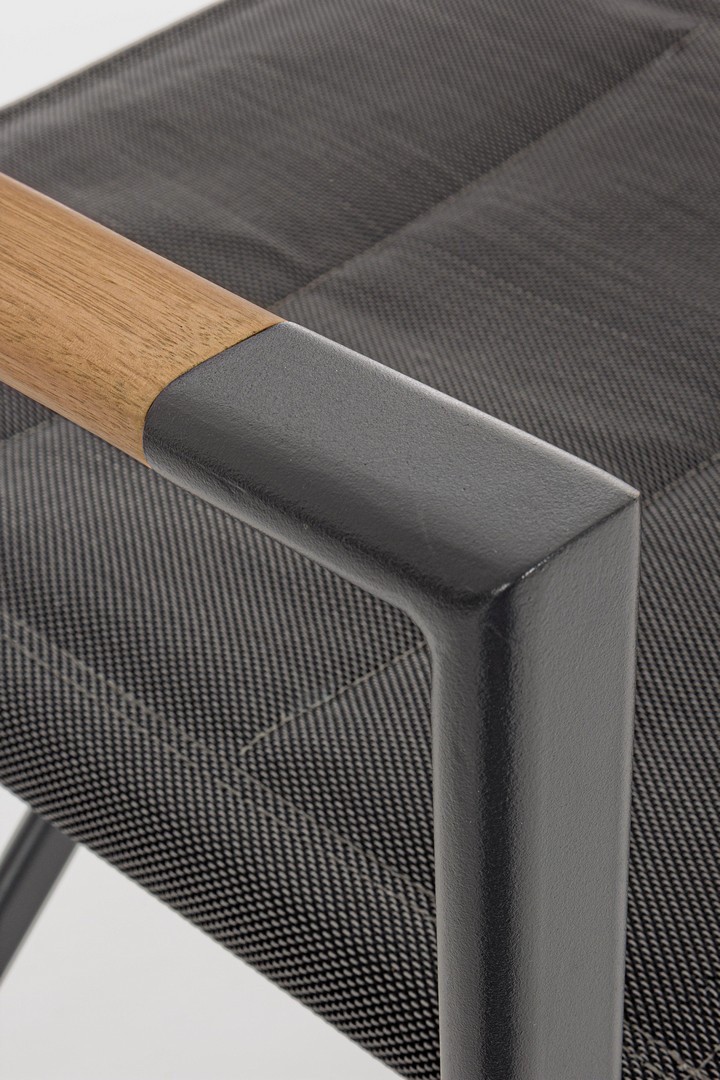 STRUTTURA IN ALLUMINIO, VERNICIATO A POLVERE (POLIESTERE). SEDUTA E SCHIENALE IN TEXTILENE 2X2 (680g/m2). BRACCIOLI CON INSERTI IN TEAK. FERRAMENTA IN ACCIAIO INOSSIDABILE. PIEGHEVOLE.