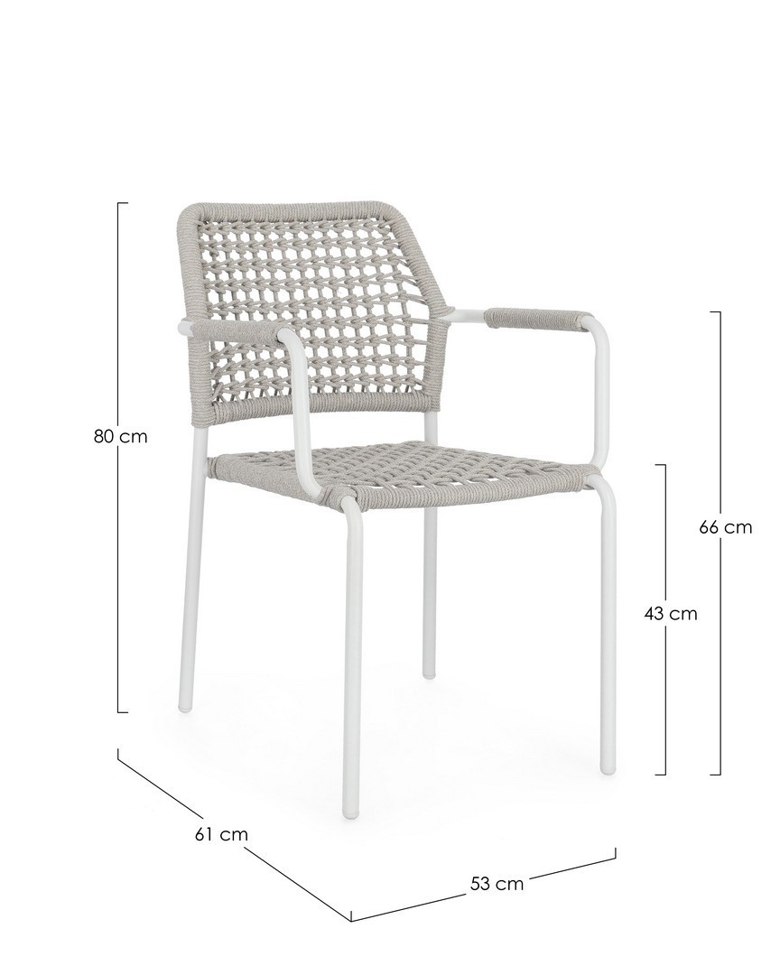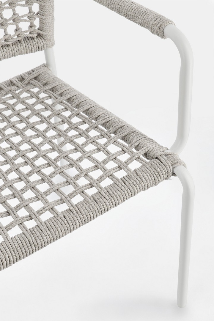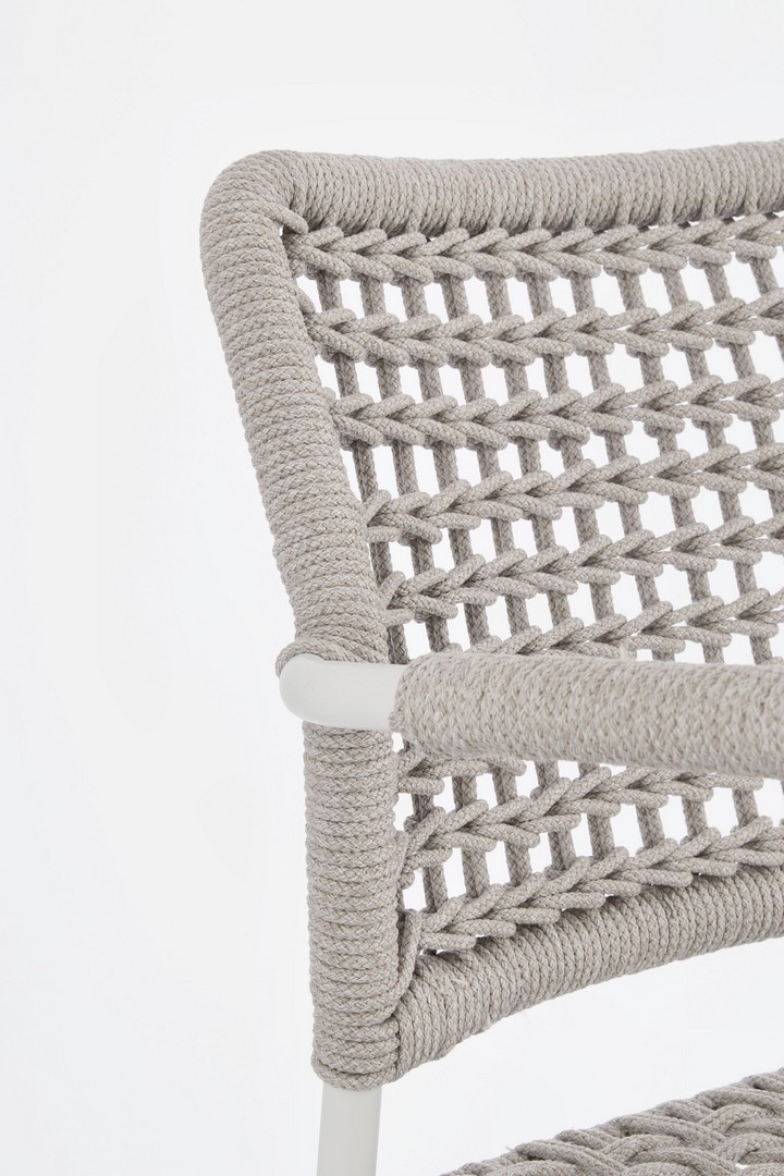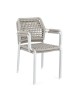STRUTTURA IN ALLUMINIO VERNICIATA A POLVERE (POLIESTERE). INTRECCIO PER ESTERNO IN CORDA POLIESTERE. IMPILABILE. IMBALLO SENZA CARTONE.
