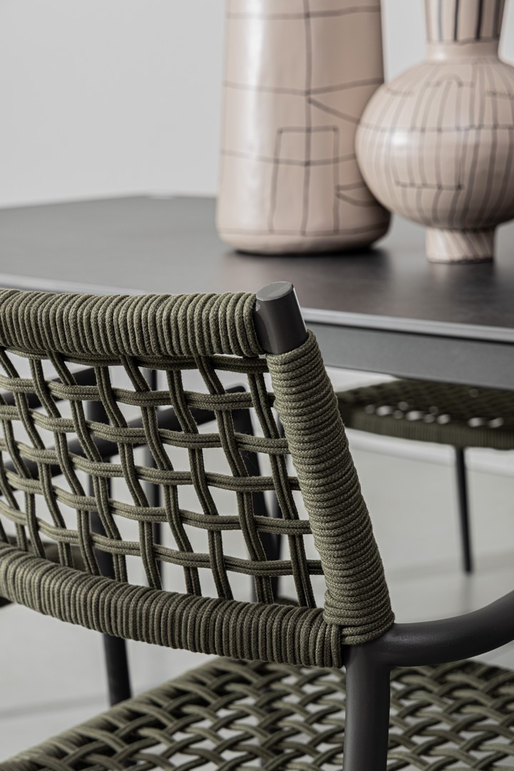 STRUTTURA IN ALLUMINIO VERNICIATA A POLVERE (POLIESTERE). INTRECCIO PER ESTERNO IN CORDA OLEFIN (POLIPROPILENE).