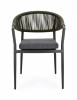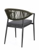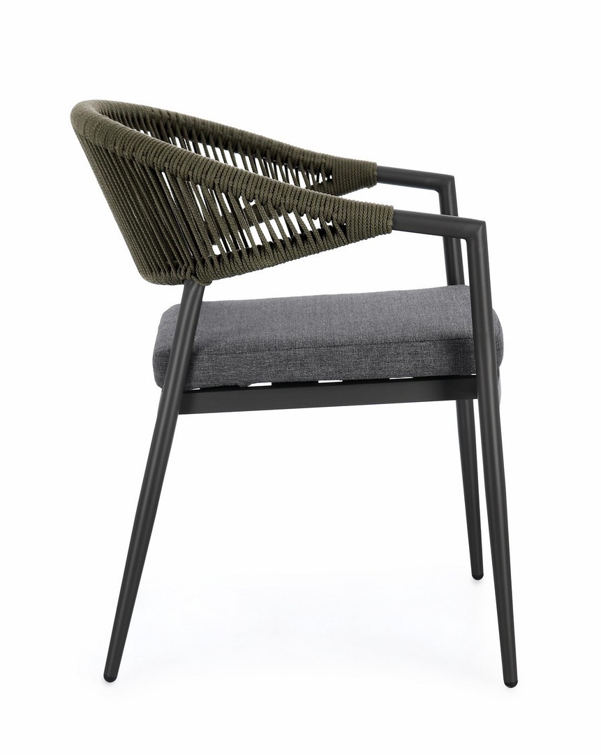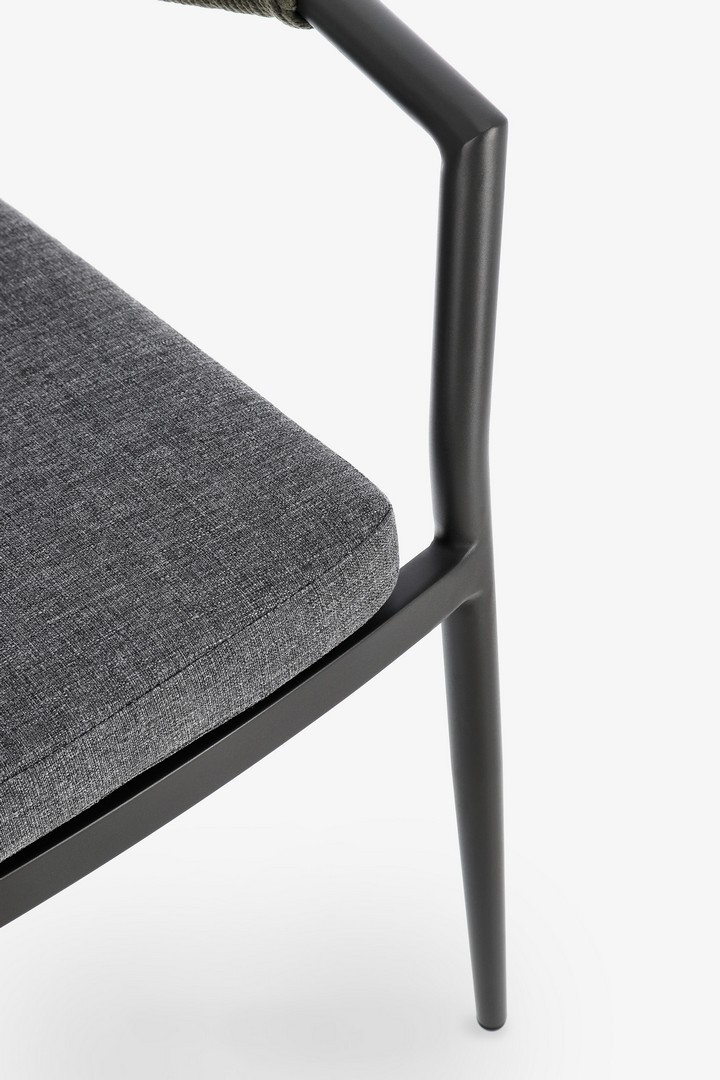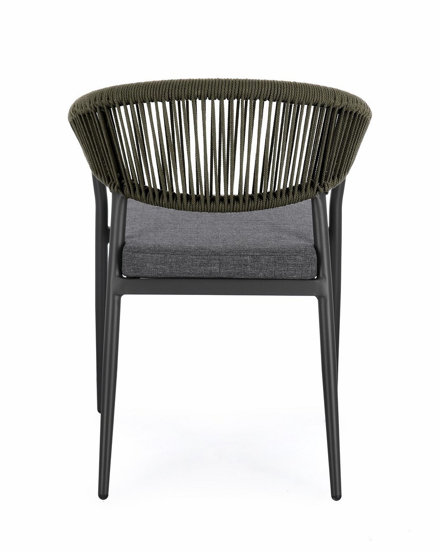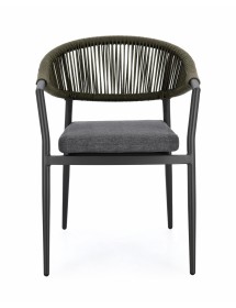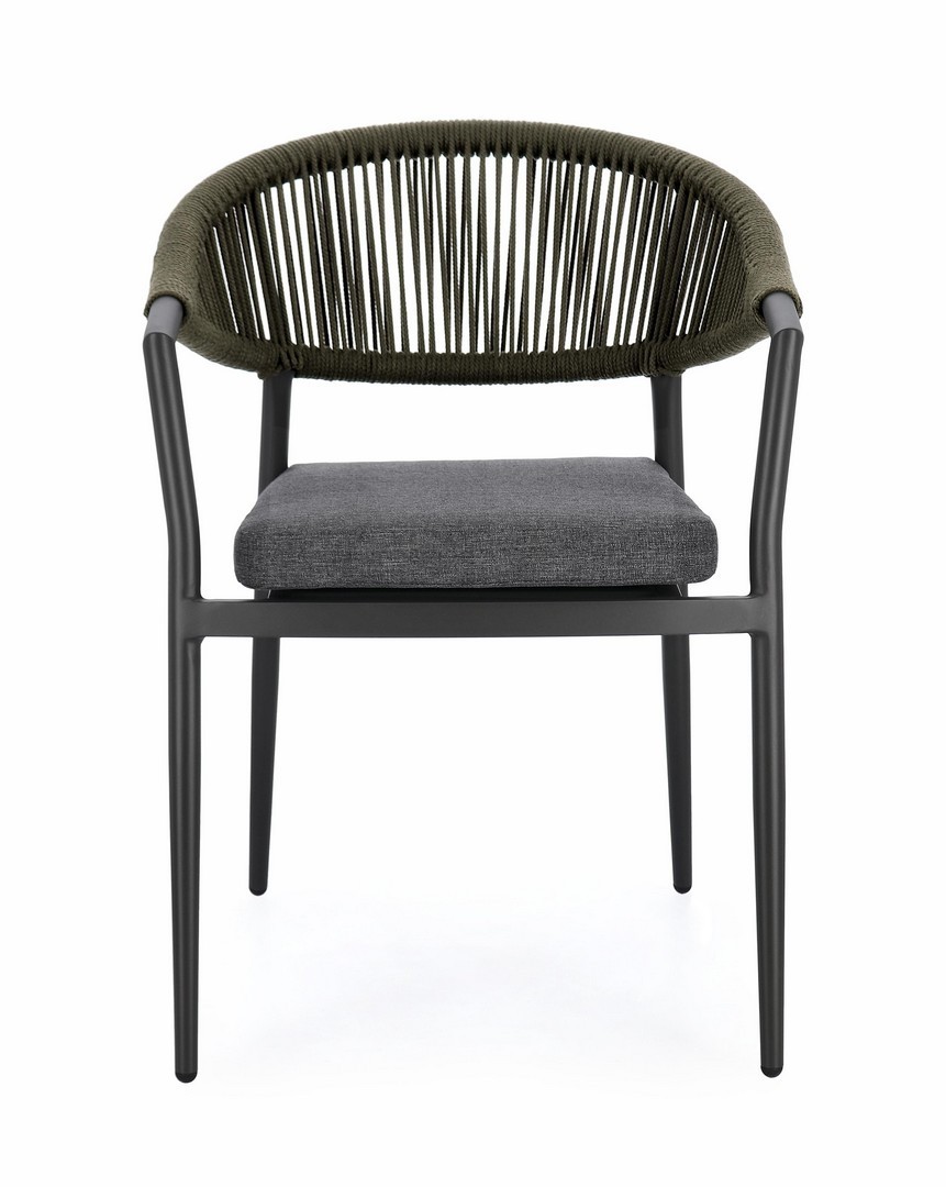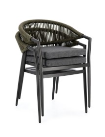 STRUTTURA IN ALLUMINIO VERNICIATA A POLVERE (POLIESTERE). INTRECCIO PER ESTERNO IN CORDA OLEFIN (POLIPROPILENE). CUSCINI SFODERABILI IN TESSUTO IDROREPELLENTE OLEFIN (100% POLIPROPILENE). IMPILABILE. IMBALLO SENZA CARTONE.