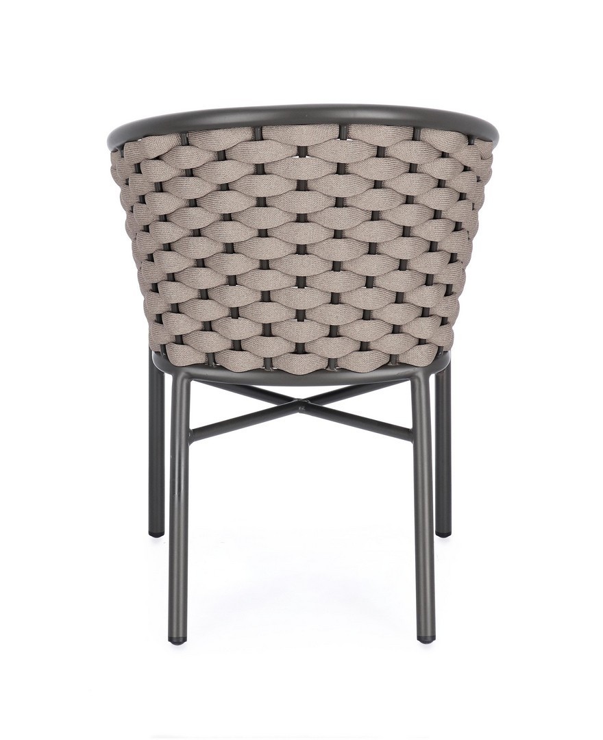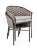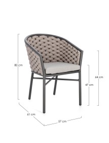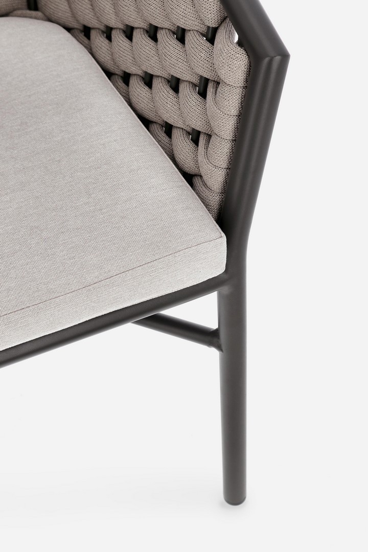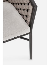 STRUTTURA IN ALLUMINIO VERNICIATA A POLVERE (POLIESTERE). INTRECCIO PER ESTERNO IN CORDA POLIESTERE IMBOTTITA IN GOMMA (POLIETILENE). CUSCINI SFODERABILI IN TESSUTO IDROREPELLENTE 100% POLIESTERE. IMPILABILE.
