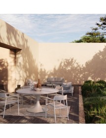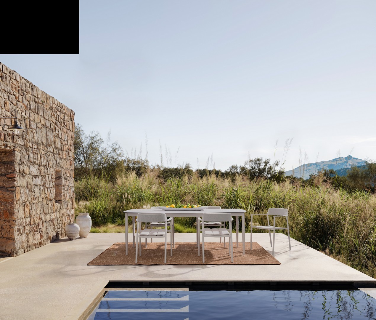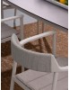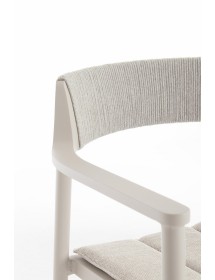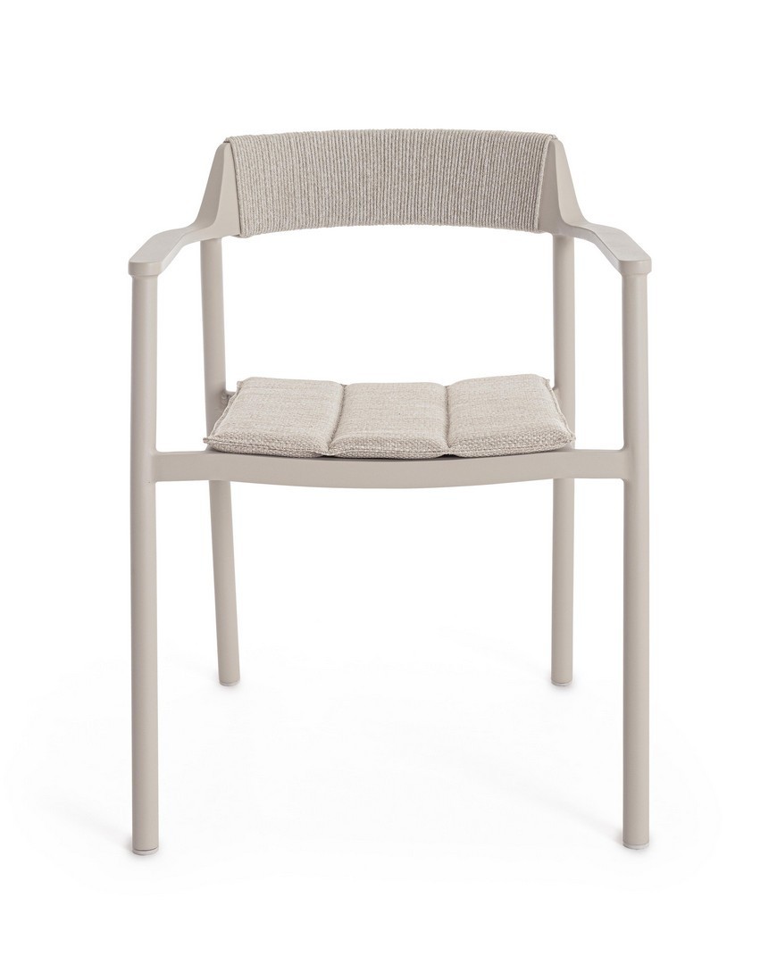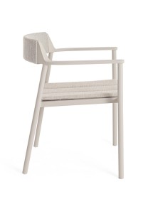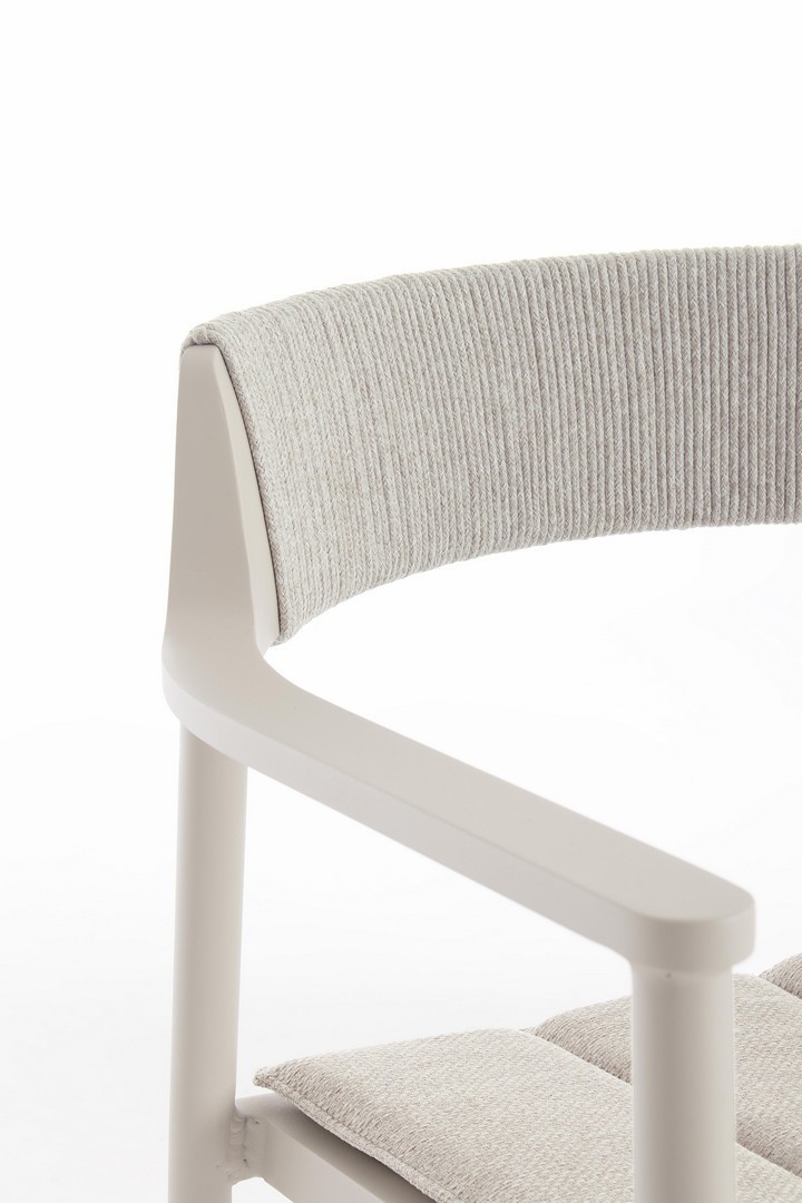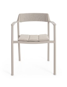 STRUTTURA IN ALLUMINIO VERNICIATO A POLVERE (POLIESTERE). SCHIENALE CON INTRECCIO IN CORDA DI POLIESTERE. CUSCINO SEDUTA SFODERABILE CON TESSUTO IDROREPELLENTE OLEFIN (100% POLIPROPILENE). IMPILABILE.