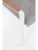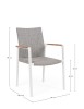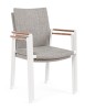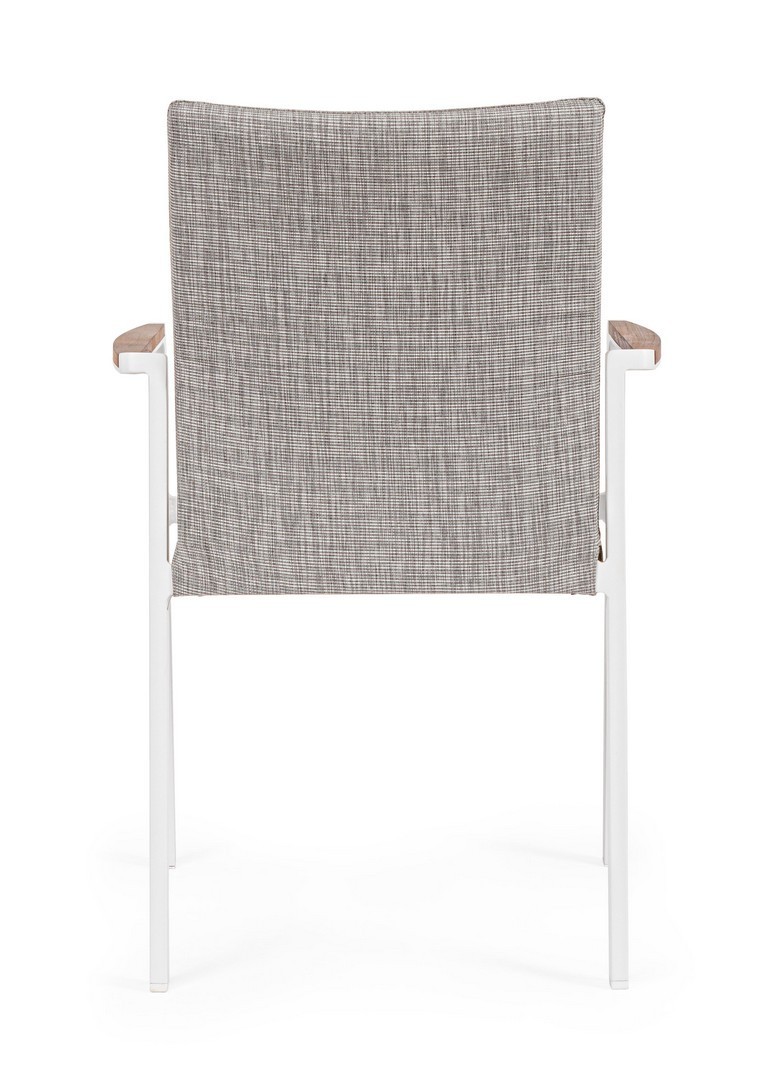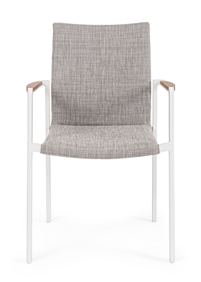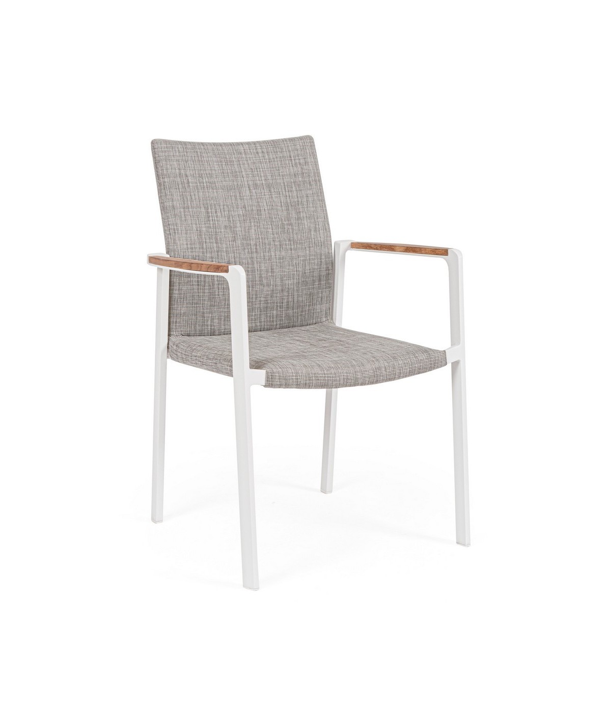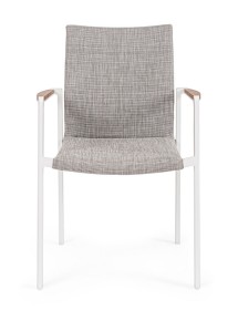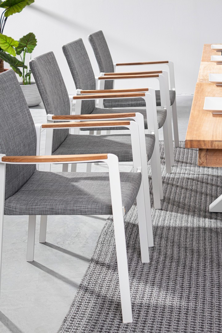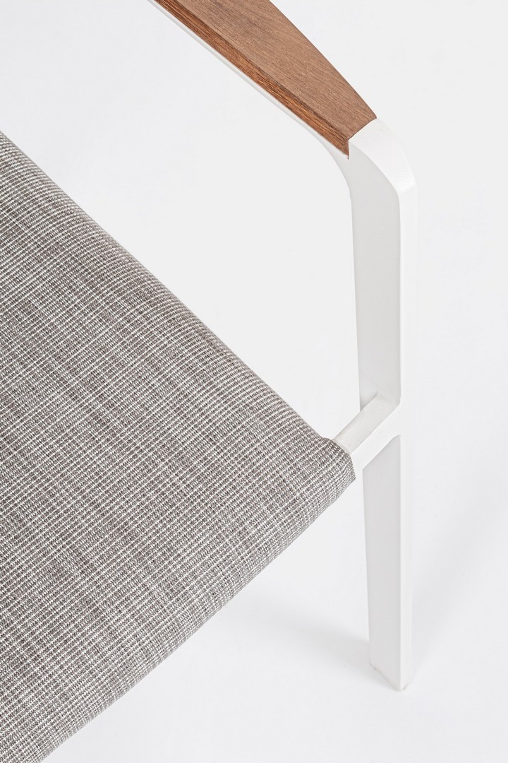 ALLUMINIO VERNICIATO A POLVERE (POLIESTERE). BRACCIOLI CON INSERTI IN TEAK. RIVESTIMENTO SEDUTA E SCHIENALE IN TESSUTO PER ESTERNO (70% TEXTILENE 30% OLEFIN), IMBOTTITURA "FAST DRY FOAM". IMPILABILE.