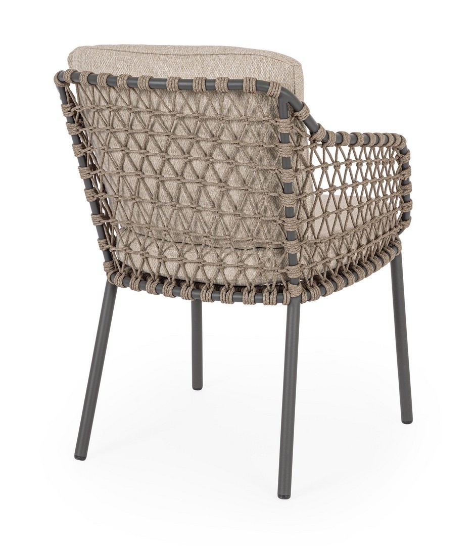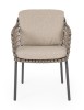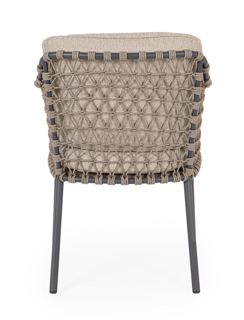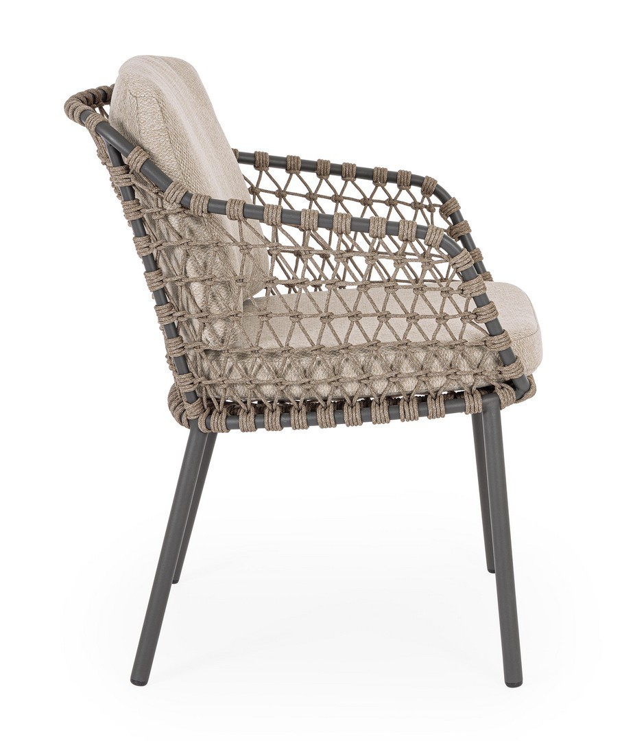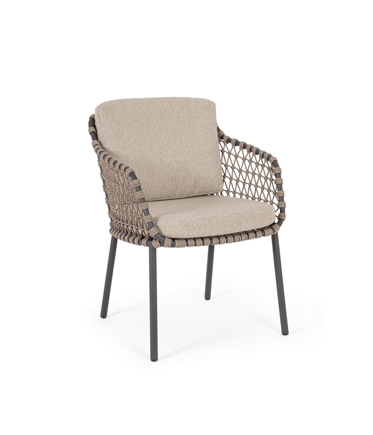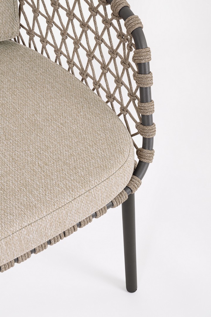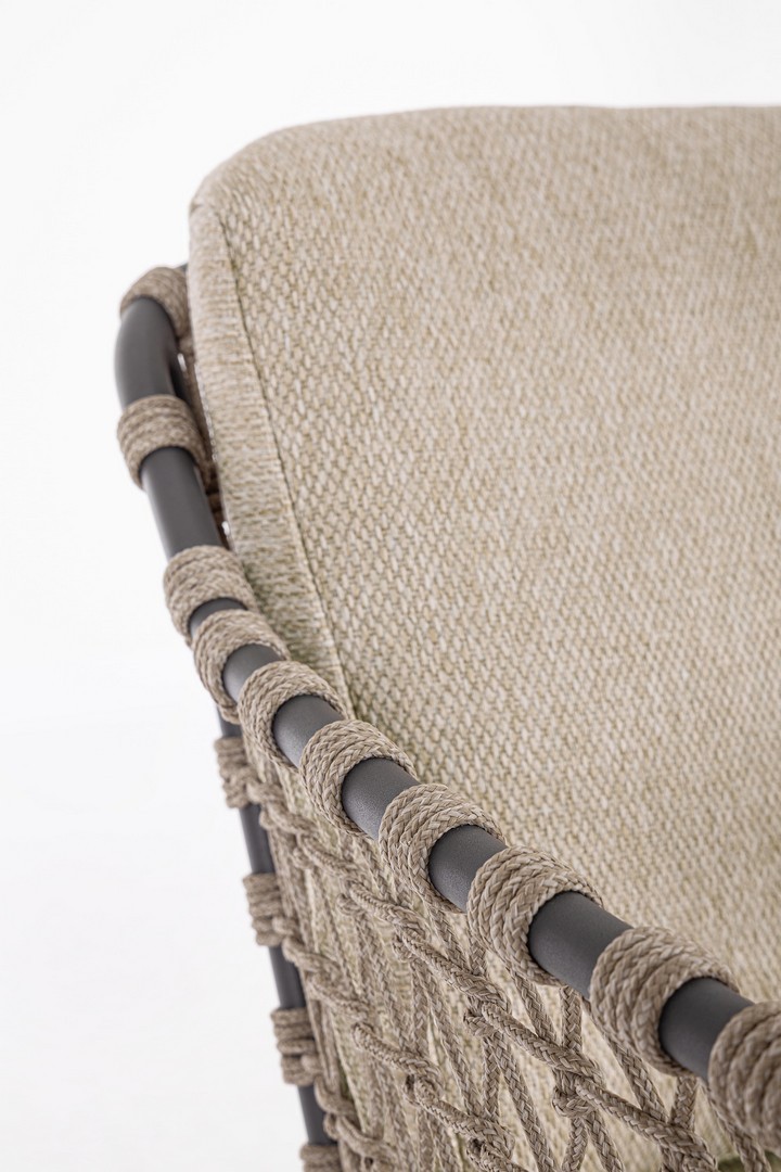 STRUTTURA IN ACCIAIO INOSSIDABILE (201). INTRECCIO PER ESTERNO IN CORDA (POLIPROPILENE). CUSCINI SFODERABILI IN TESSUTO IDROREPELLENTE SUNPROOF OLEFIN (100%POLIPROPILENE). PER EVITARE FENOMENI DI CORROSIONE, SI SCONSIGLIA DI POSIZIONARE MOBILI CON STRUTTURA IN ACCIAIO INOSSIDABILE 201 IN LUOGHI AD ALTA SALINITÀ ( AMBIENTI MARINI ).