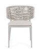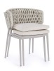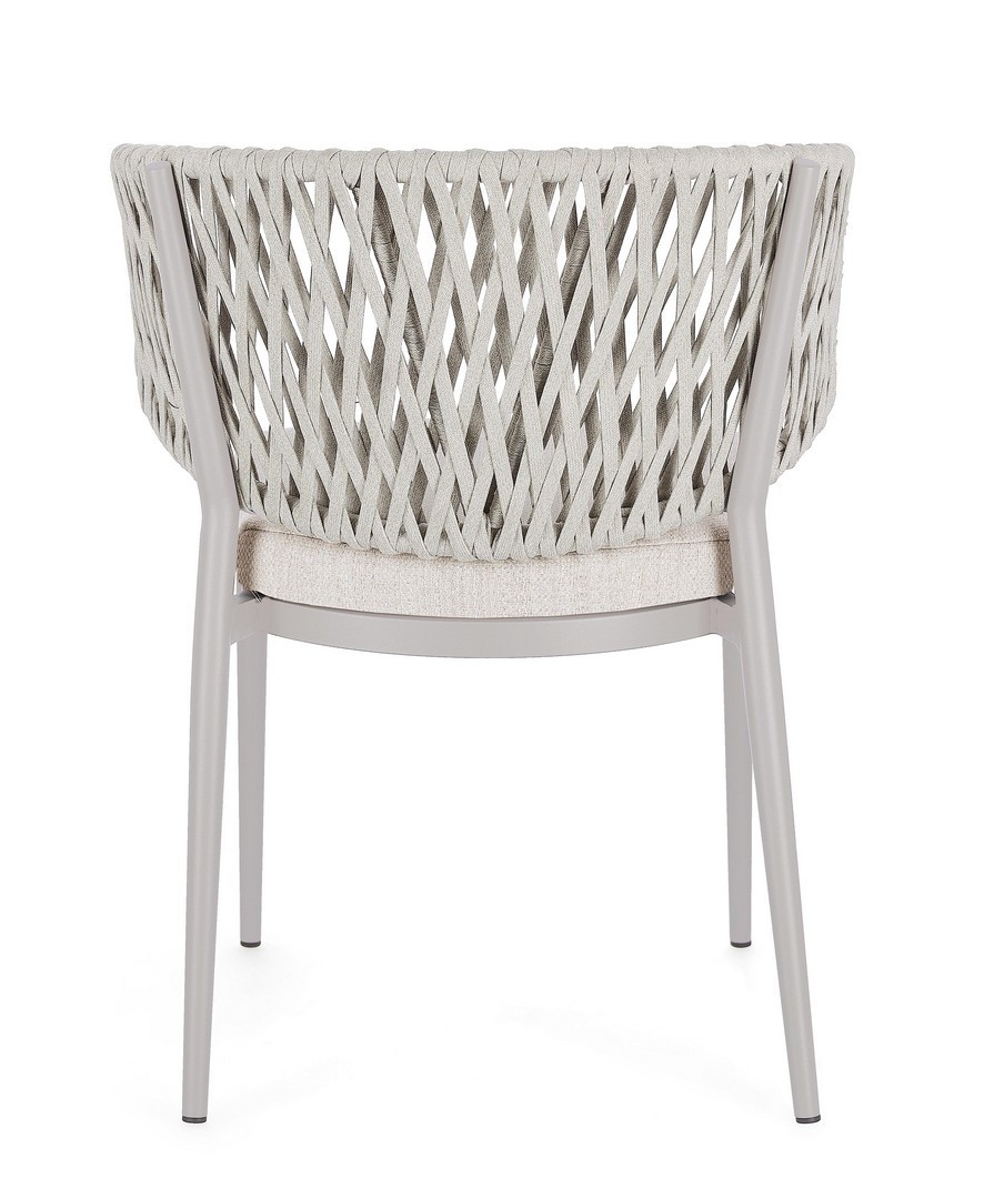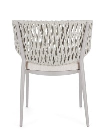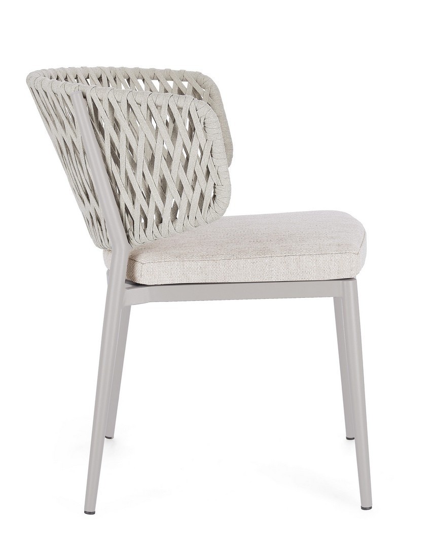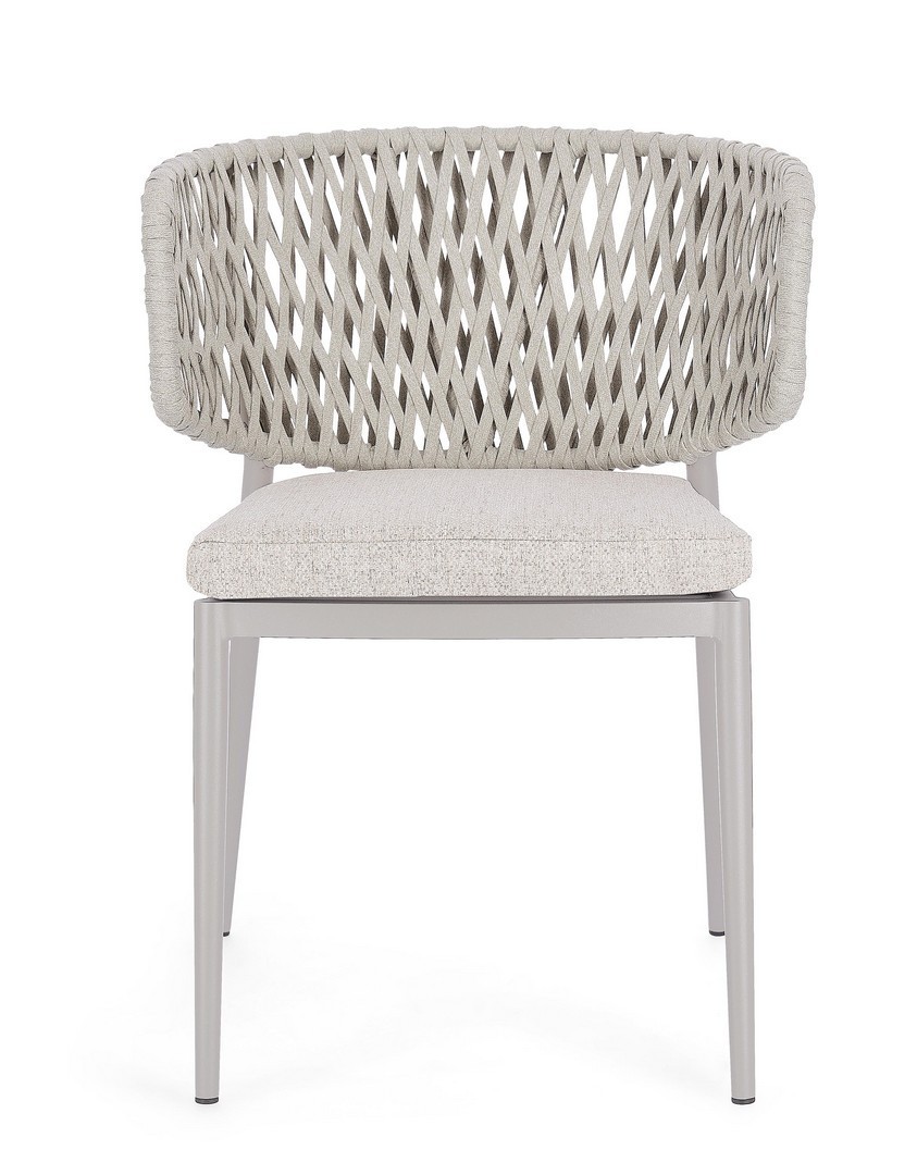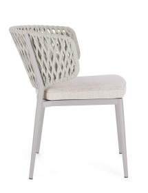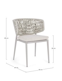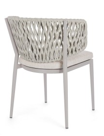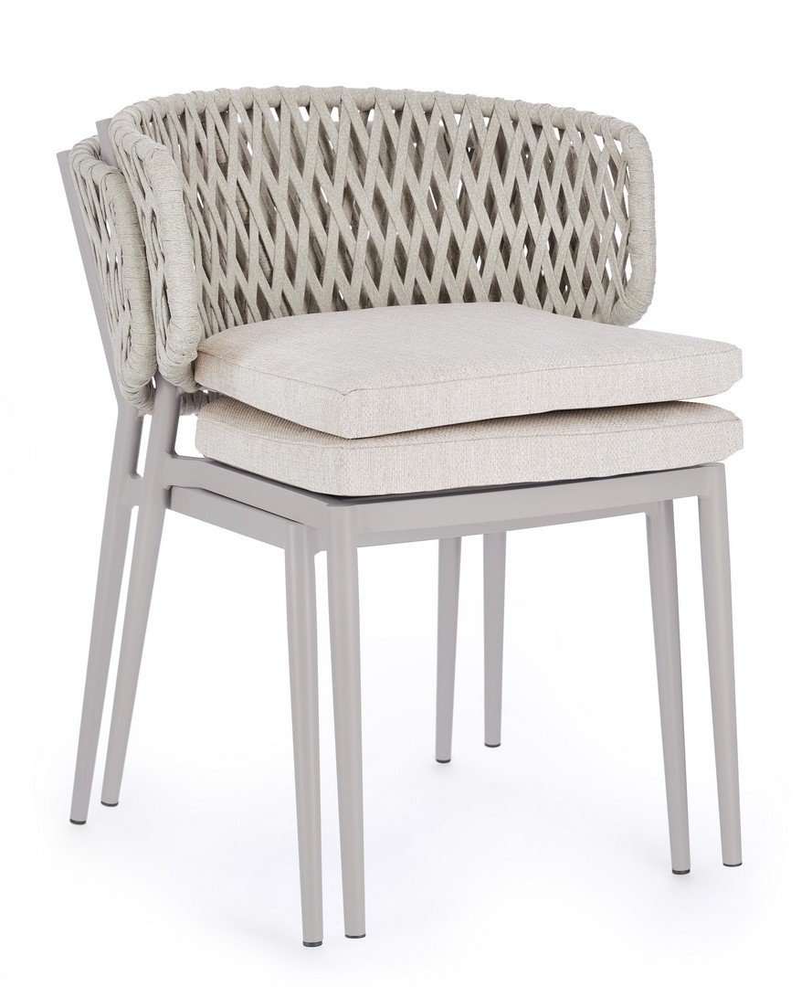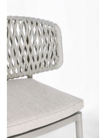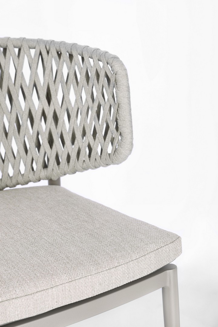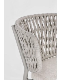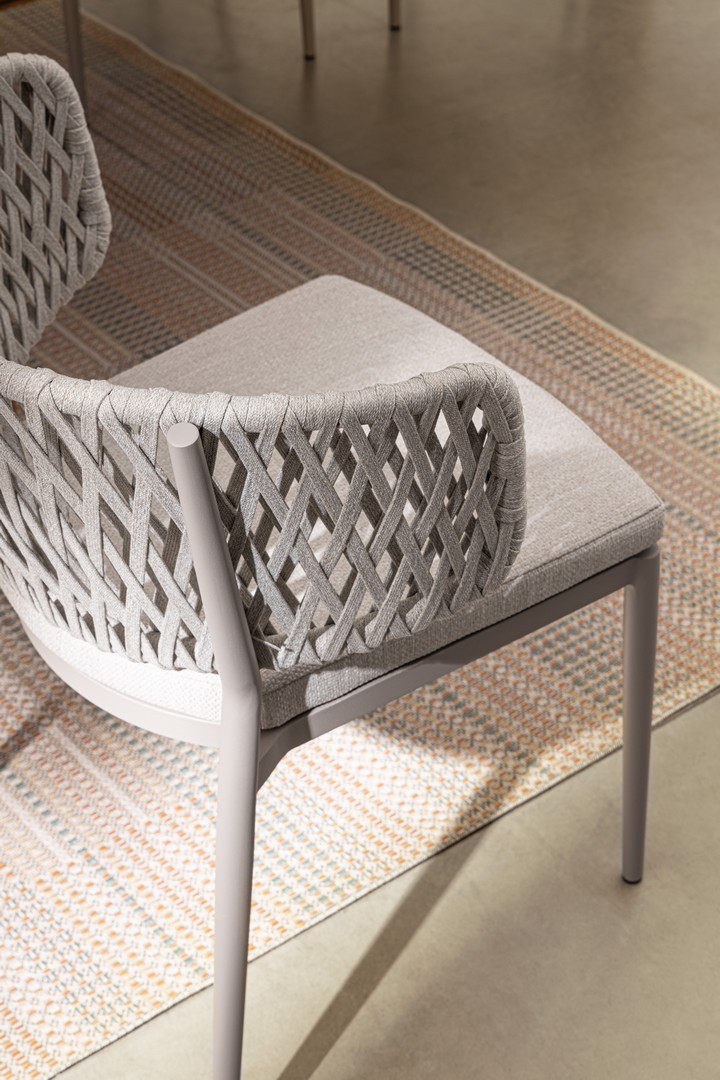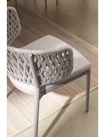 STRUTTURA IN ALLUMINIO VERNICIATO A POLVERE (POLIESTERE). INTRECCIO CON CORDE IN TETORON (100% POLIESTERE). CUSCINO SEDUTA SFODERABILE IN TESSUTO IDROREPELLENTE ACRILICO. IMPILABILE.