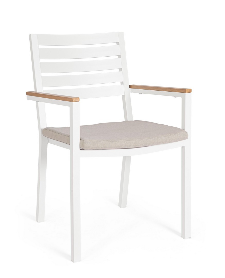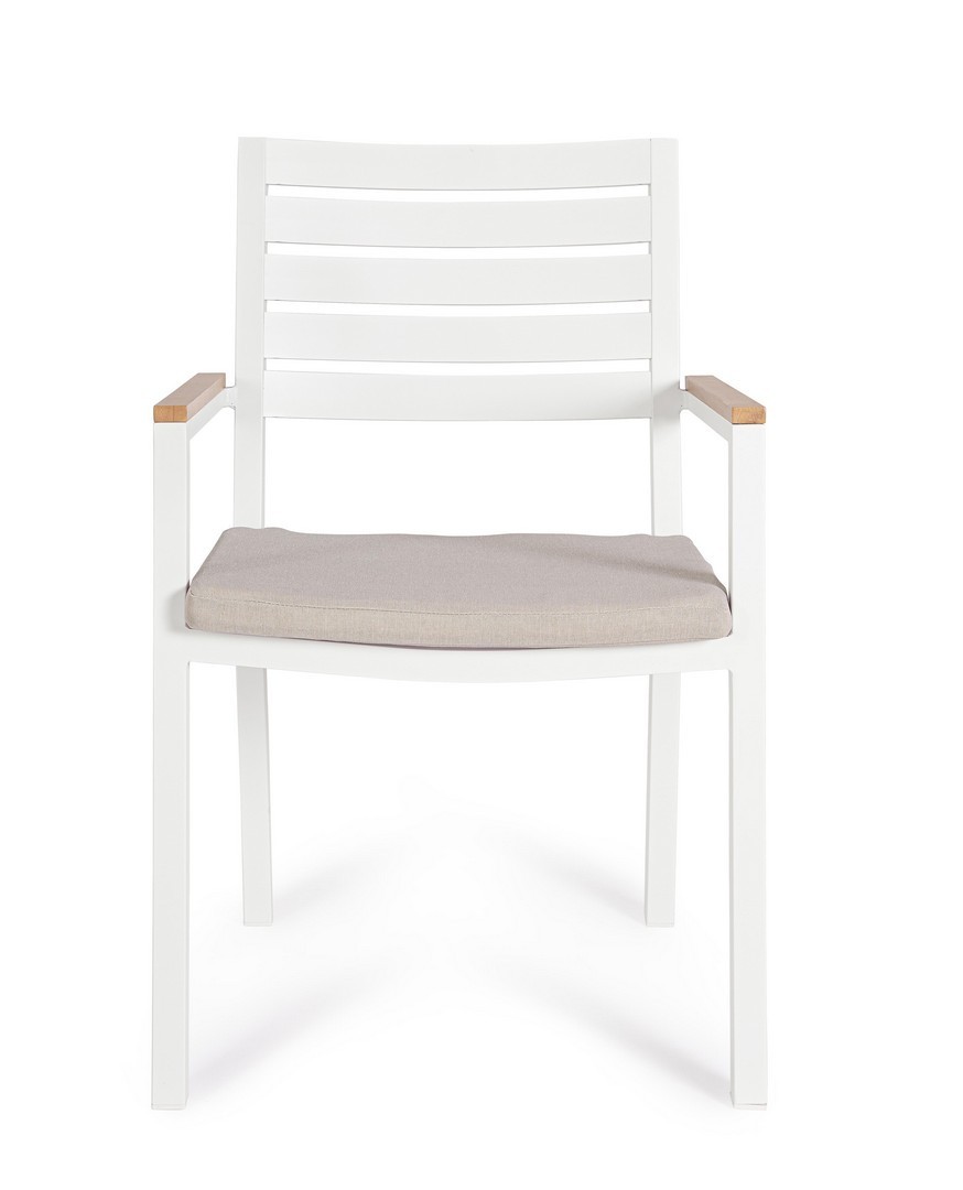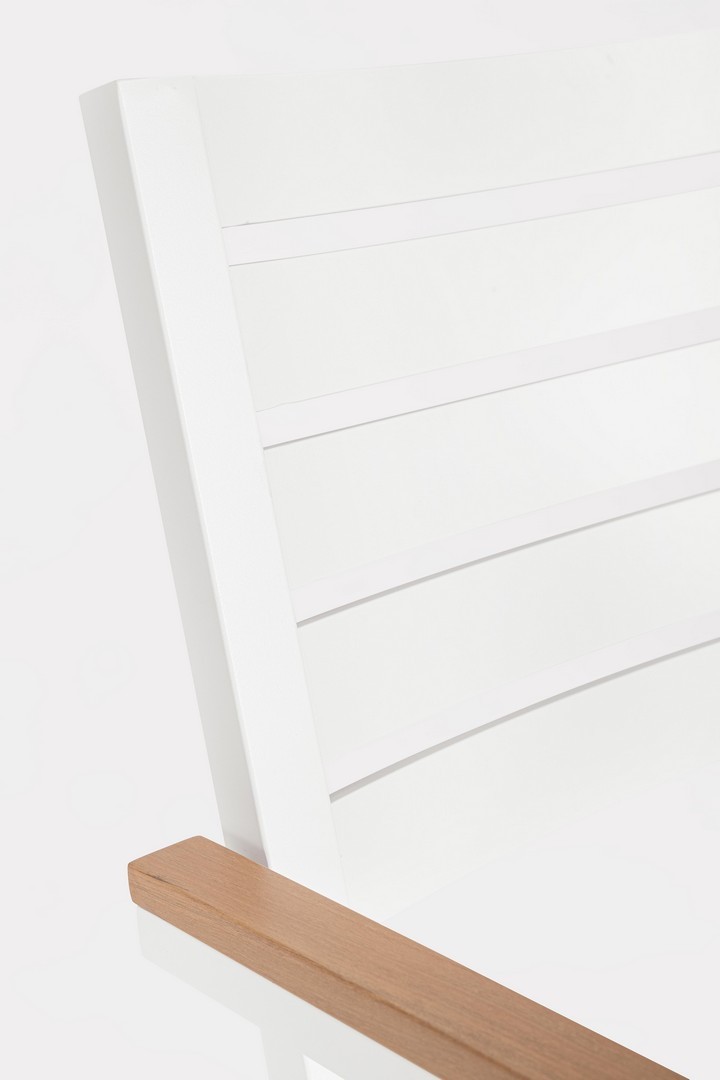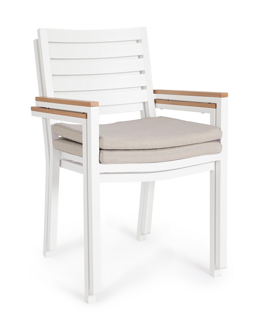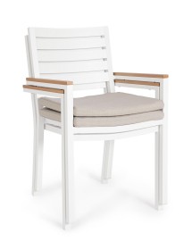 STRUTTURA IN ALLUMINIO, VERNICIATO A POLVERE (POLIESTERE). CUSCINI SFODERABILI CON TESSUTO IDROREPELLENTE SPUN POLY (POLIESTERE). BRACCIOLI CON INSERTI IN ALLUMINIO CON VERNICIATURA EFFETTO LEGNO. IMPILABILE.
