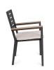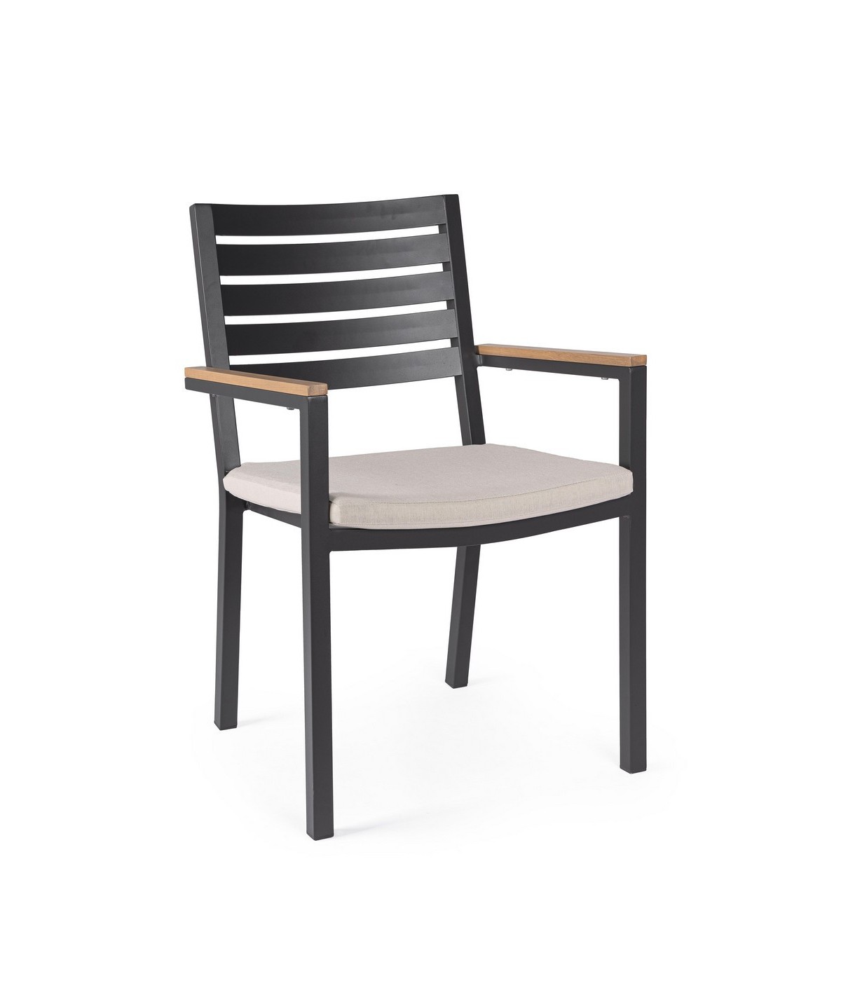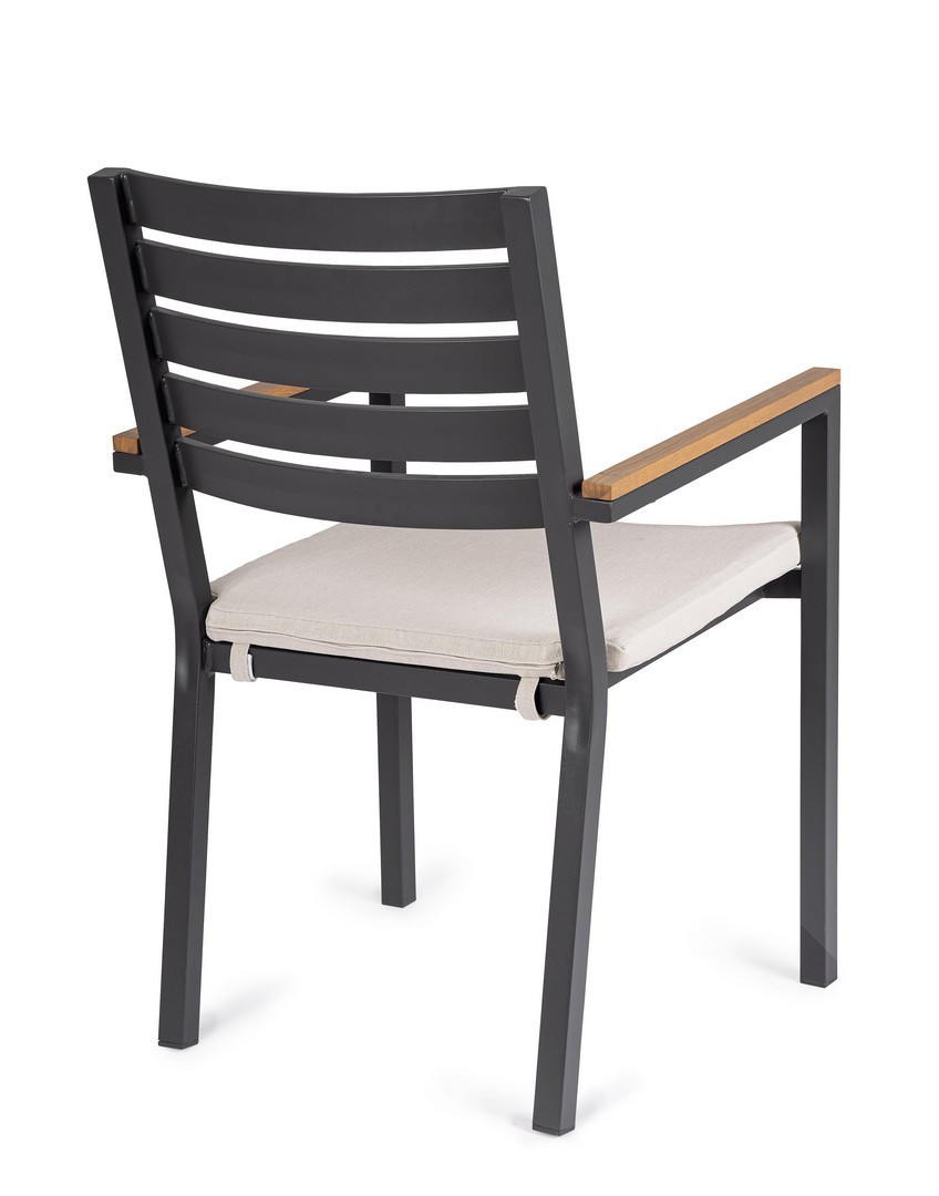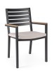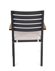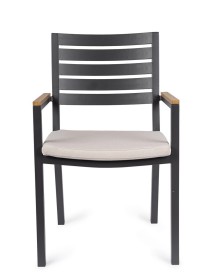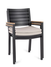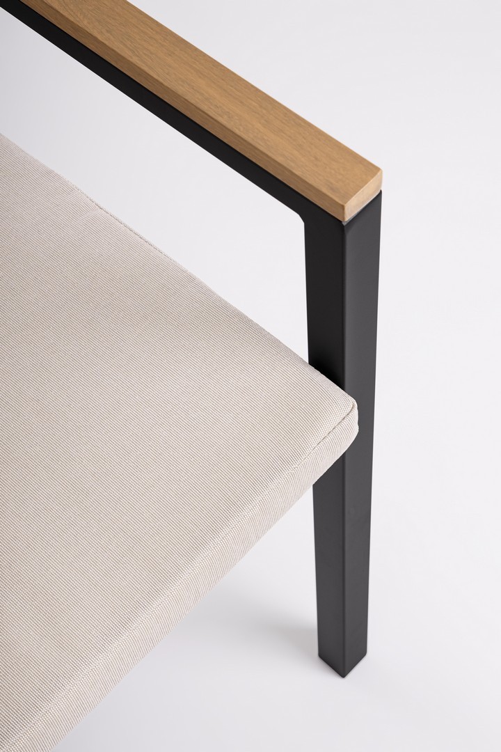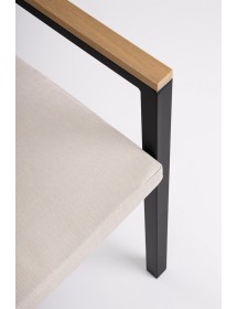 STRUTTURA IN ALLUMINIO, VERNICIATO A POLVERE (POLIESTERE). CUSCINI SFODERABILI CON TESSUTO IDROREPELLENTE SPUN POLY (POLIESTERE). BRACCIOLI CON INSERTI IN ALLUMINIO CON VERNICIATURA EFFETTO LEGNO. IMPILABILE.