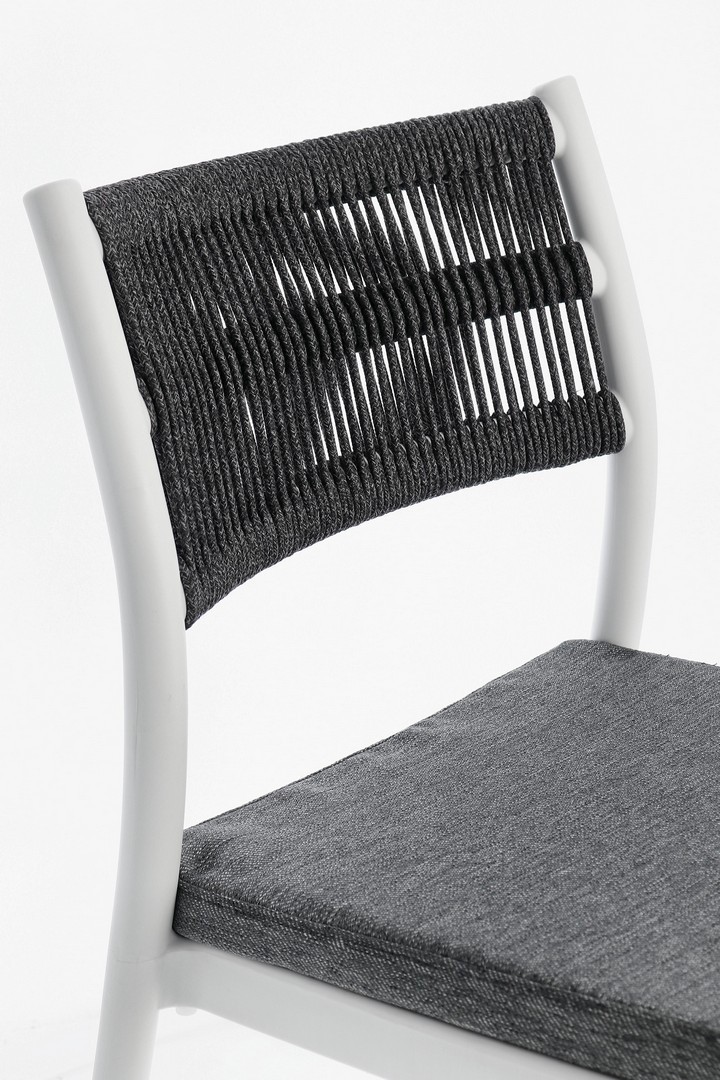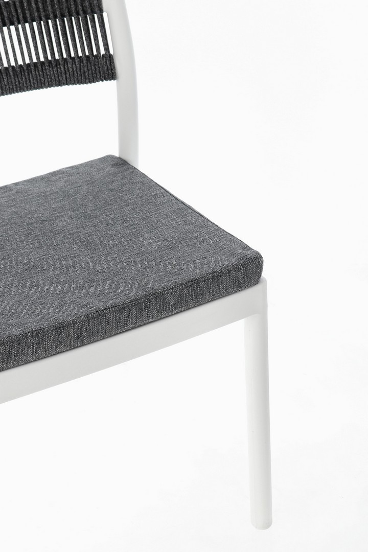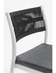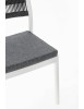 POLIPROPILENE (PP), RESISTENTE AI RAGGI UV. SCHIENALE CON INTRECCIO IN CORDA DI POLIESTERE. CUSCINO SEDUTA SFODERABILE CON TESSUTO IDROREPELLENTE POLIESTERE. IMPILABILE.