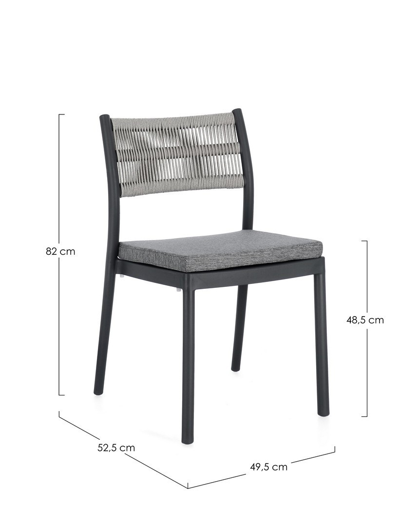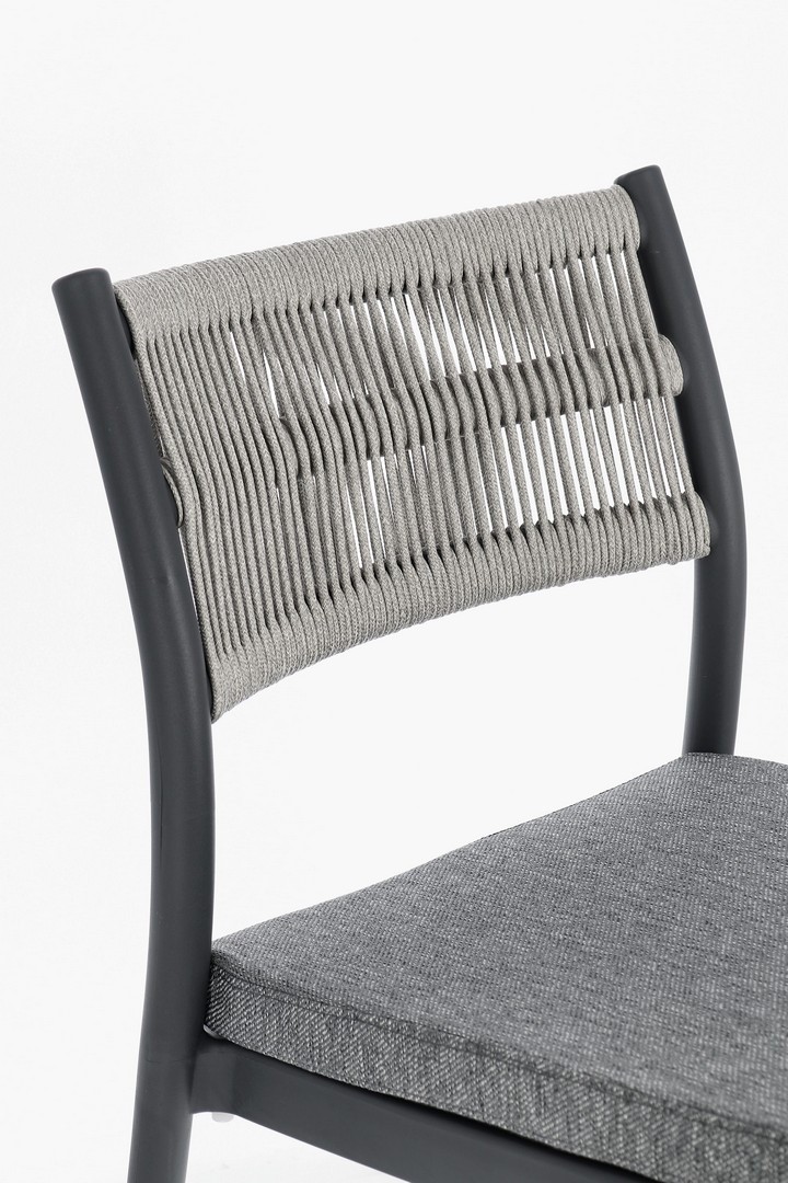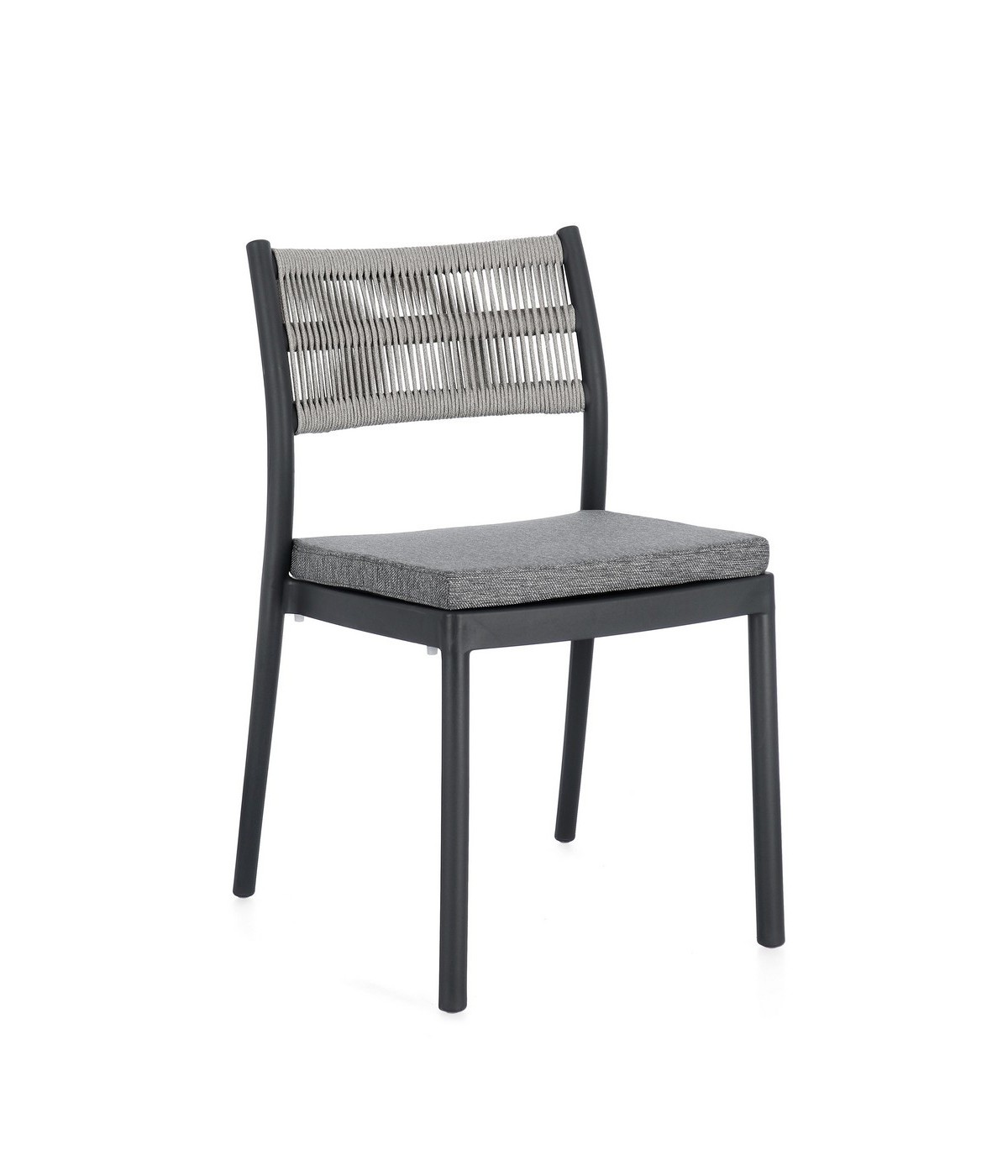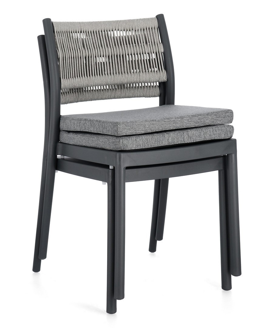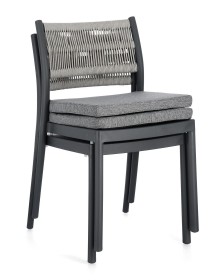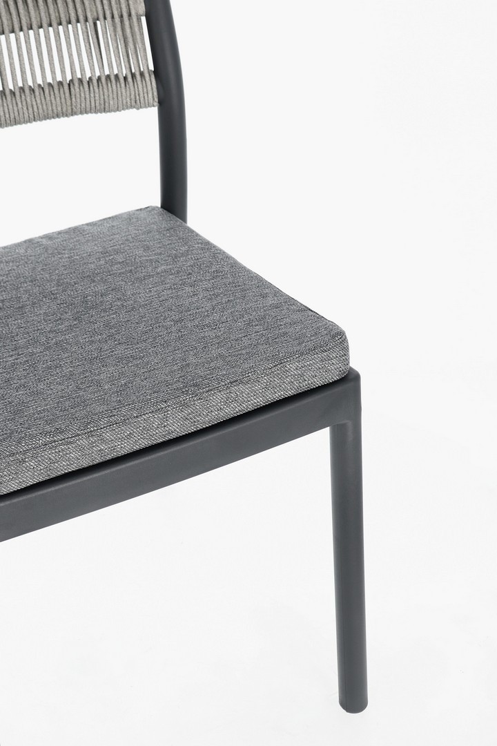 POLIPROPILENE (PP), RESISTENTE AI RAGGI UV. SCHIENALE CON INTRECCIO IN CORDA DI POLIESTERE. CUSCINO SEDUTA SFODERABILE CON TESSUTO IDROREPELLENTE POLIESTERE. IMPILABILE.