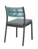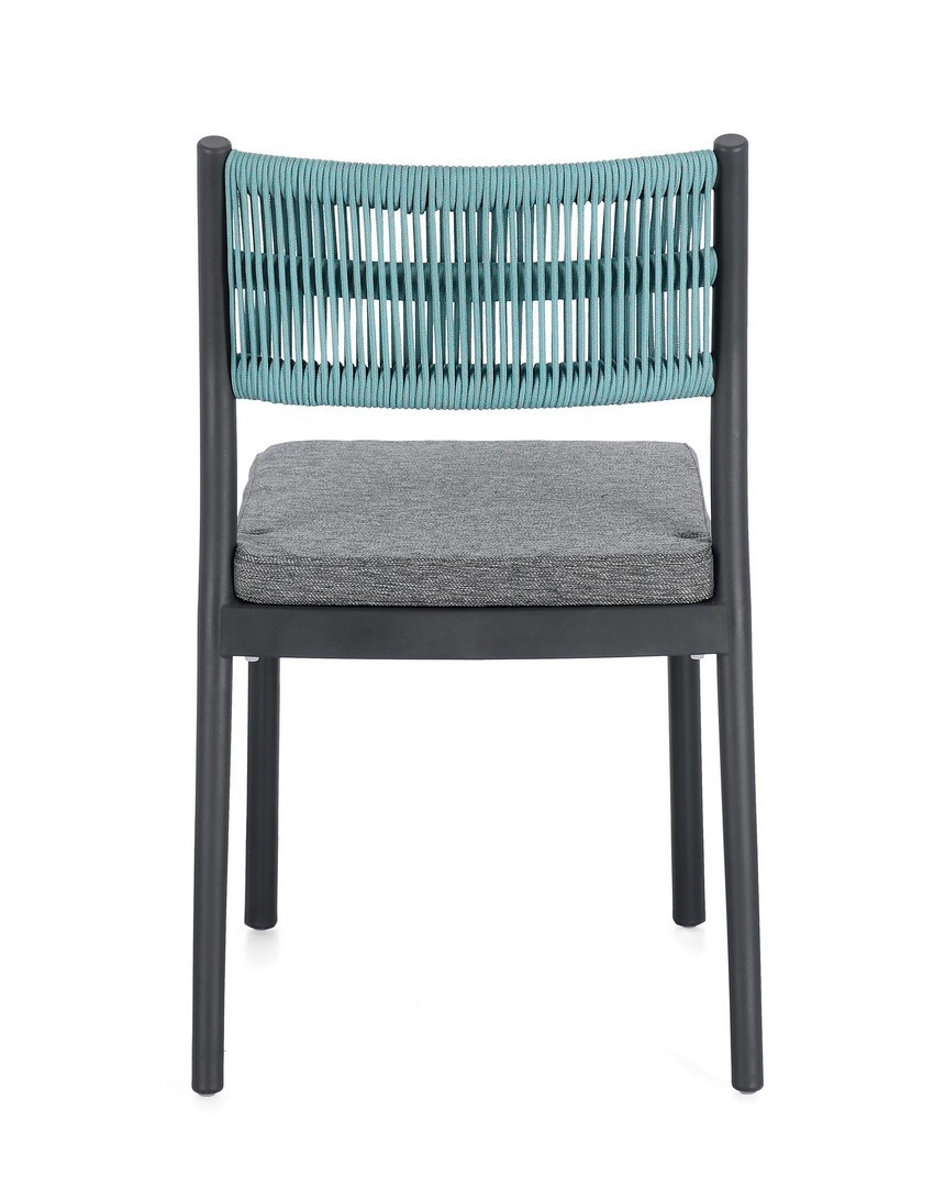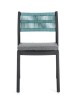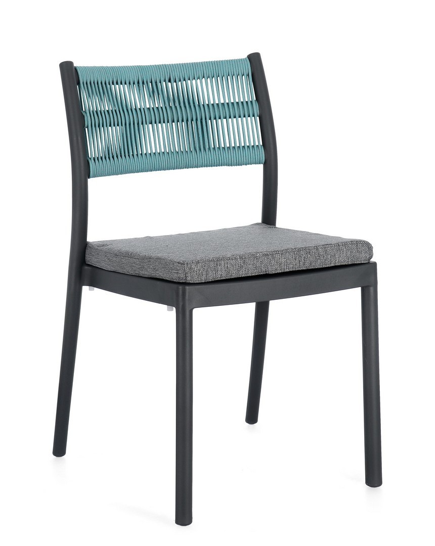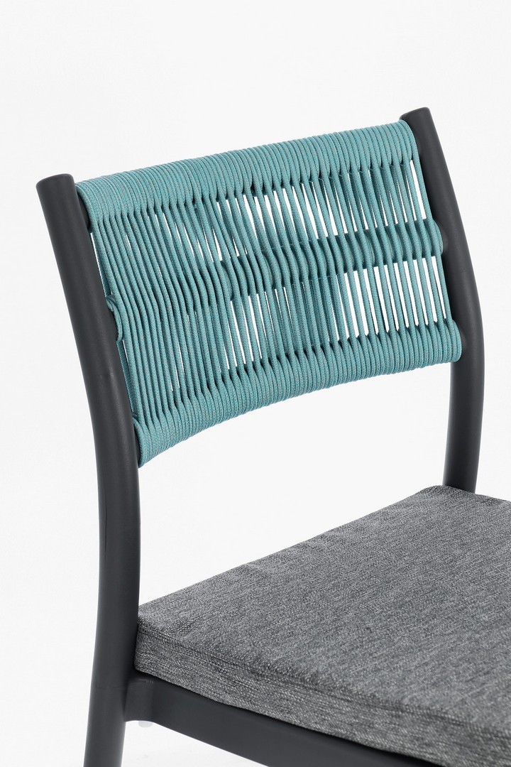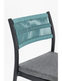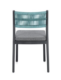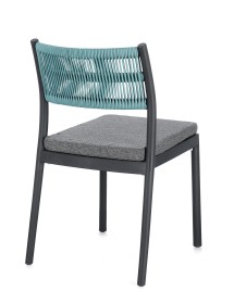POLIPROPILENE (PP), RESISTENTE AI RAGGI UV. SCHIENALE CON INTRECCIO IN CORDA DI POLIESTERE. CUSCINO SEDUTA SFODERABILE CON TESSUTO IDROREPELLENTE POLIESTERE. IMPILABILE.