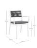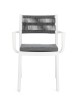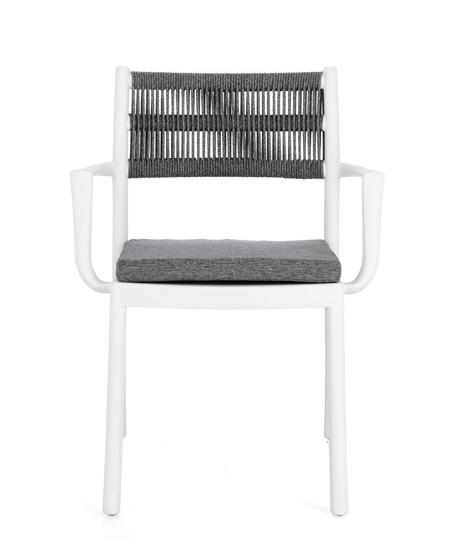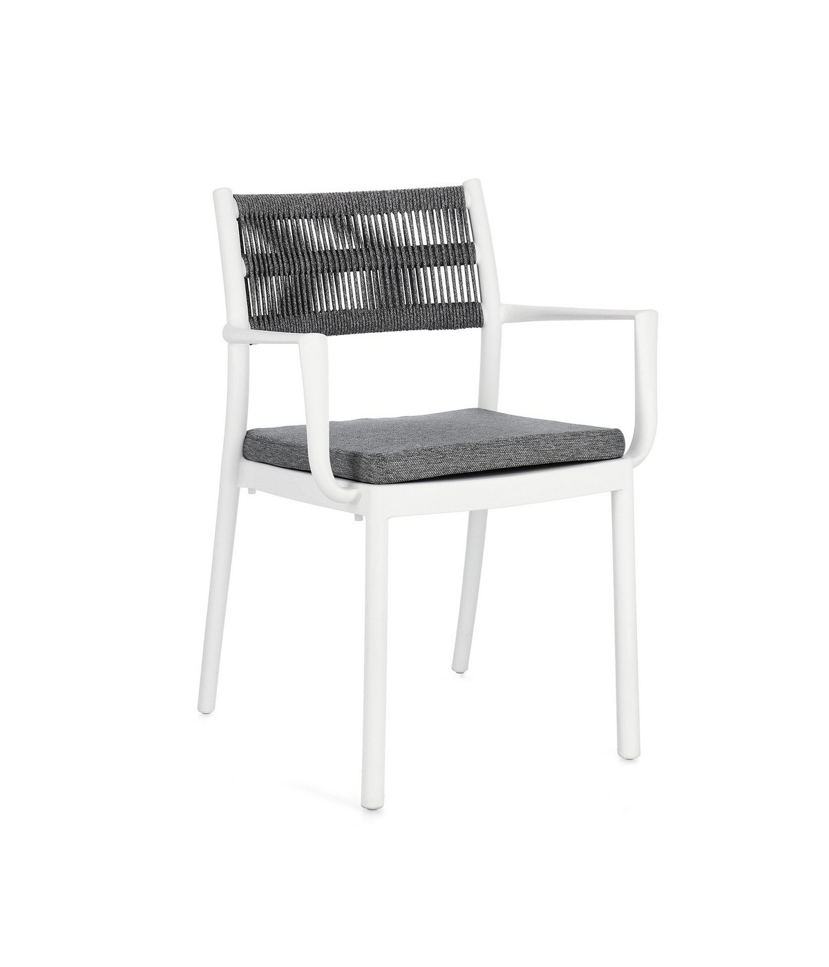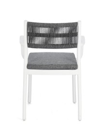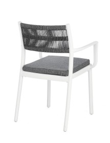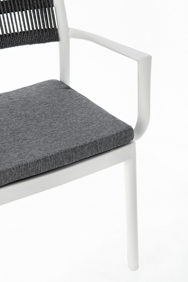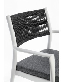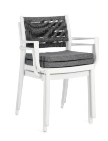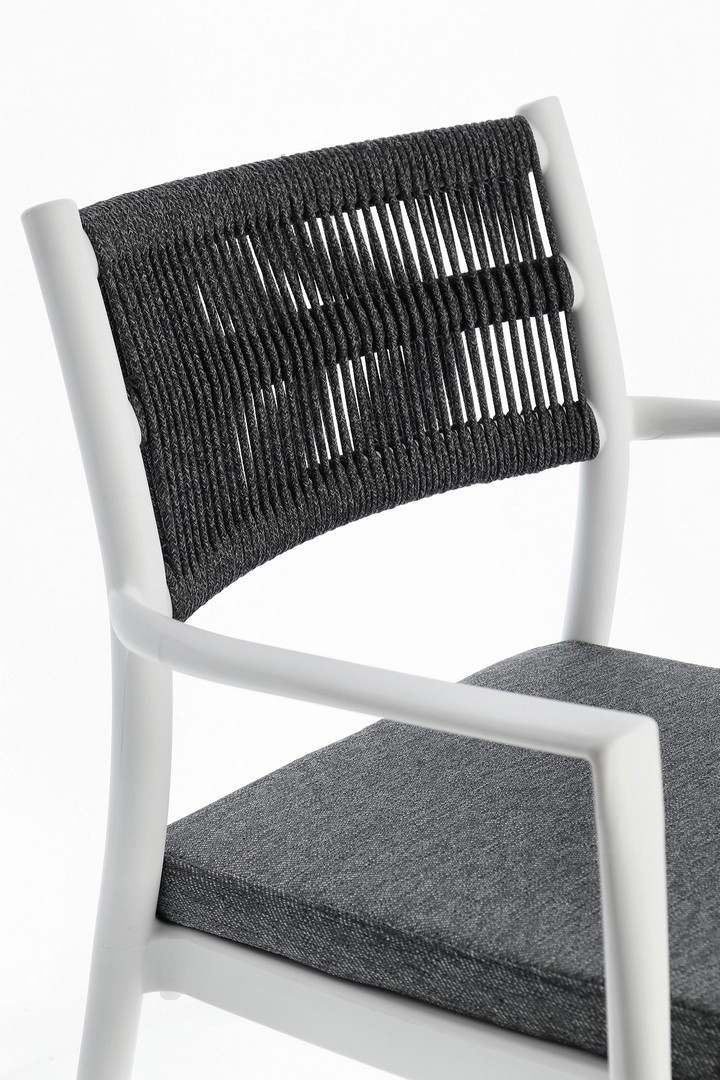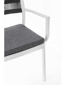 POLIPROPILENE (PP), RESISTENTE AI RAGGI UV. SCHIENALE CON INTRECCIO IN CORDA DI POLIESTERE. CUSCINO SEDUTA SFODERABILE CON TESSUTO IDROREPELLENTE POLIESTERE. IMPILABILE.