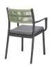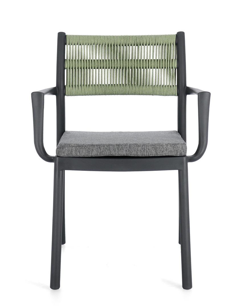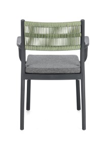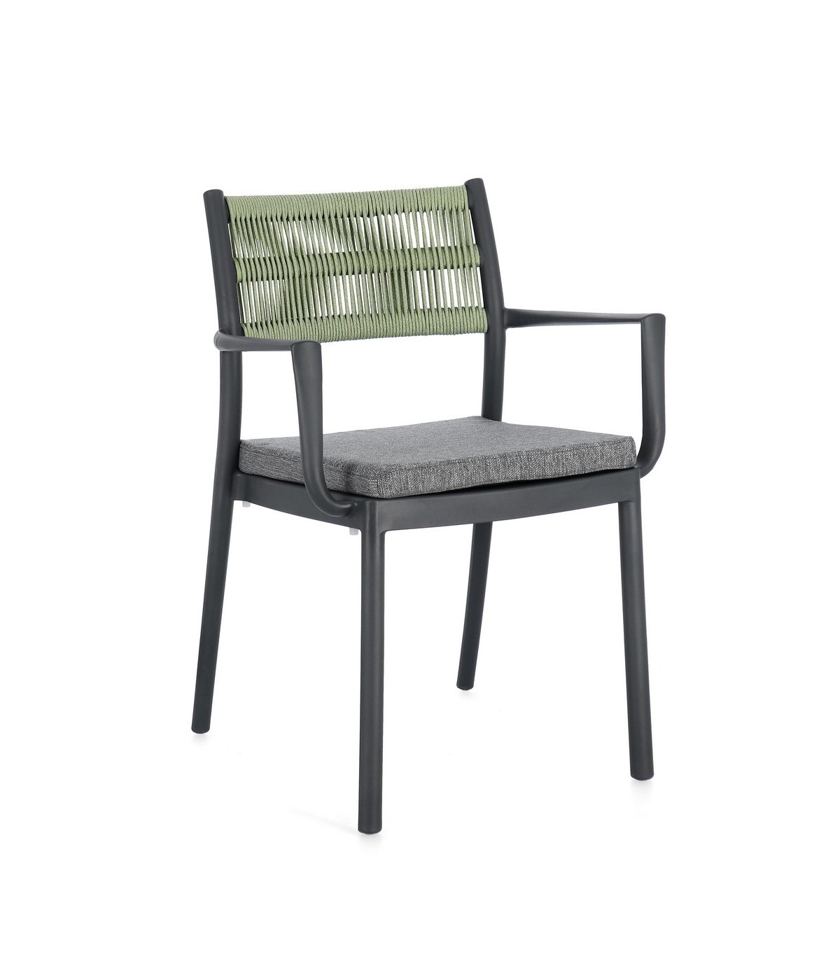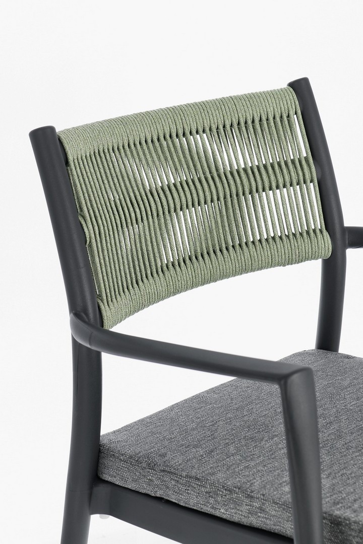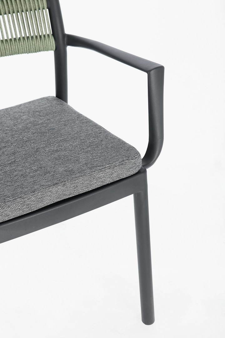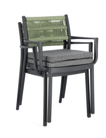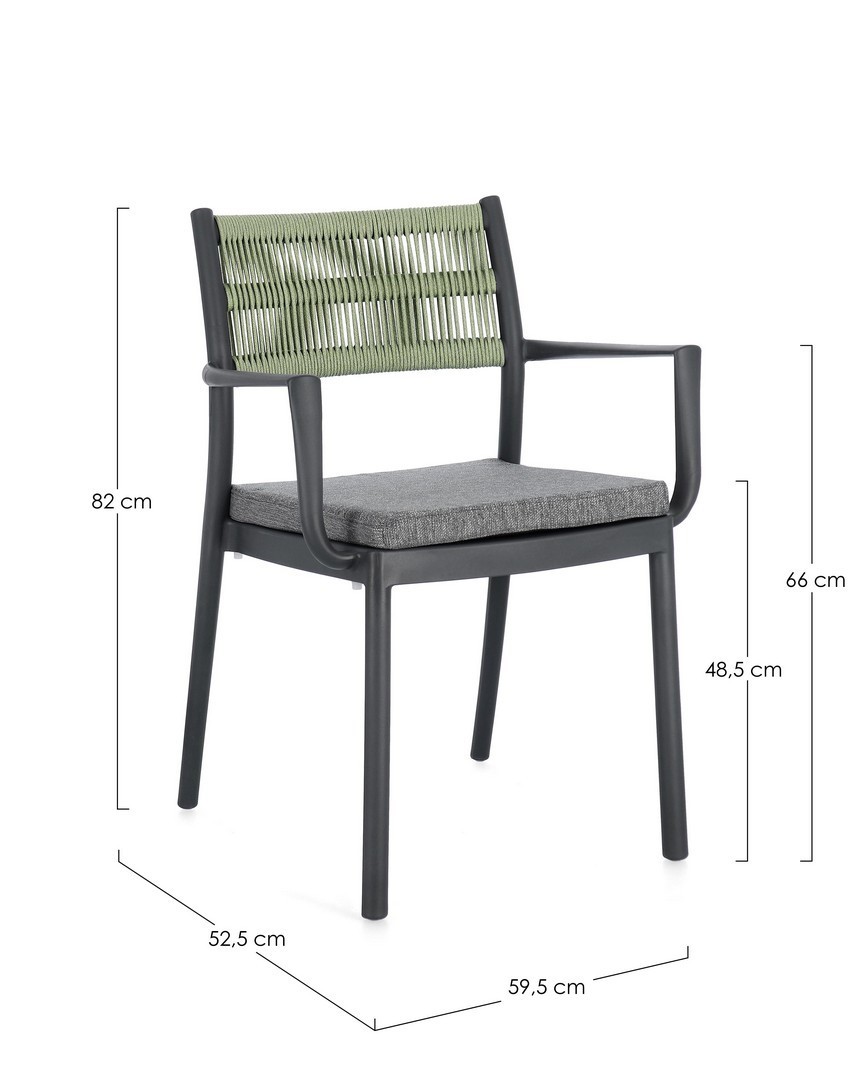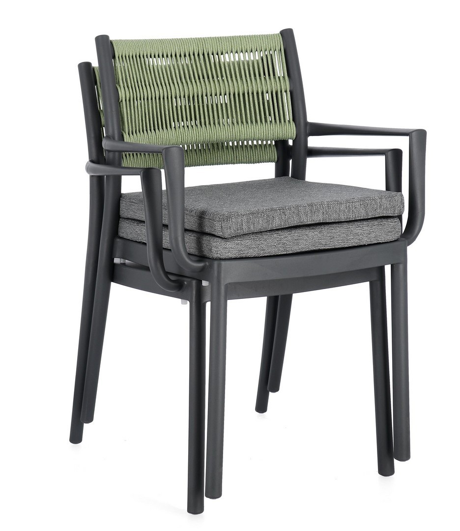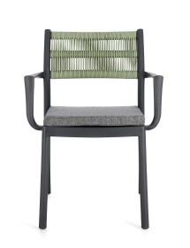 POLIPROPILENE (PP), RESISTENTE AI RAGGI UV. SCHIENALE CON INTRECCIO IN CORDA DI POLIESTERE. CUSCINO SEDUTA SFODERABILE CON TESSUTO IDROREPELLENTE POLIESTERE. IMPILABILE.