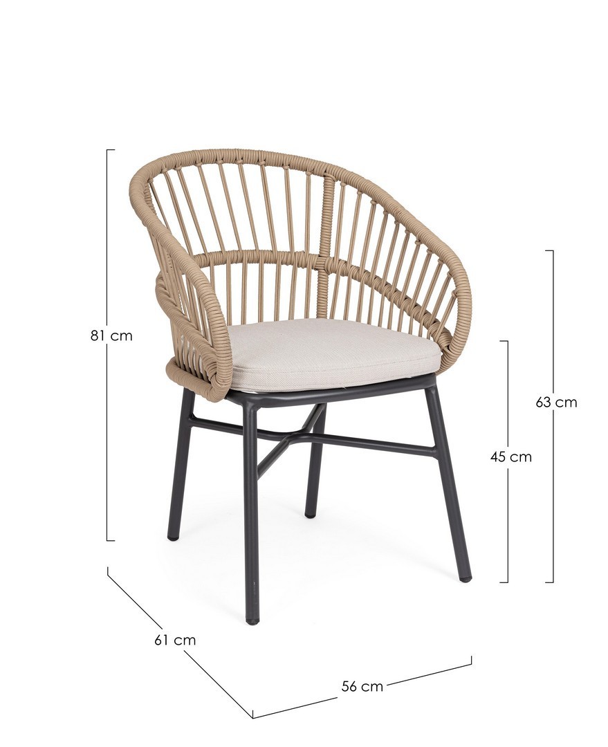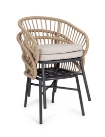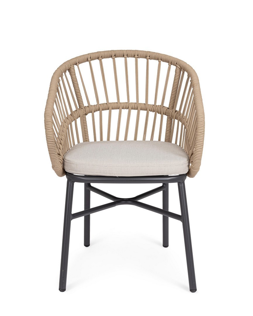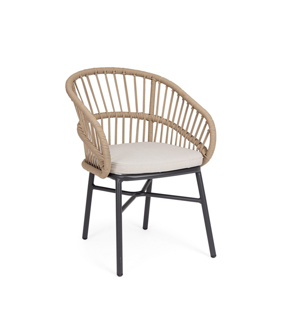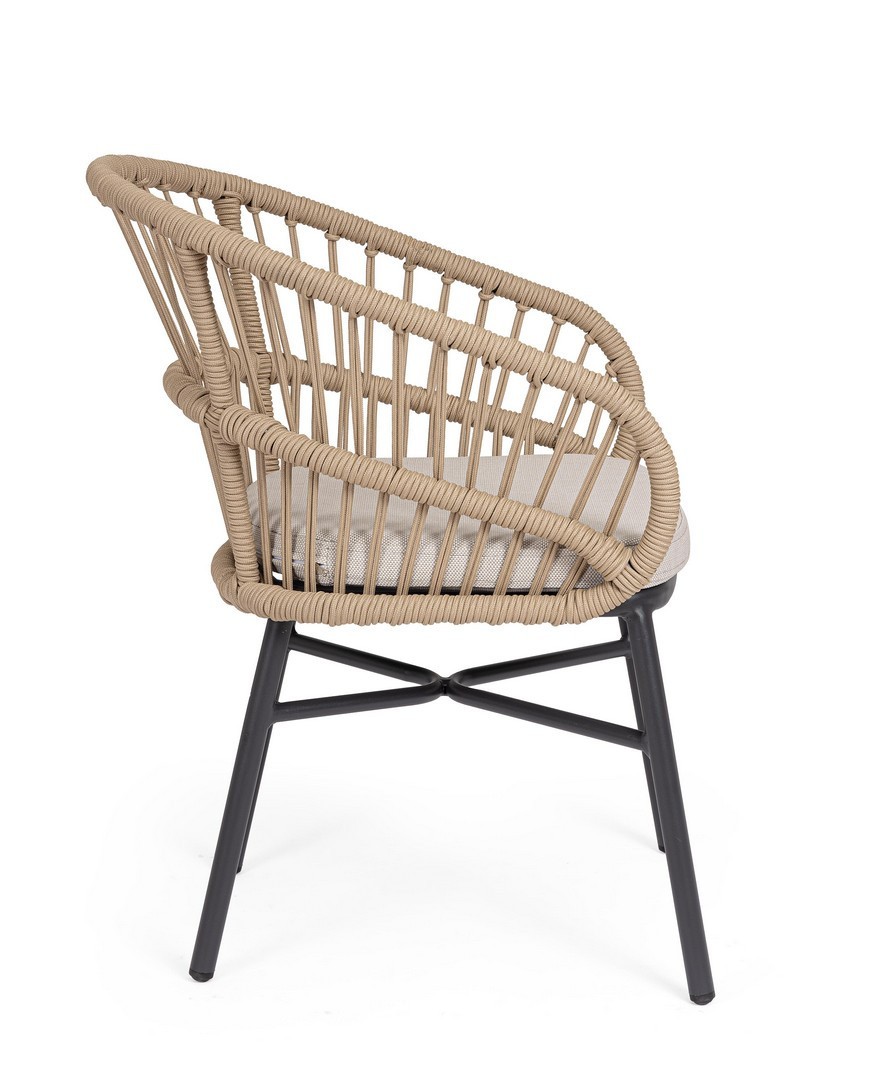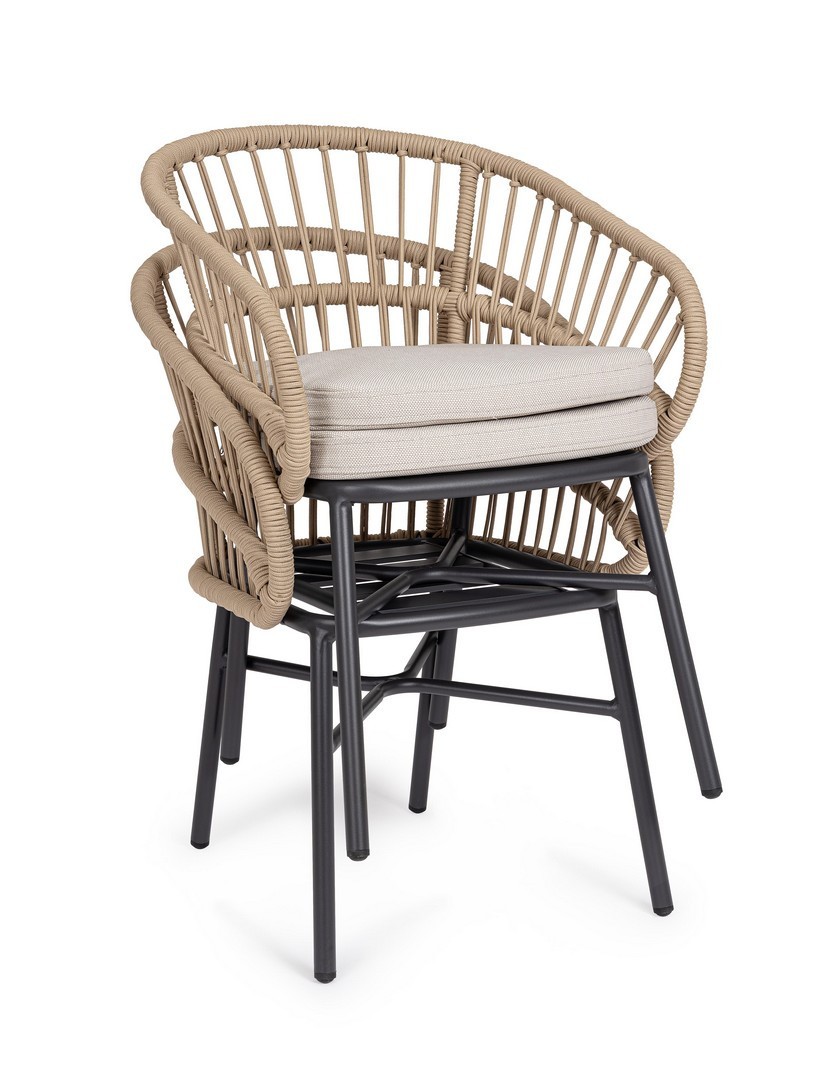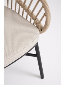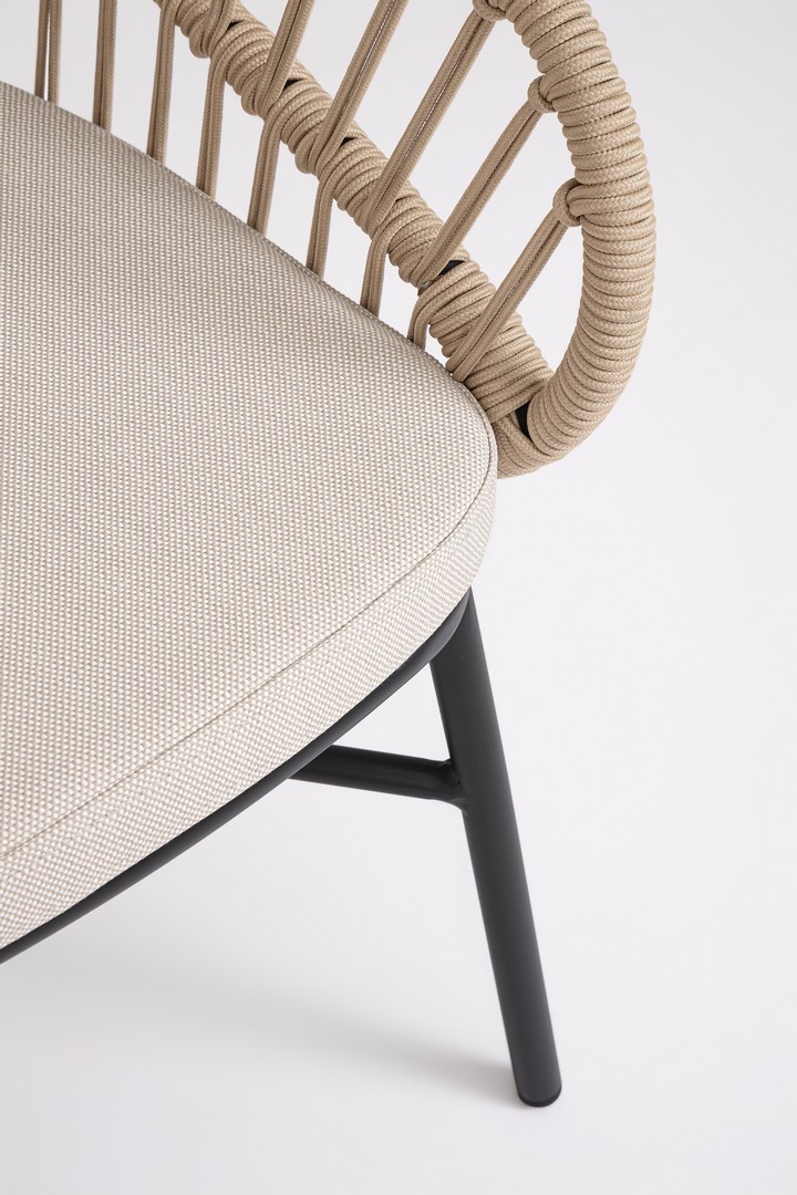 STRUTTURA IN ALLUMINIO VERNICIATA A POLVERE (POLIESTERE). INTRECCIO PER ESTERNO IN CORDA (POLIESTERE). CUSCINI SFODERABILI CON TESSUTO IDROREPELLENTE OLEFIN (100% POLIPROPILENE). IMPILABILE. IMBALLO SENZA CARTONE.