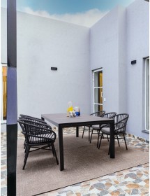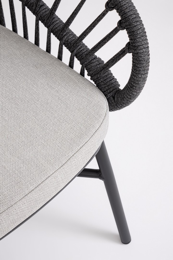 STRUTTURA IN ALLUMINIO VERNICIATA A POLVERE (POLIESTERE). INTRECCIO PER ESTERNO IN CORDA (POLIESTERE). CUSCINI SFODERABILI CON TESSUTO IDROREPELLENTE OLEFIN (100% POLIPROPILENE). IMPILABILE. IMBALLO SENZA CARTONE.