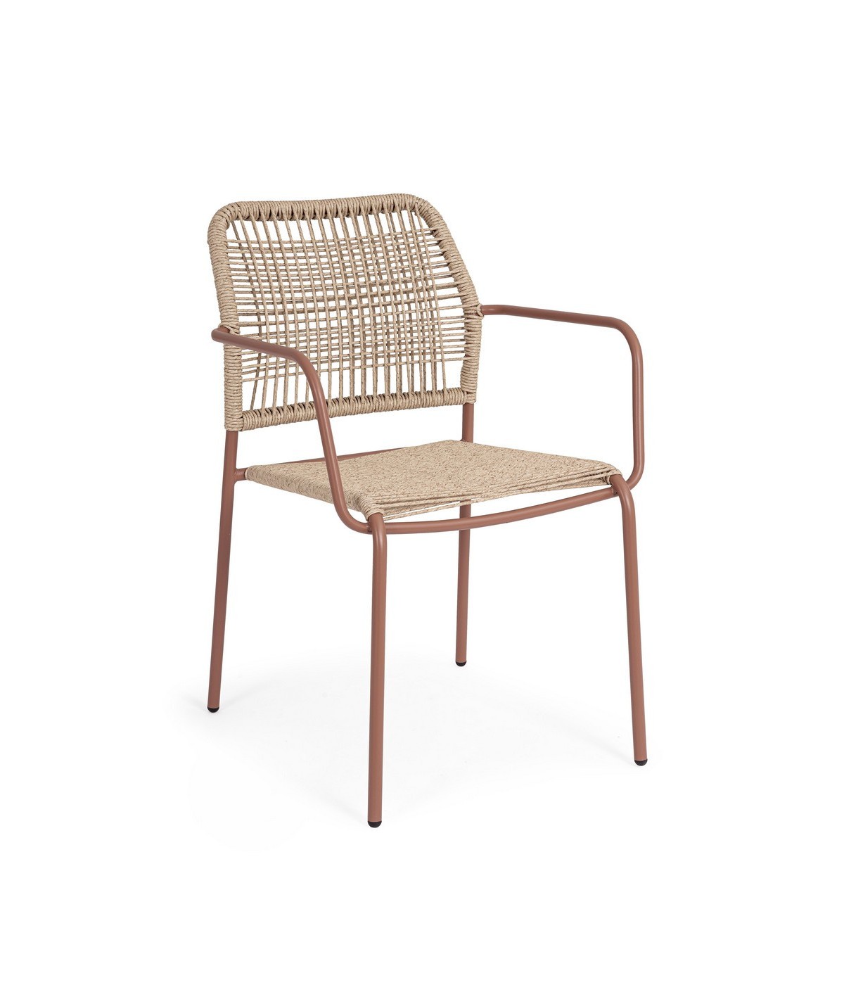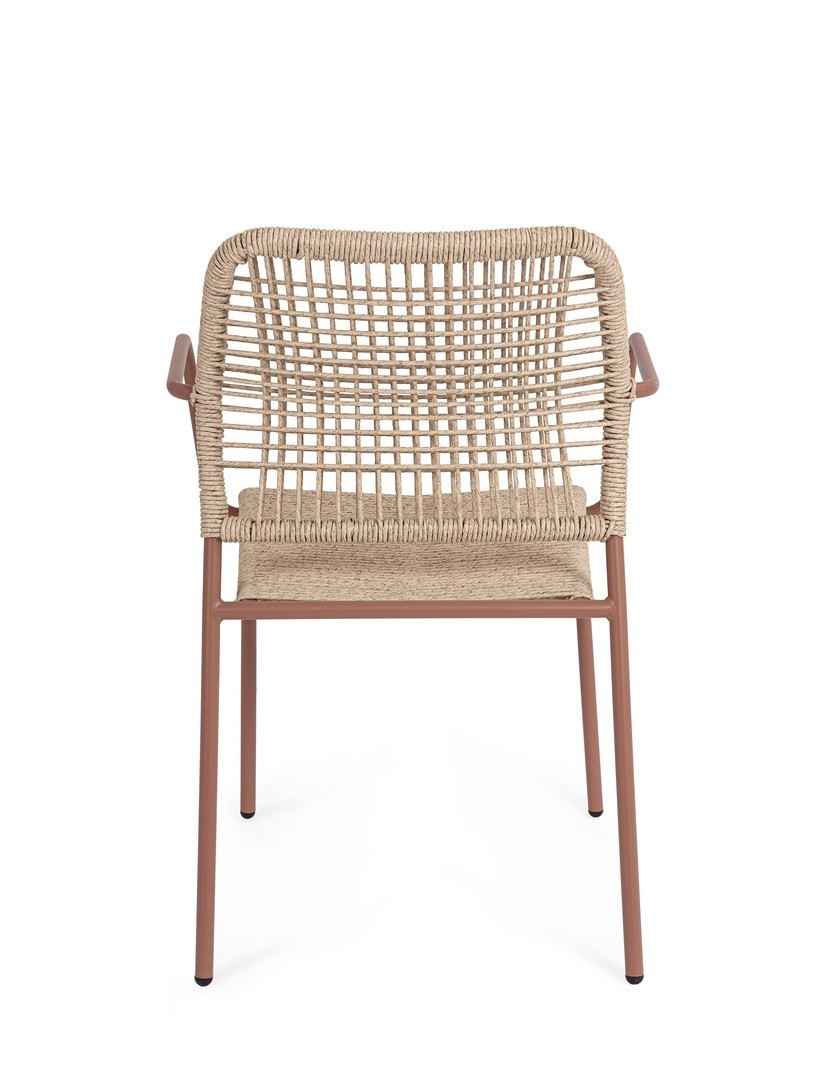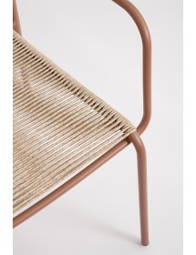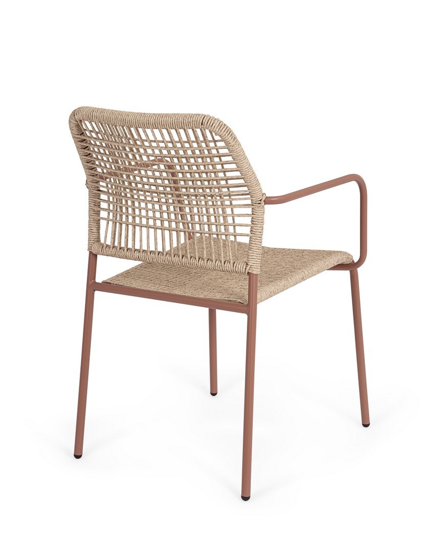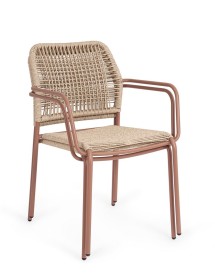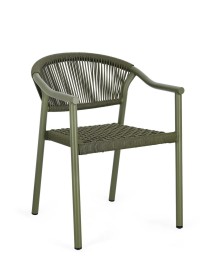 STRUTTURA IN ACCIAIO TRATTATO PER ESTERNO (E-COATING) E VERNICIATO A POLVERE (POLIESTERE). INTRECCIO IN FIBRA SINTETICA (TWISTED). IMPILABILE. IMBALLO SENZA CARTONE.