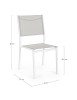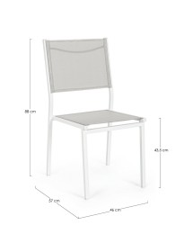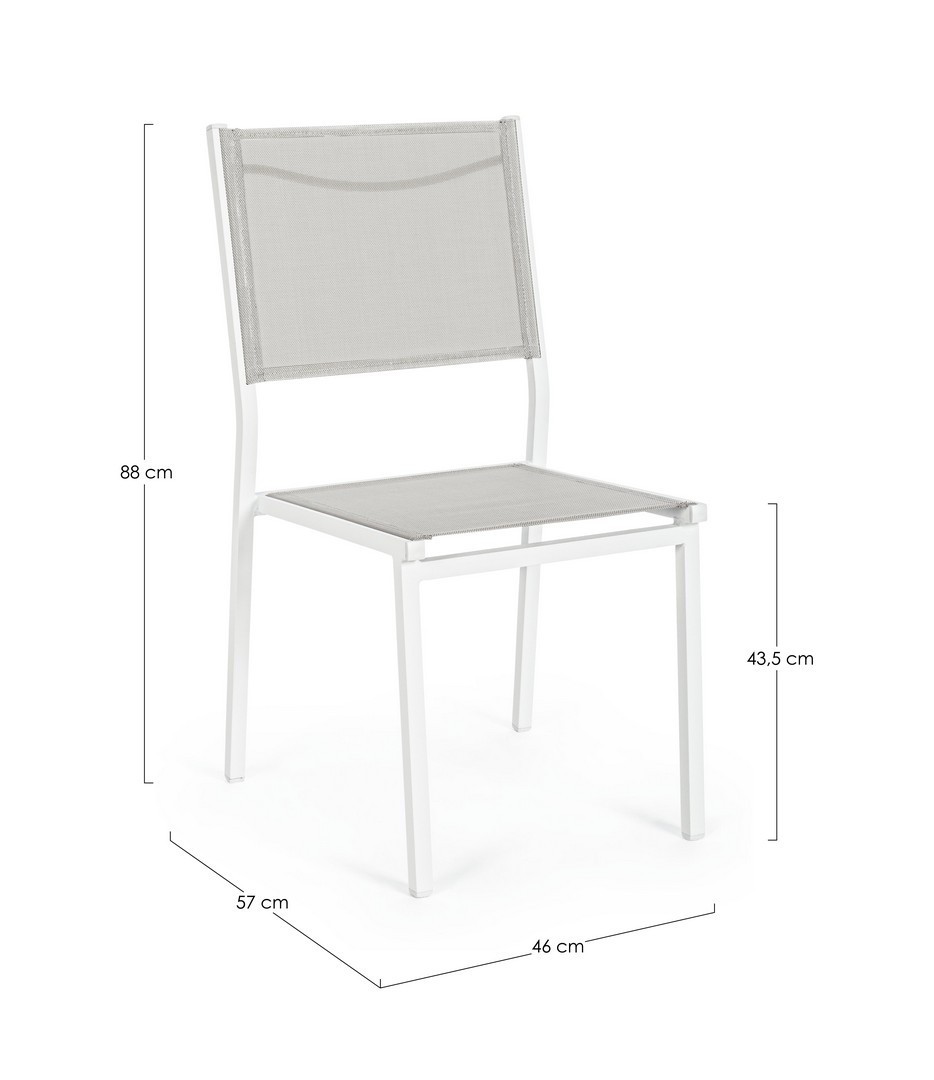 STRUTTURA IN ALLUMINIO, VERNICIATO A POLVERE (POLIESTERE). SEDUTA E SCHIENALE IN TEXTILENE 2X1. IMPILABILE. IMBALLO SENZA CARTONE.