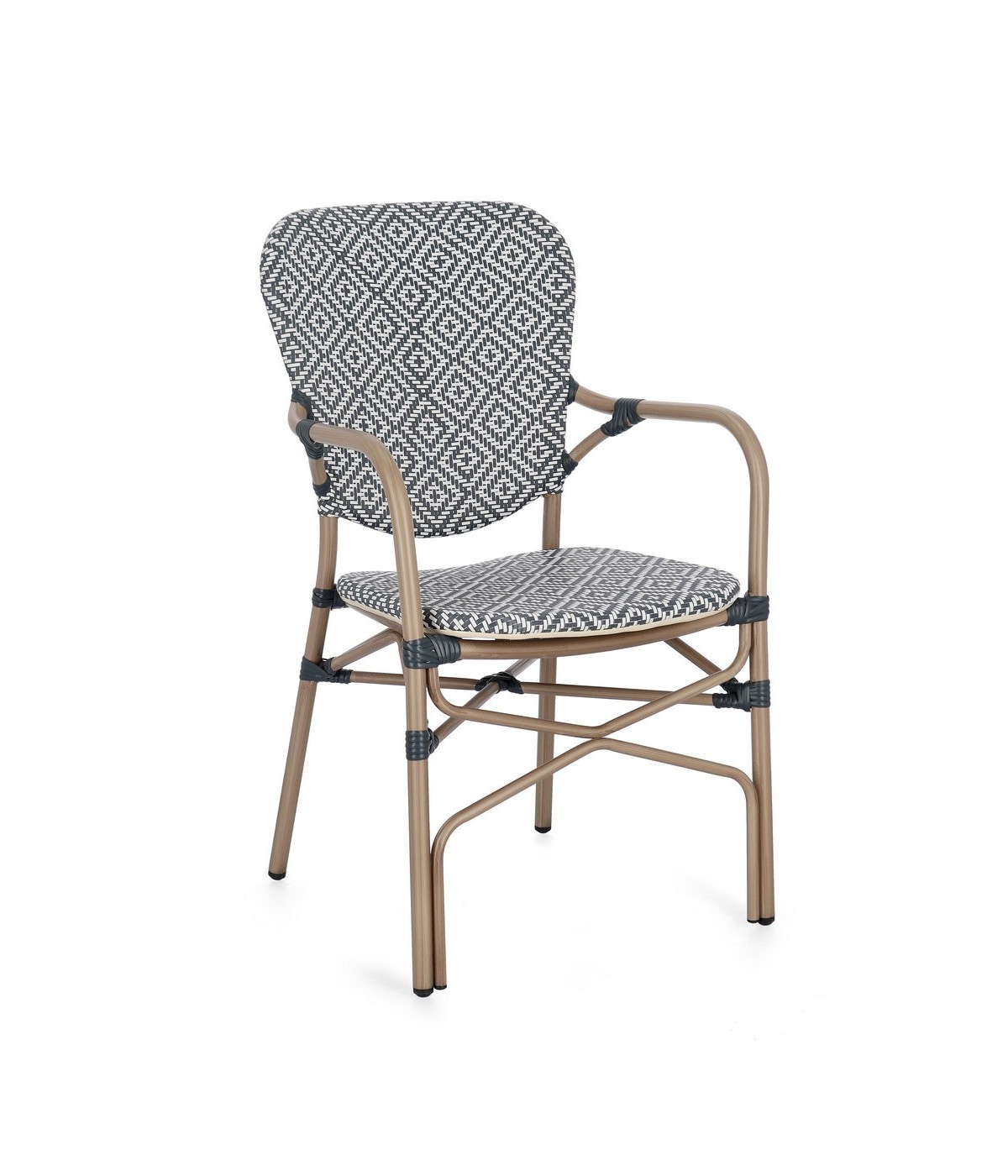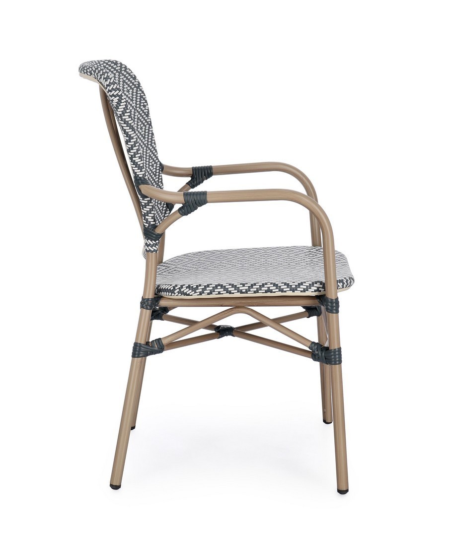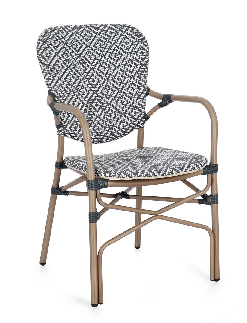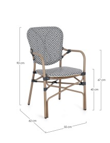 STRUTTURA IN ALLUMINIO VERNICIATA A POLVERE (POLIESTERE), EFFETTO NATURALE. SEDUTA E SCHIENALE IN TEXTILENE. IMPILABILE. IMBALLO SENZA CARTONE.