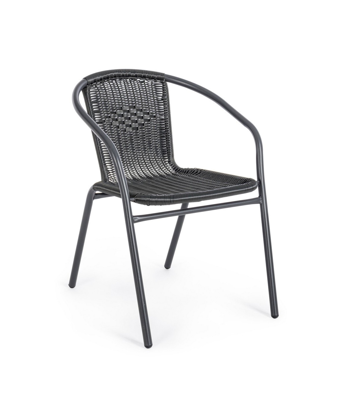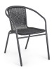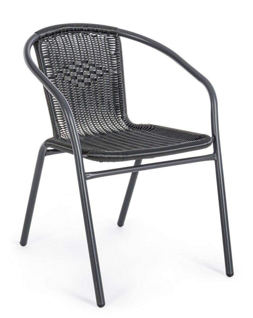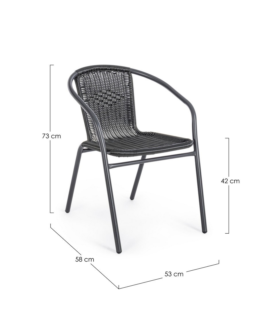 STRUTTURA IN ACCIAIO, TRATTATA PER L'ESTERNO TRAMITE SABBIATURA E VERNICIATA A POLVERE EPOSSIDICA, INTRECCIO IN FIBRA SINTETICA. IMPILABILE. IMBALLO SENZA CARTONE.