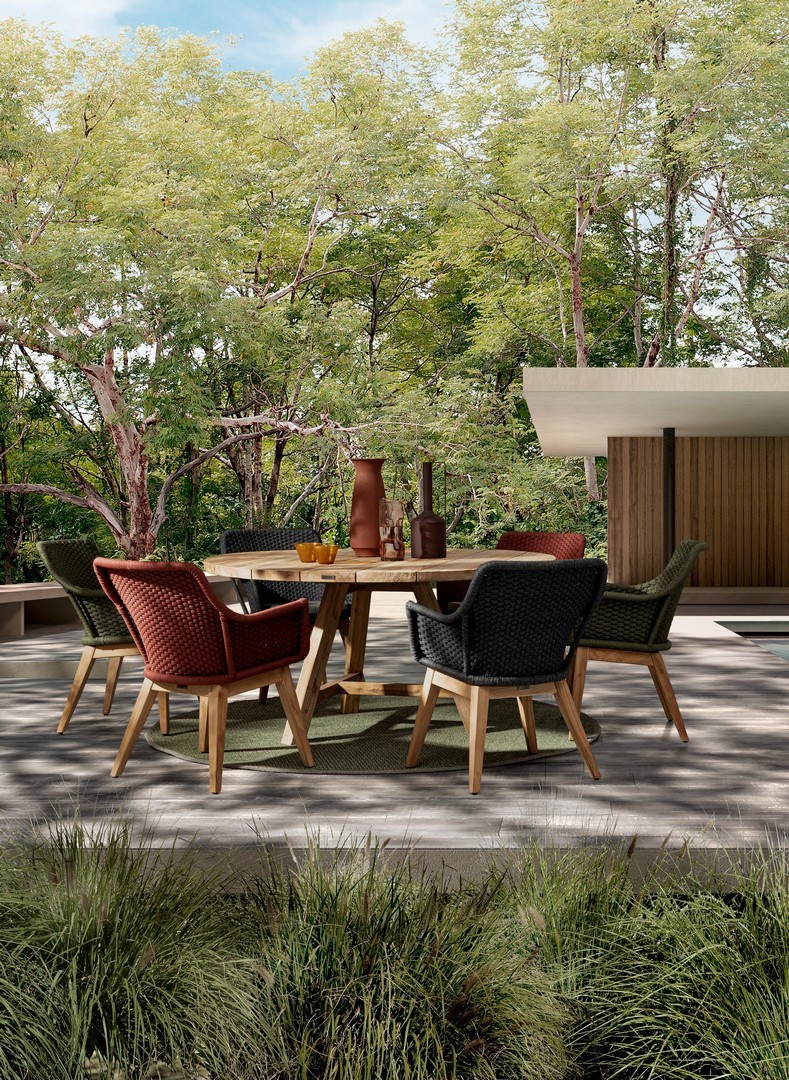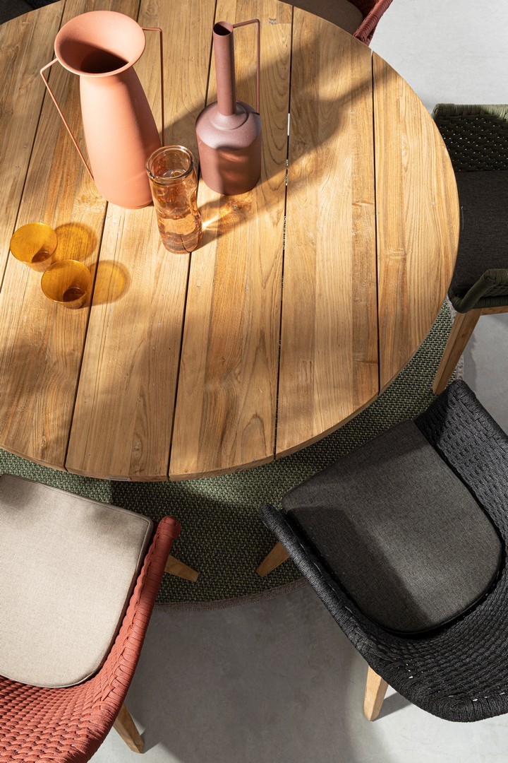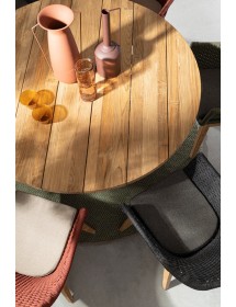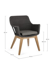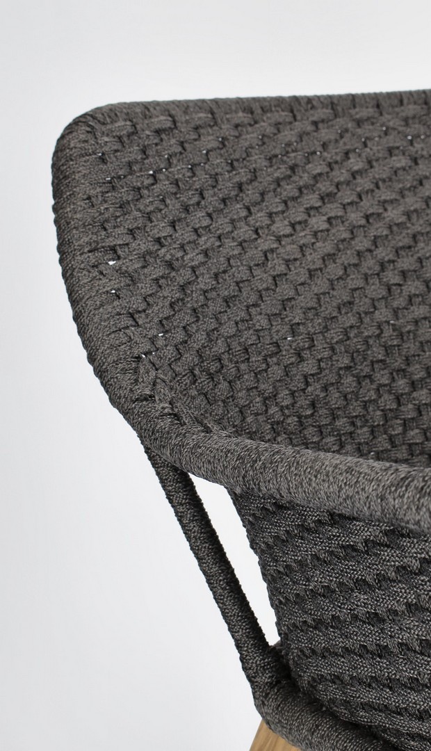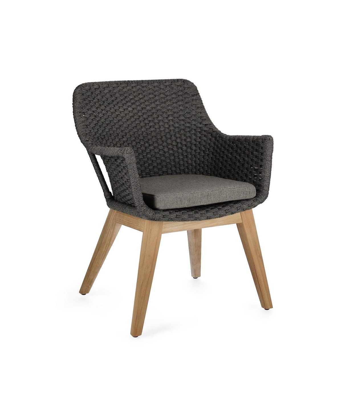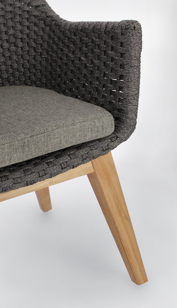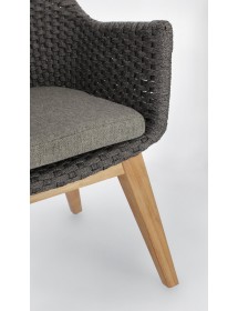 SEDUTA CON STRUTTURA IN ALLUMINIO VERNICIATA A POLVERE (POLIESTERE). INTRECCIO IN CORDA OLEFIN (100% POLIPROPILENE). CUSCINO SEDUTA SFODERABILE IN TESSUTO SUNPROOF OLEFIN (100% POLIPROPILENE). GAMBE IN TEAK - SVLK (LEGNO CERTIFICATO PROVENIENTE DA FORESTE SOSTENIBILI). VITERIA IN ACCIAIO GALVANIZZATO. GAMBE DA ASSEMBLARE.