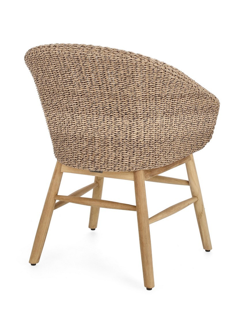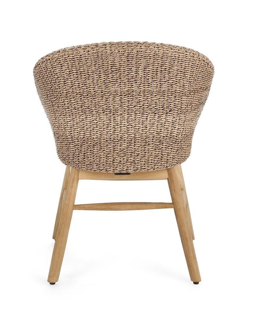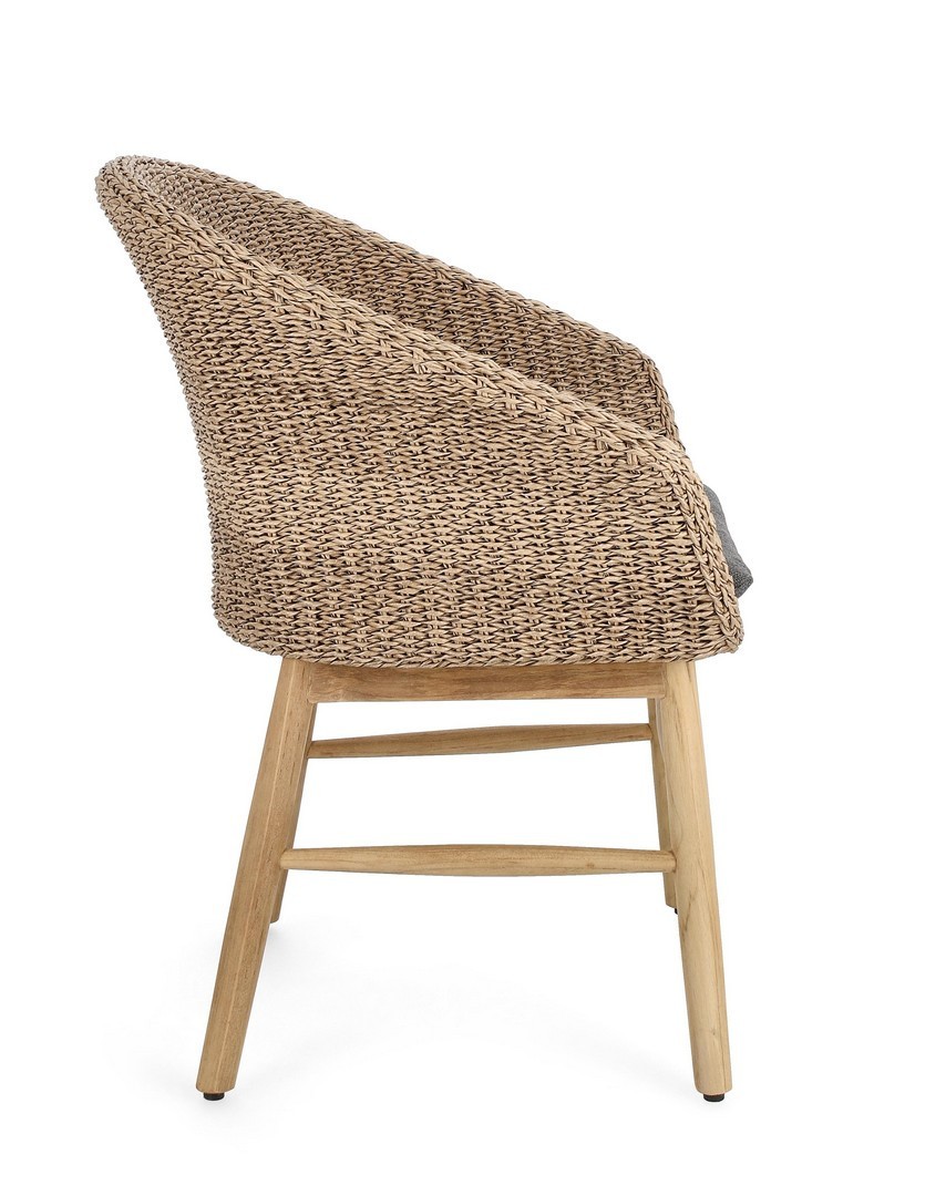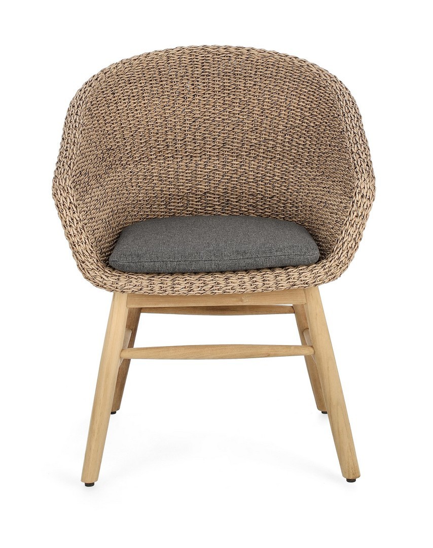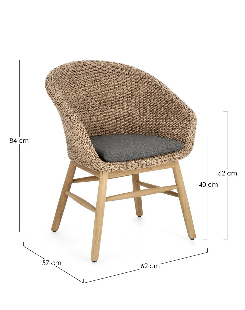 SEDUTA CON STRUTTURA IN ALLUMINIO VERNICIATA A POLVERE (POLIESTERE). INTRECCIO IN FIBRA SINTETICA EFFETTO ABACA. CUSCINO SEDUTA SFODERABILE IN TESSUTO IDROREPELLENTE SUNPROOF OLEFIN (100% POLIPROPILENE). GAMBE IN TEAK - SVLK (LEGNO CERTIFICATO PROVENIENTE DA FORESTE SOSTENIBILI). VITERIA IN ACCIAIO GALVANIZZATO. GAMBE DA ASSEMBLARE. ATTENZIONE: PRIMA DI PROCEDERE AL MONTAGGIO, ASSICURARSI CHE LA NUMERAZIONE SEDUTA-GAMBE COINCIDA.