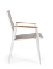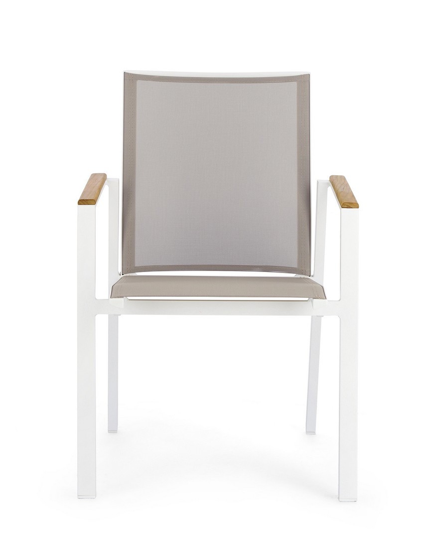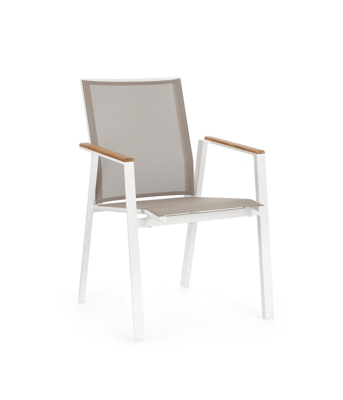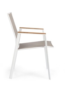 STRUTTURA IN ALLUMINIO, VERNICIATO A POLVERE (POLIESTERE). BRACCIOLI CON INSERTI IN TEAK. SEDUTA E SCHIENALE RIVESTITI IN TEXTILENE PHIFER 1X1. IMPILABILE. IMBALLO SENZA CARTONE.