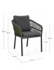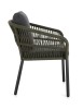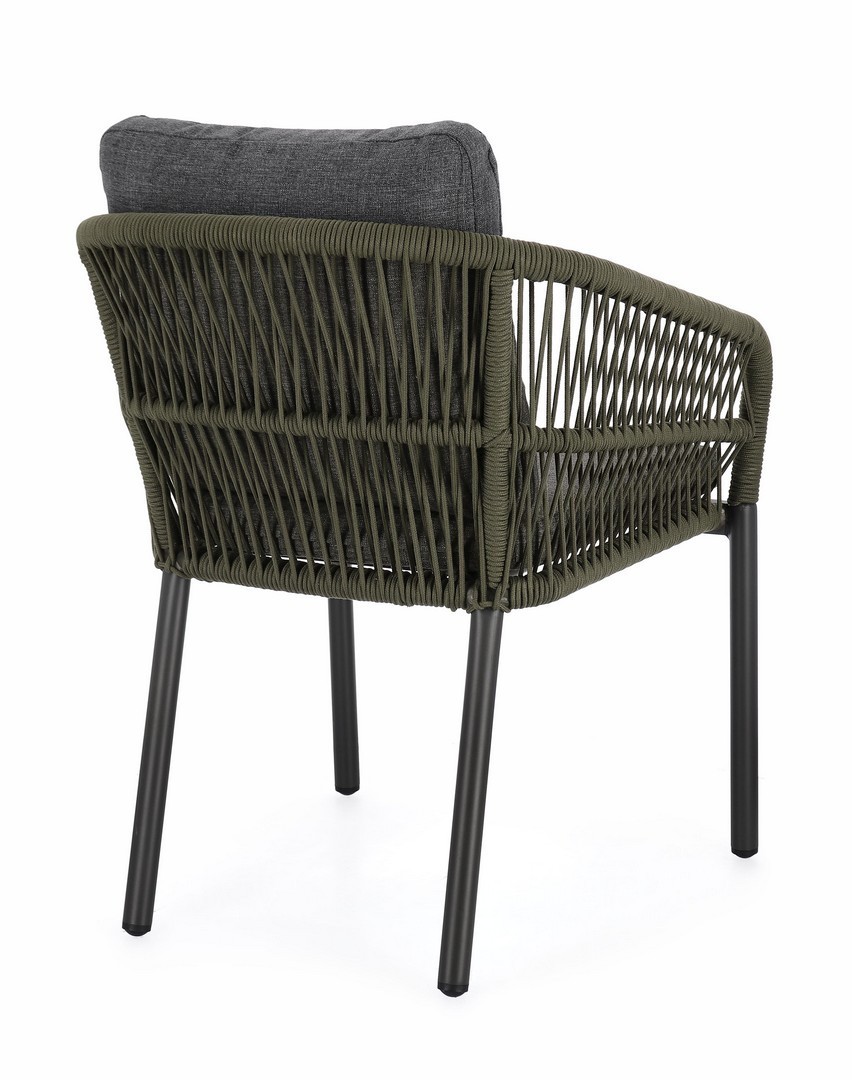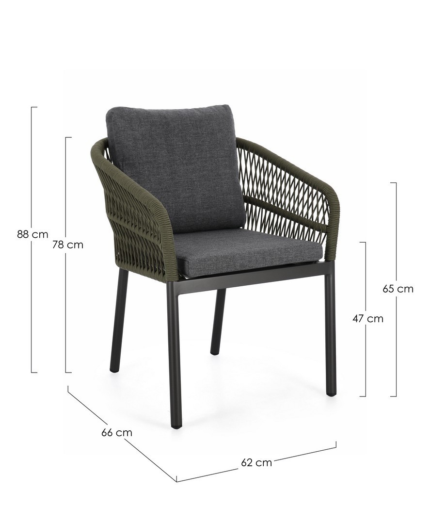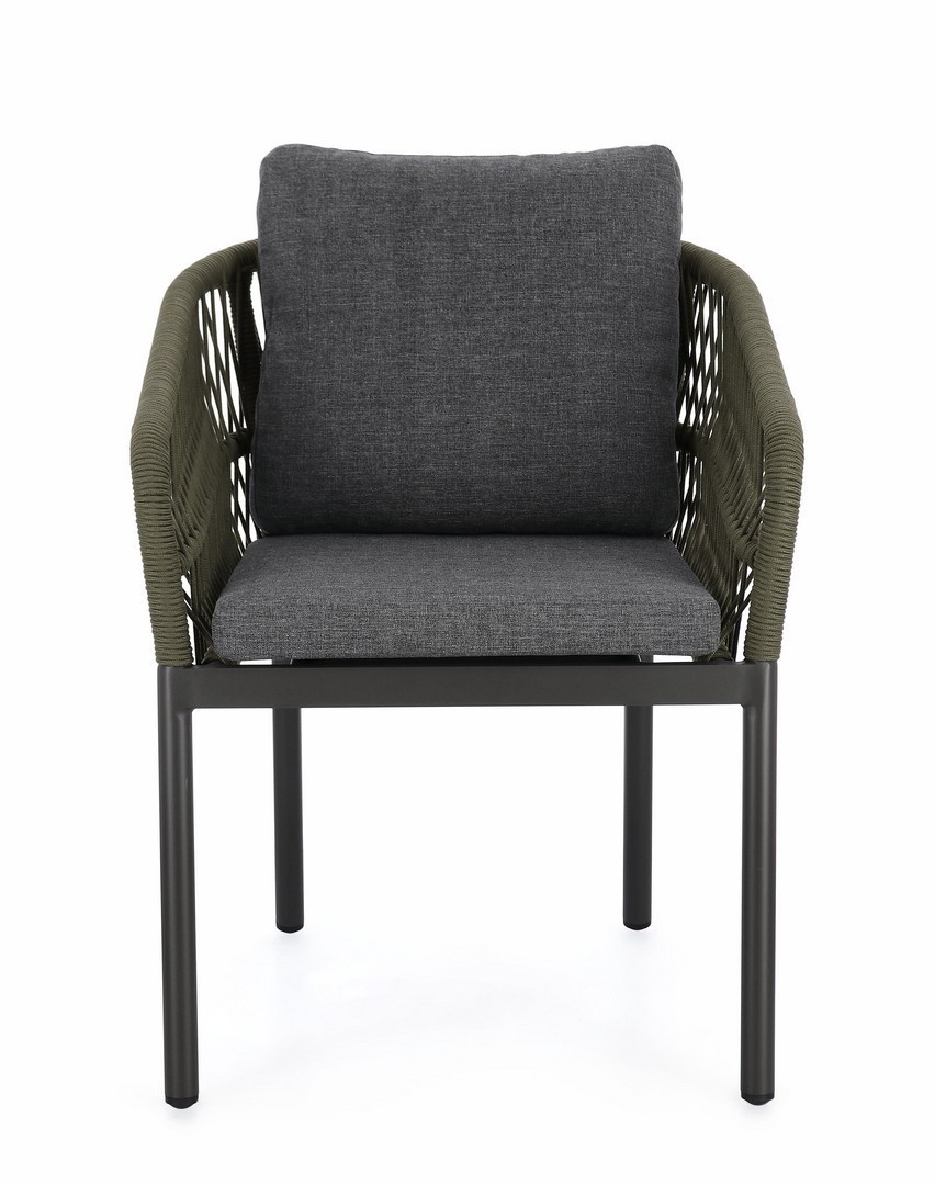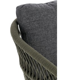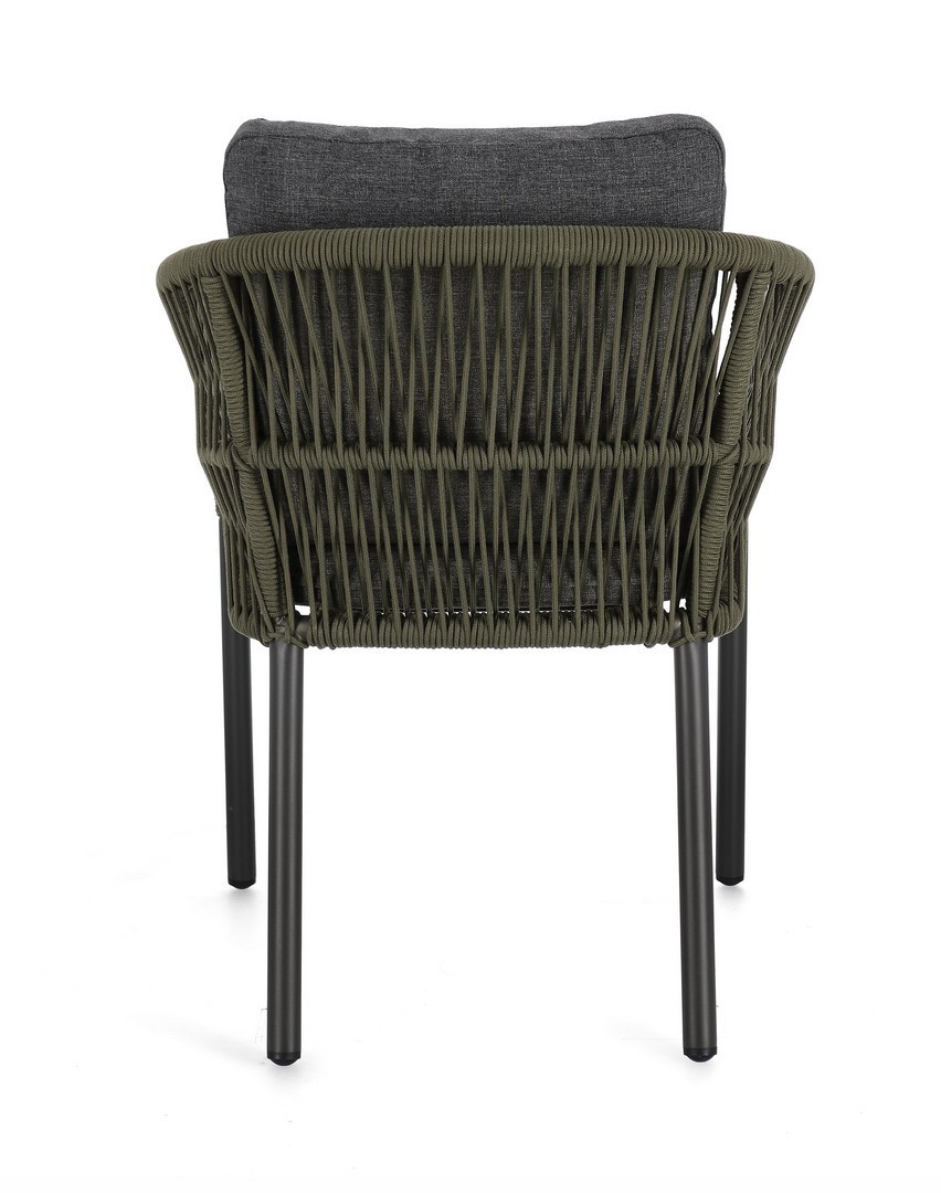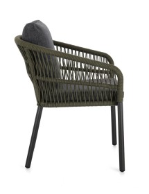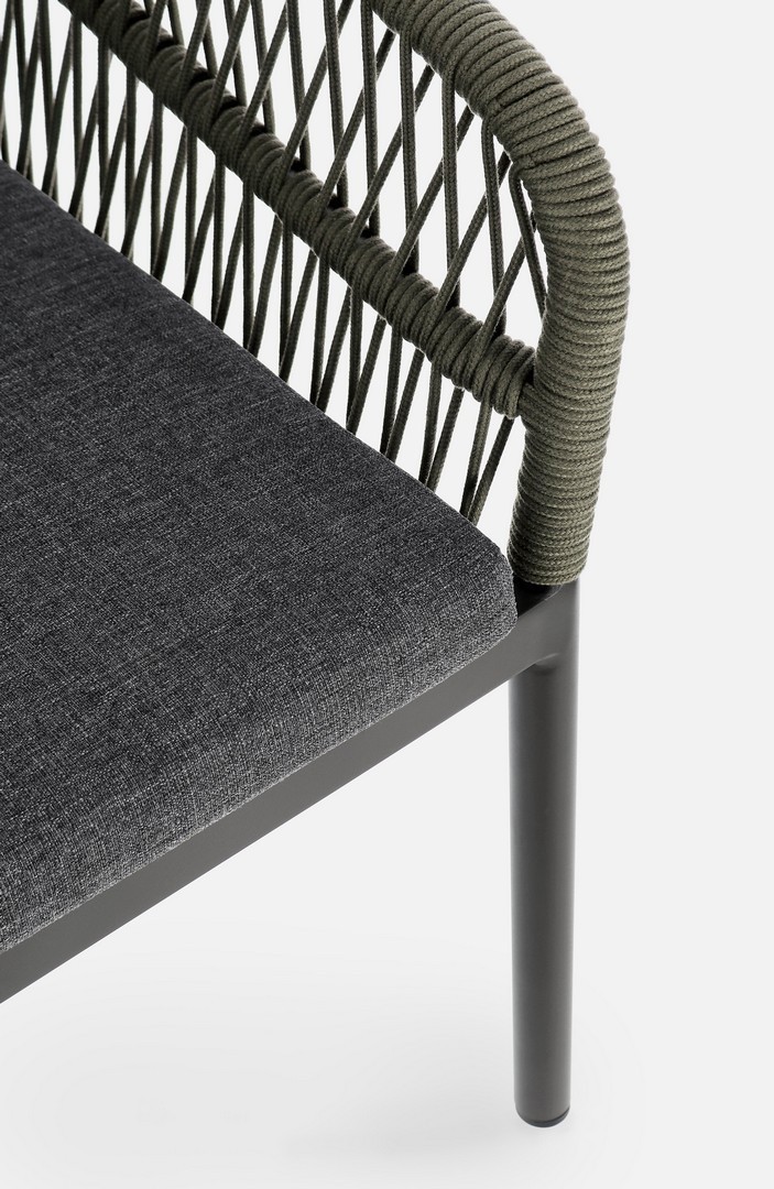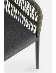 STRUTTURA IN ALLUMINIO VERNICIATA A POLVERE (POLIESTERE). INTRECCIO PER ESTERNO IN CORDA OLEFIN (POLIPROPILENE). CUSCINI SFODERABILI IN TESSUTO IDROREPELLENTE 100% POLIPROPILENE. IMPILABILE.