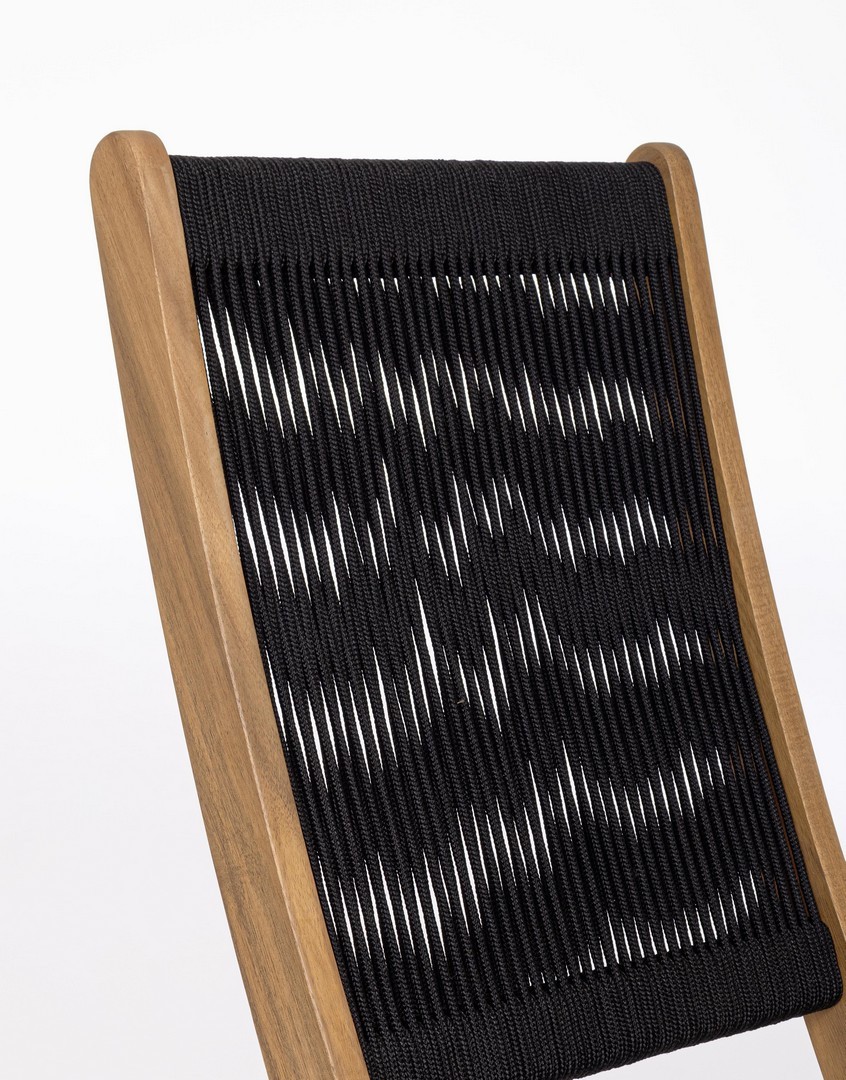 La finitura a olio effetto teak valorizza le venature del legno, donandole calore e un aspetto raffinato, mentre lo schienale con intreccio in corda di polipropilene aggiunge un dettaglio decorativo ricercato, migliorandone al tempo stesso il comfort e la funzionalità.