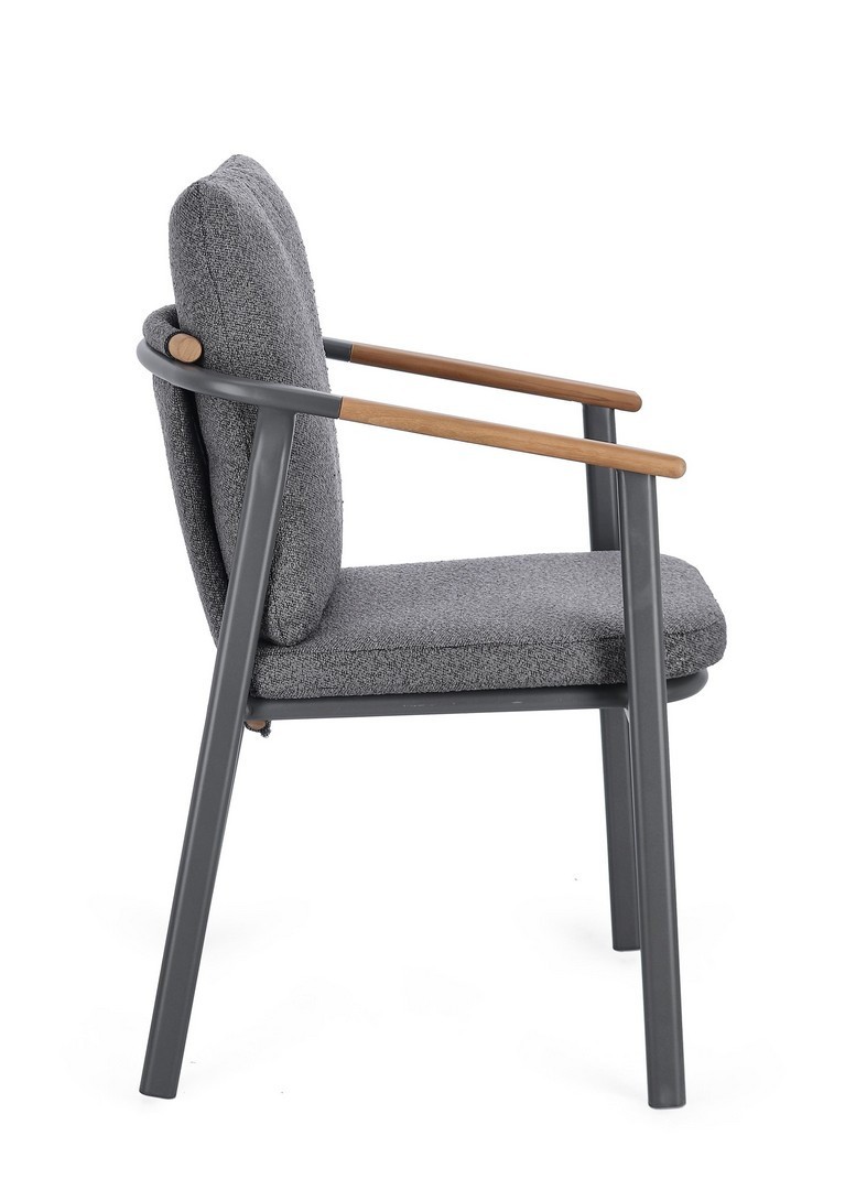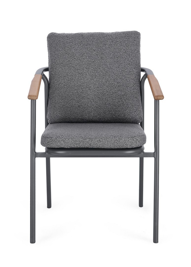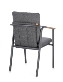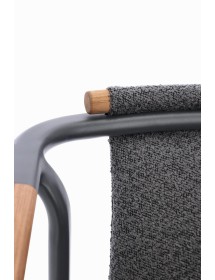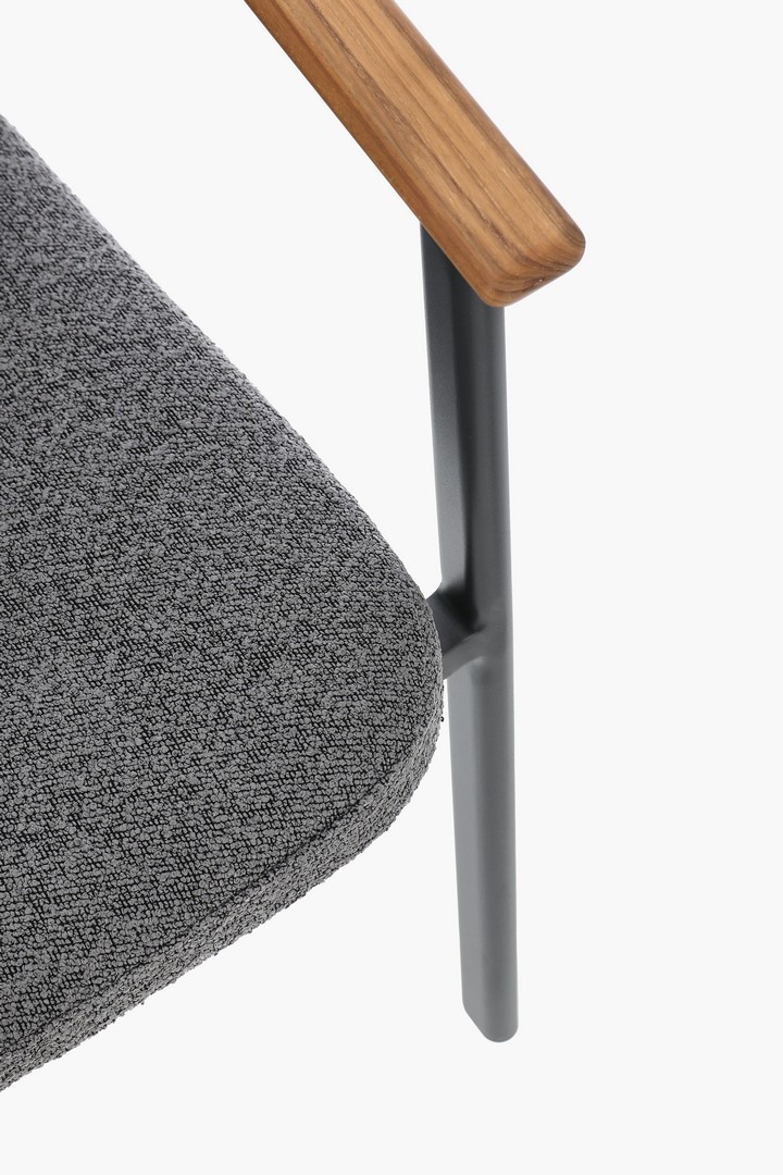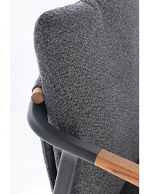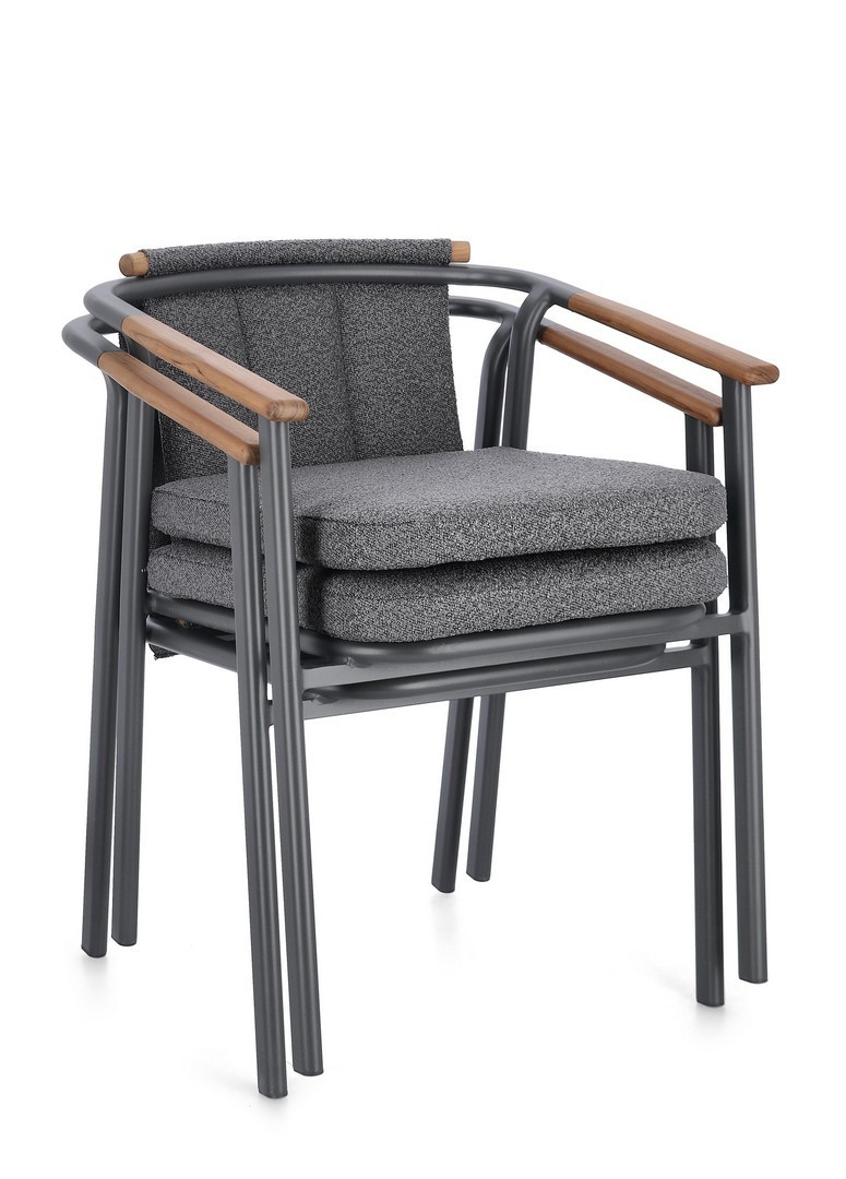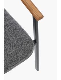 STRUTTURA IN ALLUMINIO VERNICIATO A POLVERE (POLIESTERE). SCHIENALE IN TESSUTO IDROREPELLENTE OLEFIN (100% POLIPROPILENE), EFFETTO BOUCLE'. BRACCIOLI E SCHIENALE CON INSERTO IN TEAK. CUSCINI SFODERABILI IN TESSUTO IDROREPELLENTE OLEFIN (100% POLIPROPILENE), EFFETTO BOUCLE'. IMPILABILE.