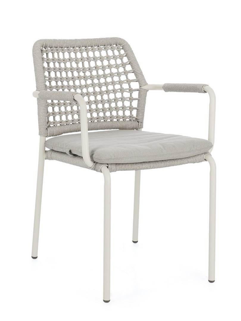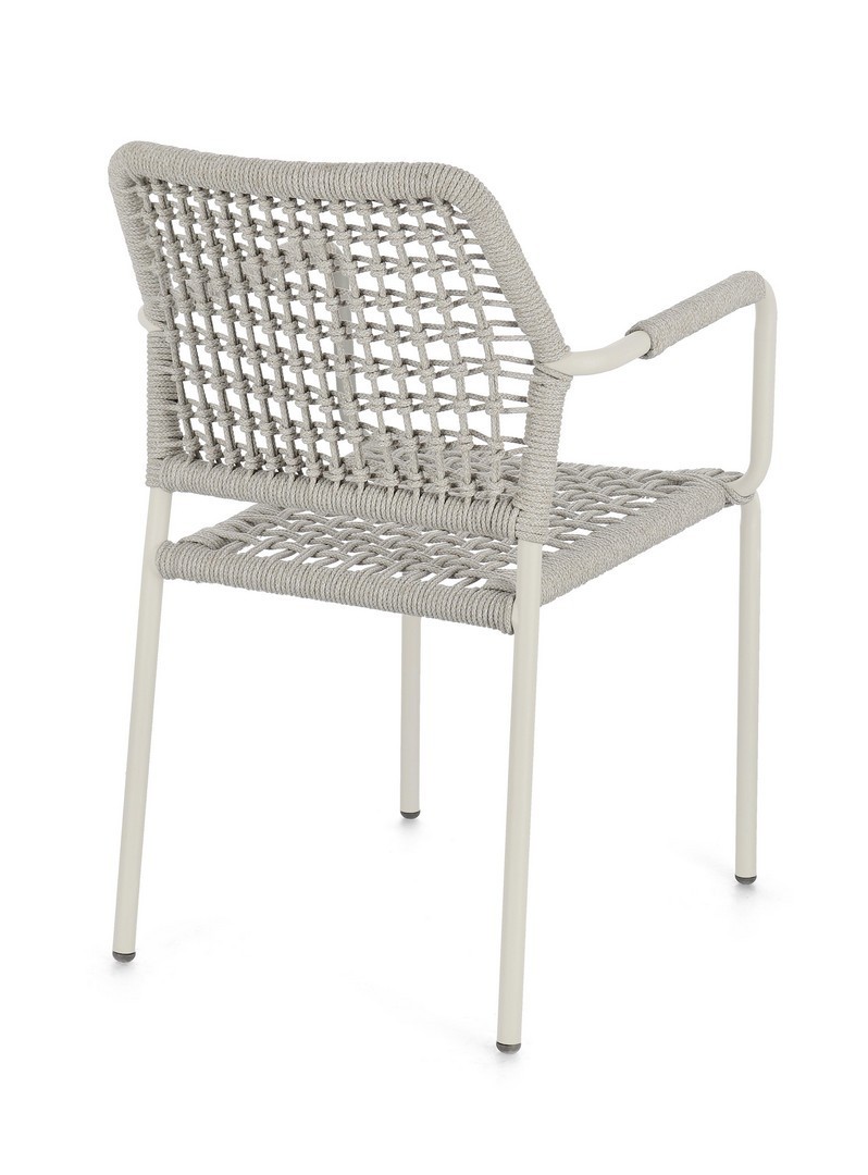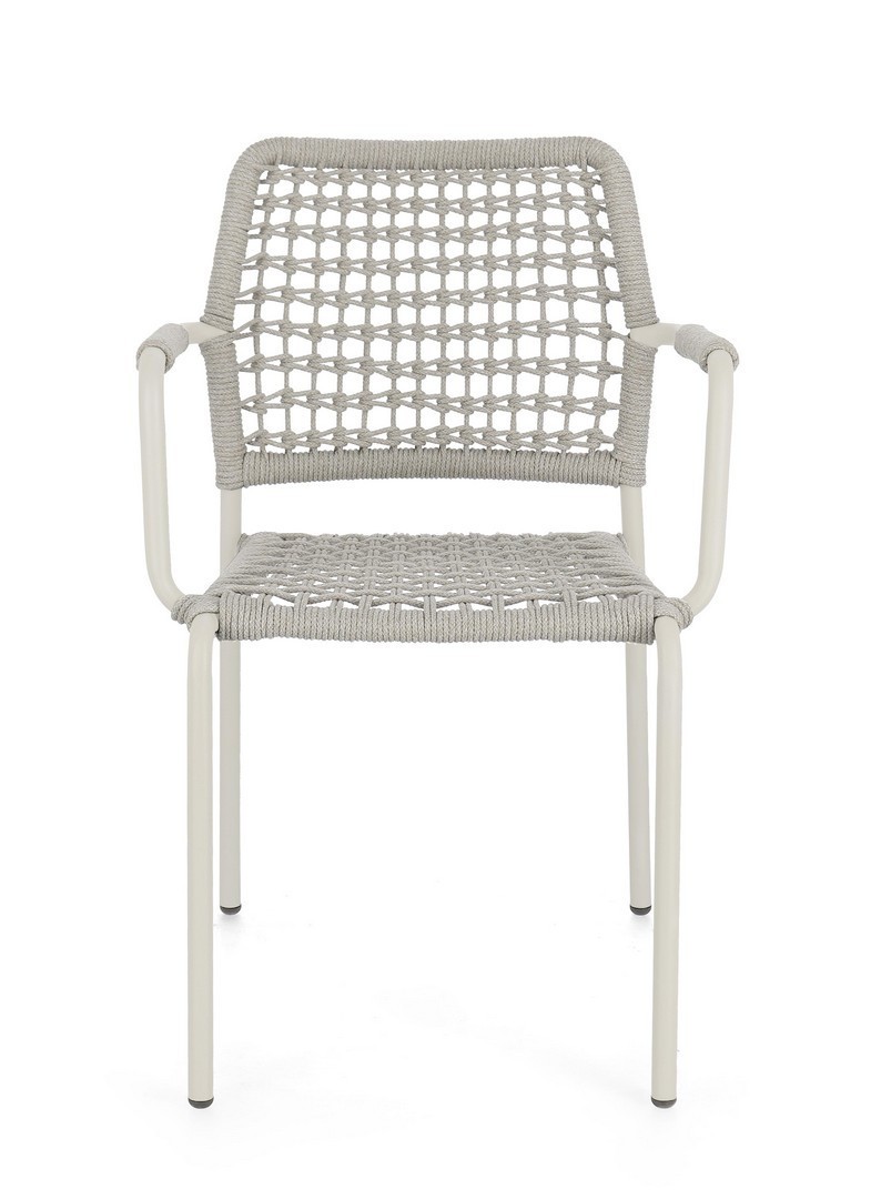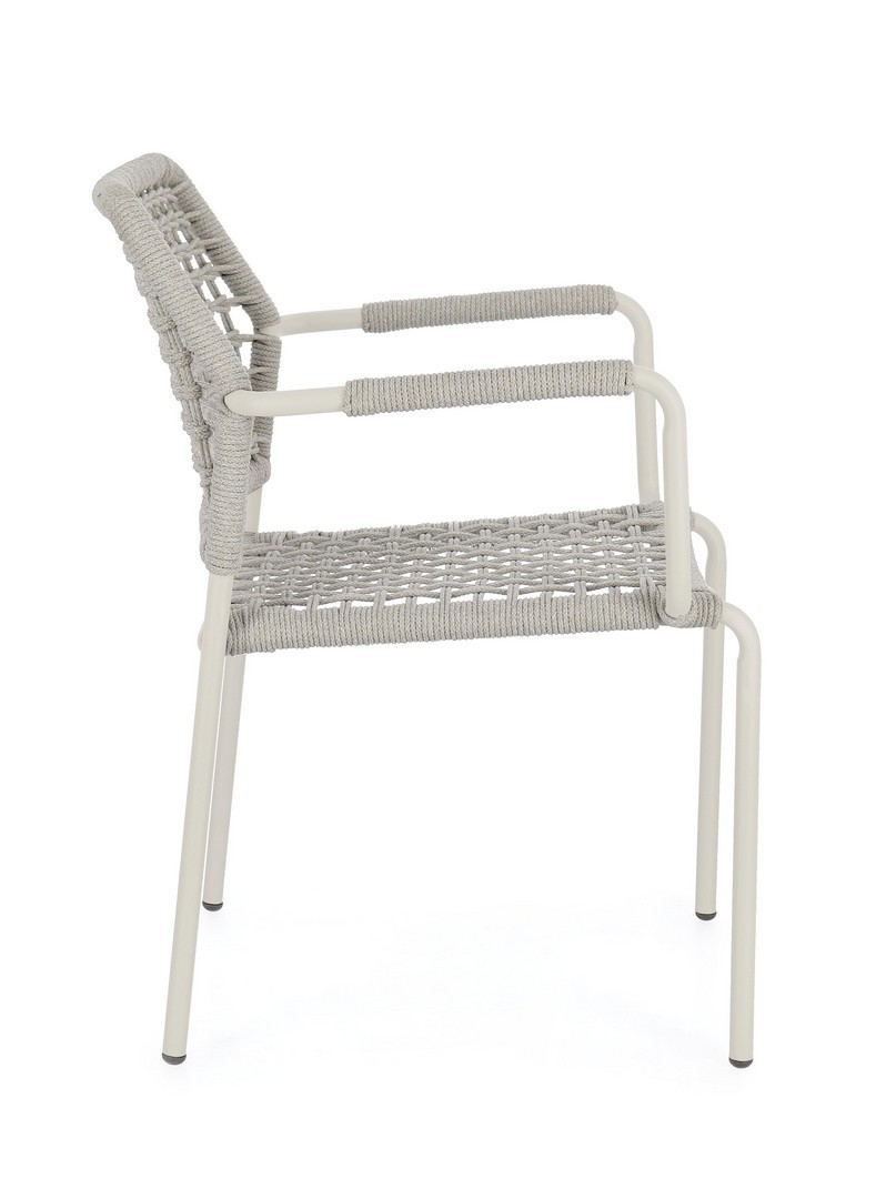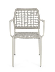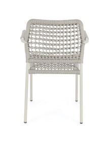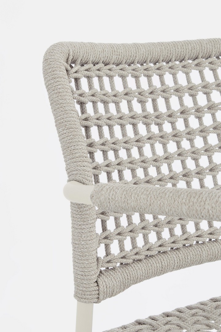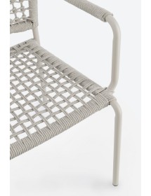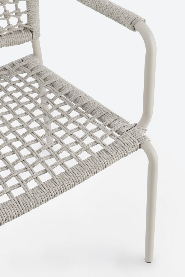 STRUTTURA IN ALLUMINIO VERNICIATA A POLVERE (POLIESTERE). INTRECCIO PER ESTERNO IN CORDA POLIESTERE. IMPILABILE. IMBALLO SENZA CARTONE.