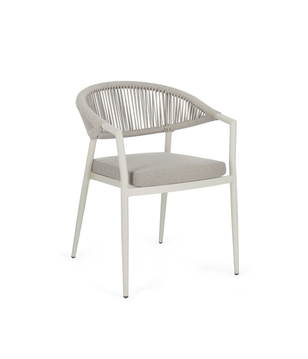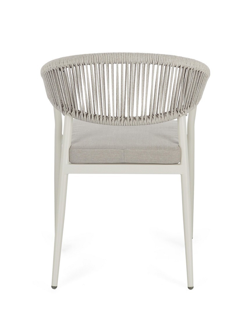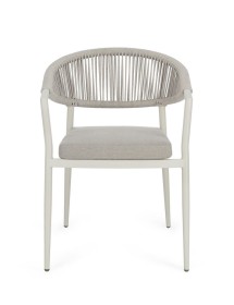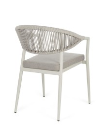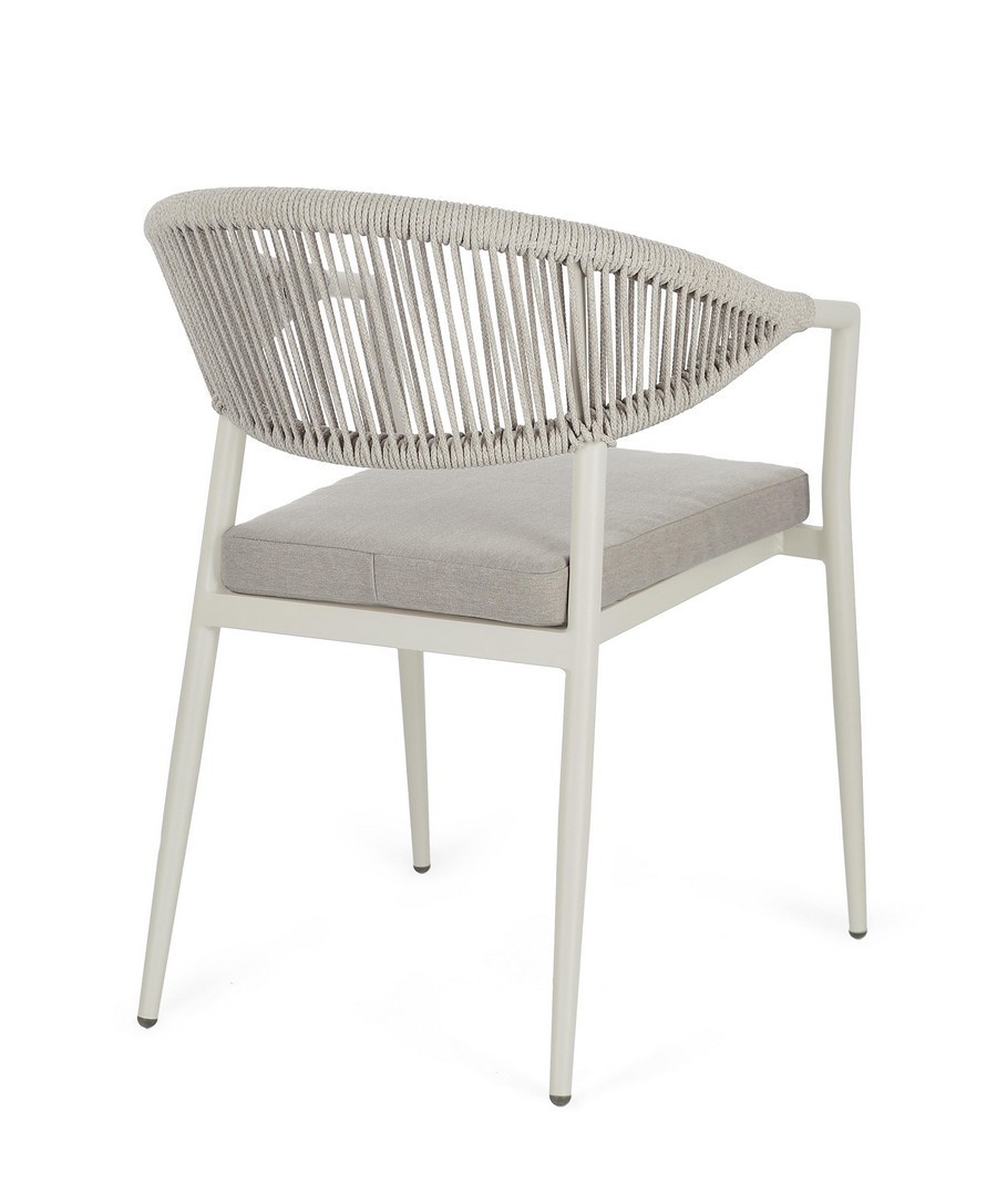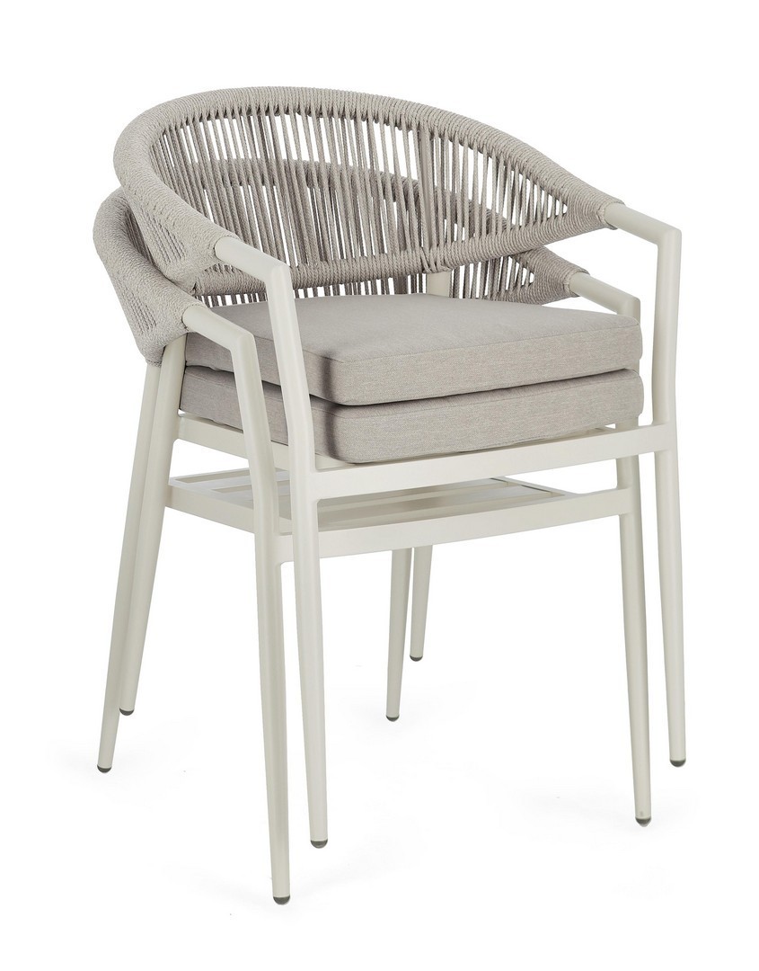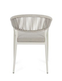 STRUTTURA IN ALLUMINIO VERNICIATA A POLVERE (POLIESTERE). INTRECCIO PER ESTERNO IN CORDA POLIESTERE. CUSCINI SFODERABILI IN TESSUTO IDROREPELLENTE 100% POLIESTERE. IMPILABILE.