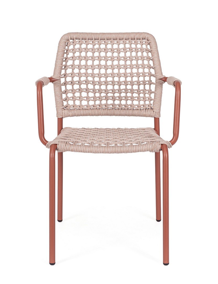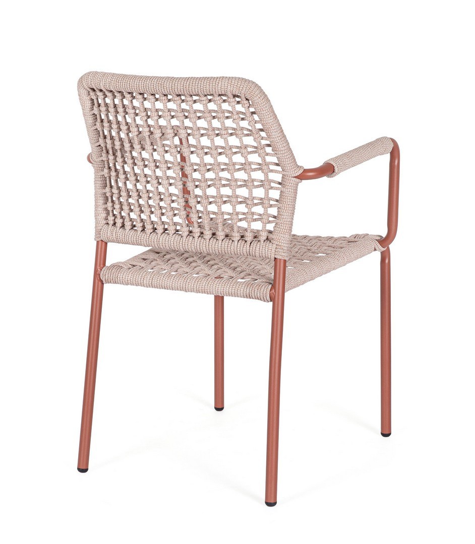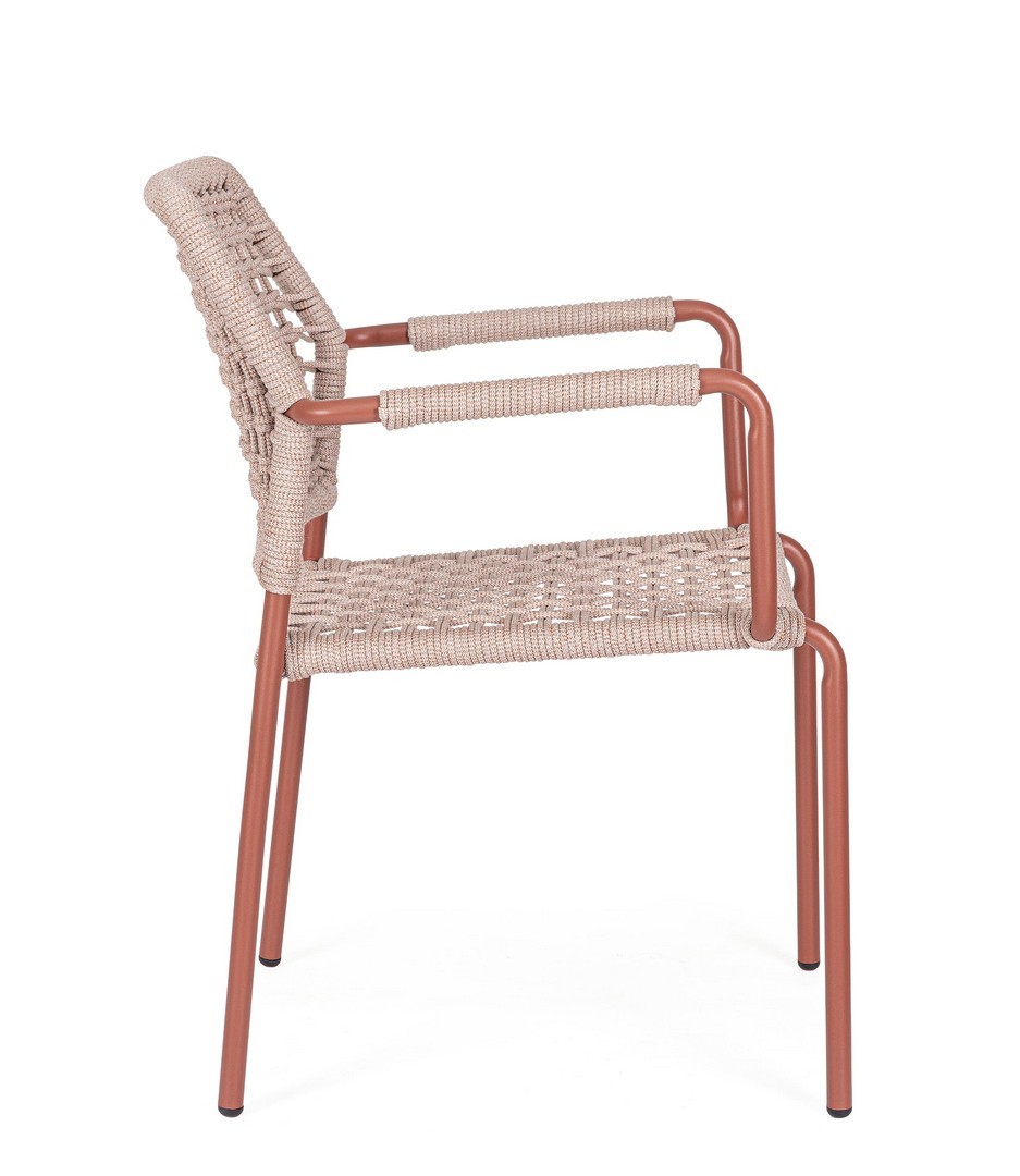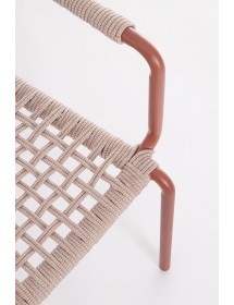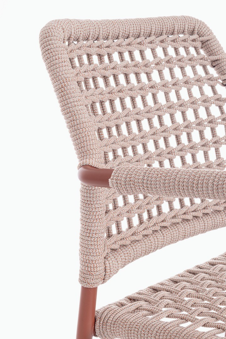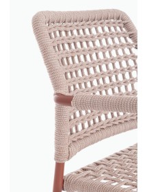 STRUTTURA IN ALLUMINIO VERNICIATA A POLVERE (POLIESTERE). INTRECCIO PER ESTERNO IN CORDA POLIESTERE. IMPILABILE. IMBALLO SENZA CARTONE.