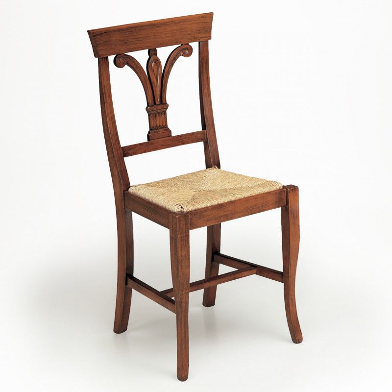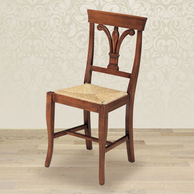 Sedia in stile classico con spalliera sagomata e schienale traforato a forma di giglio.
