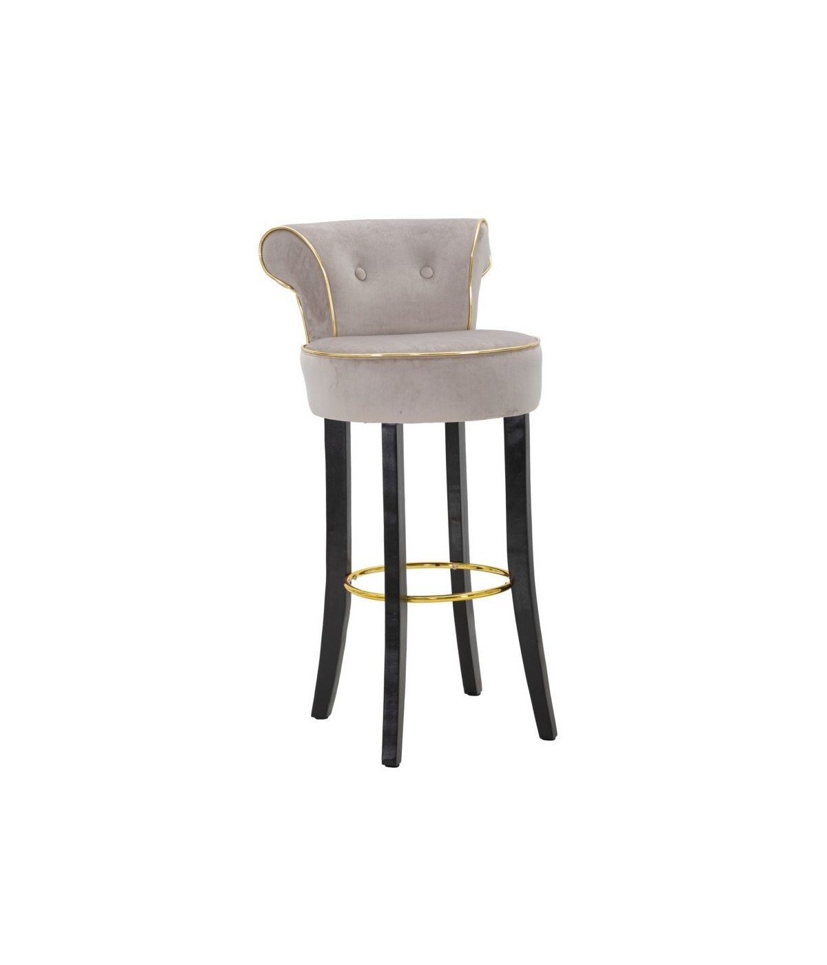 Sgabello bar rotondo imbottito in velluto sintetico con schienale con poggiapiedi in metallo dorato. La forma semplice e le linee essenziali lo rendono perfetto per essere combinato a qualsiasi tipo di arredo.