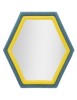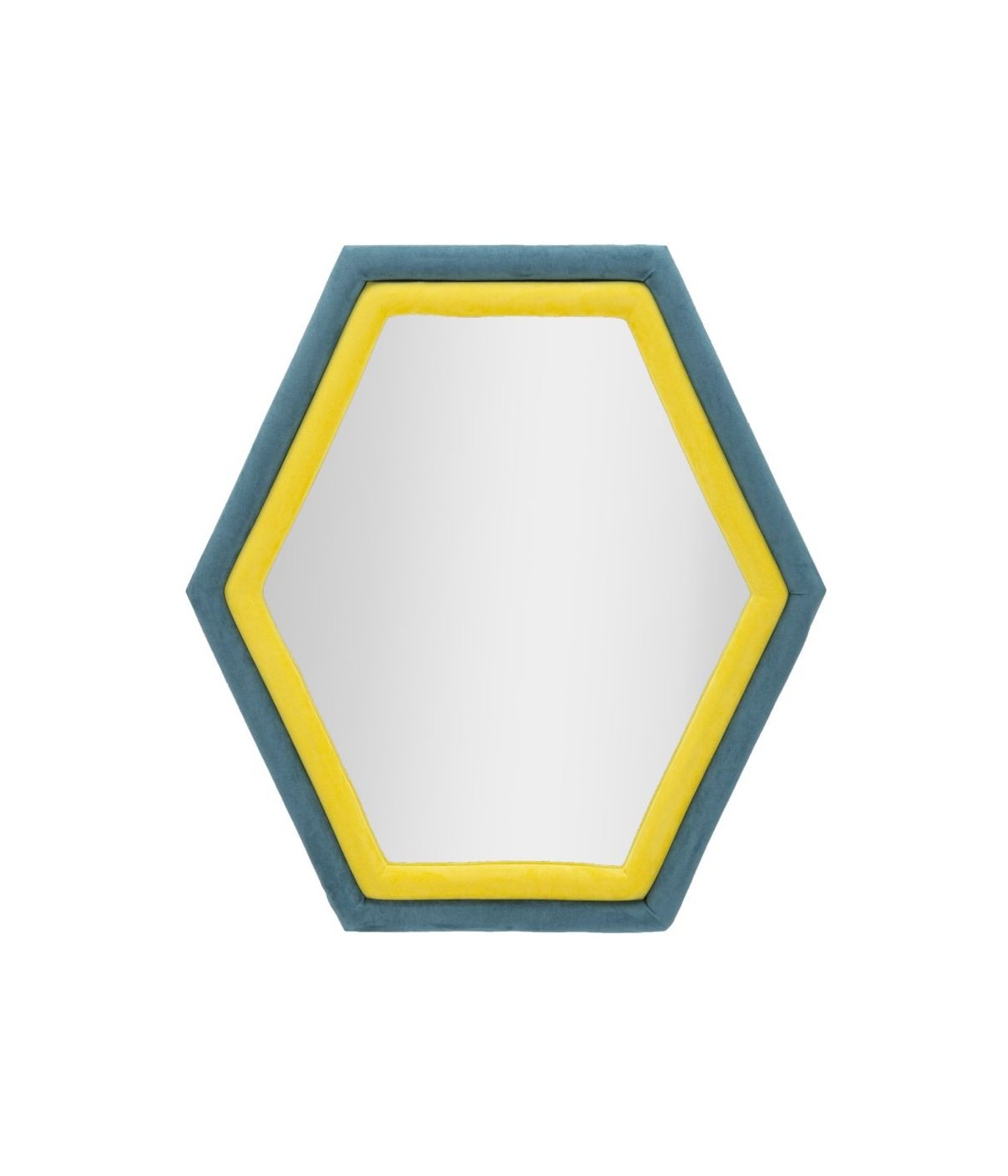 Specchio da parete esagonale con semplice cornice in legno rivestito in tessuto.