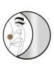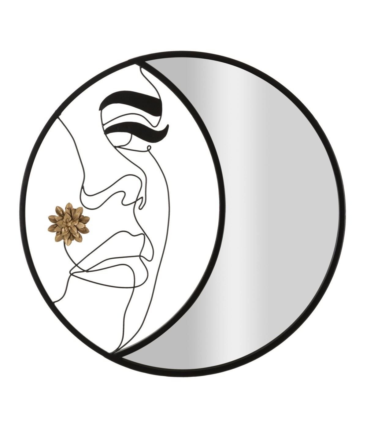 Specchio da parete a forma di mezzaluna incastonato in una struttura rotonda decorata con linee morbide che compongono un volto dai tratti che richiamano l'arte cubista.
