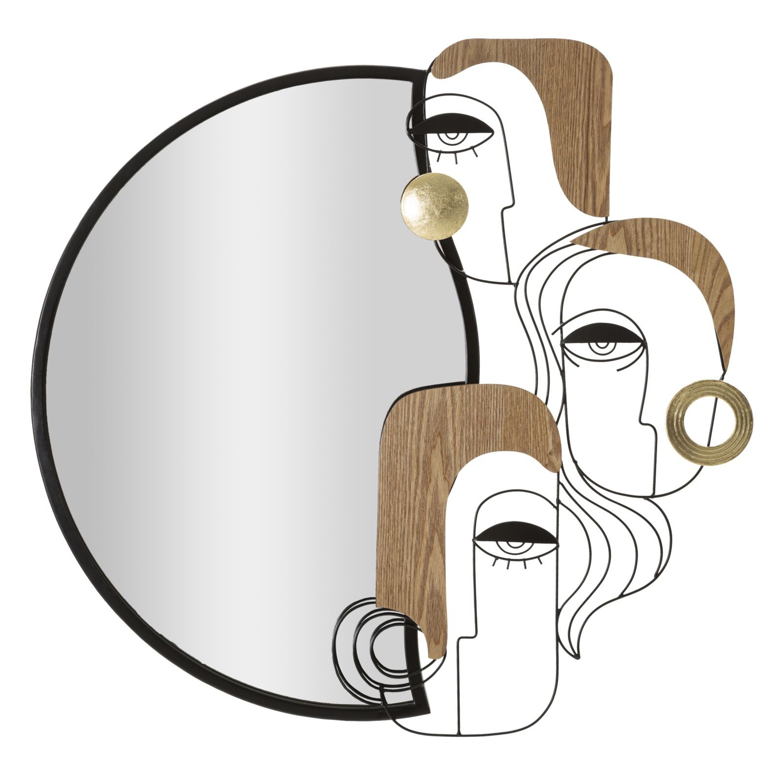 Specchio da parete con eleganti facce che richiamano l'arte cubista, realizzate con linee morbide in metallo e decorate con inserti in legno.