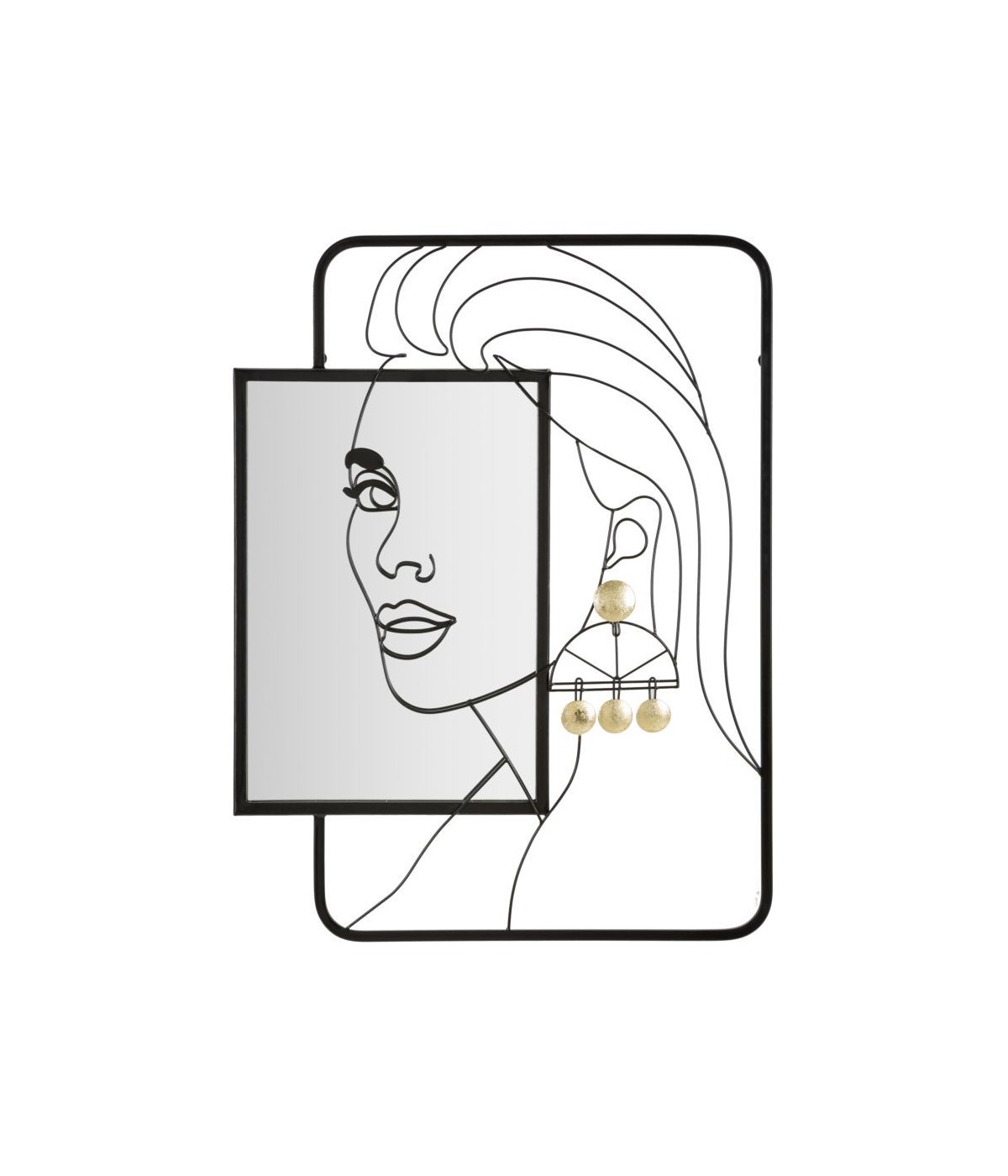 Specchio da parete incastonato in un elegante pannello in metallo nero in cui è raffigurato il volto di una donna con orecchino con parti dorate.