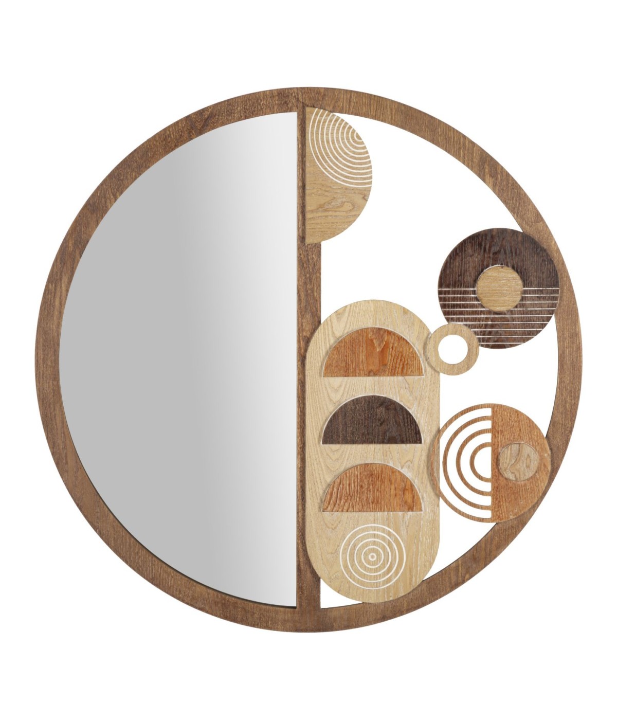 Specchio rotondo da parete impreziosito da un elegante composizione di parti in legno di varie forme e colori.