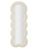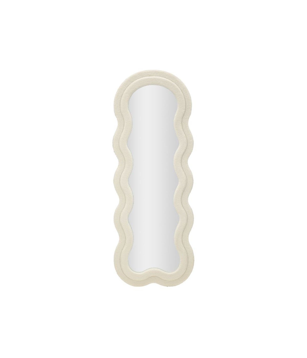 Specchio da parete crema con cornice in legno rivestita in tessuto bouclè dalle forme morbide e sinuose.