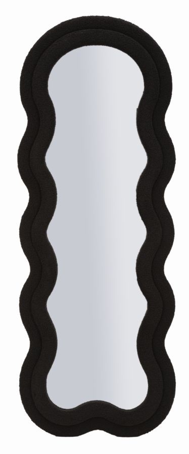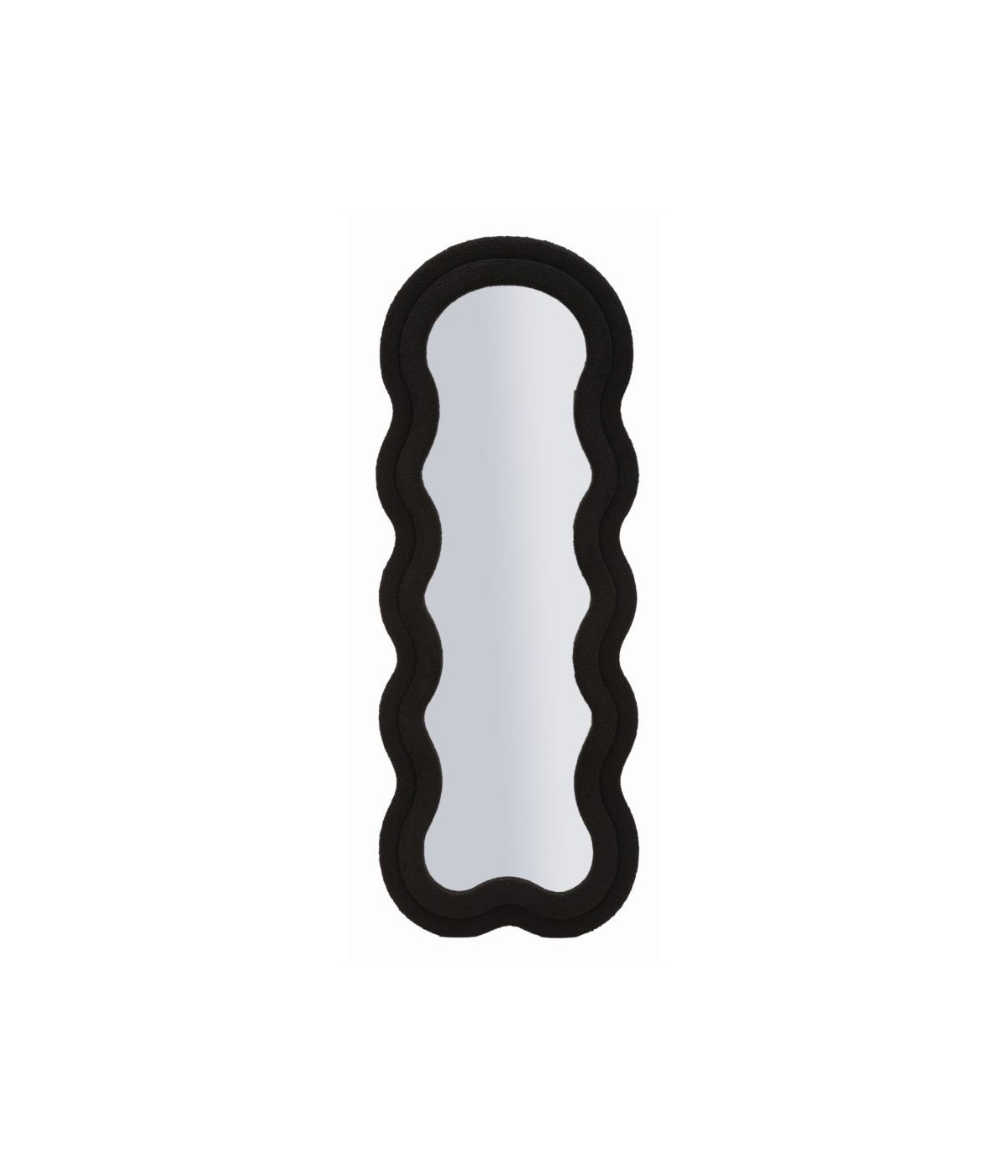 Specchio da parete con cornice ondulata in tessuto teddy nero. Design moderno e grintoso, perfetto per ambienti minimal o industrial chic.