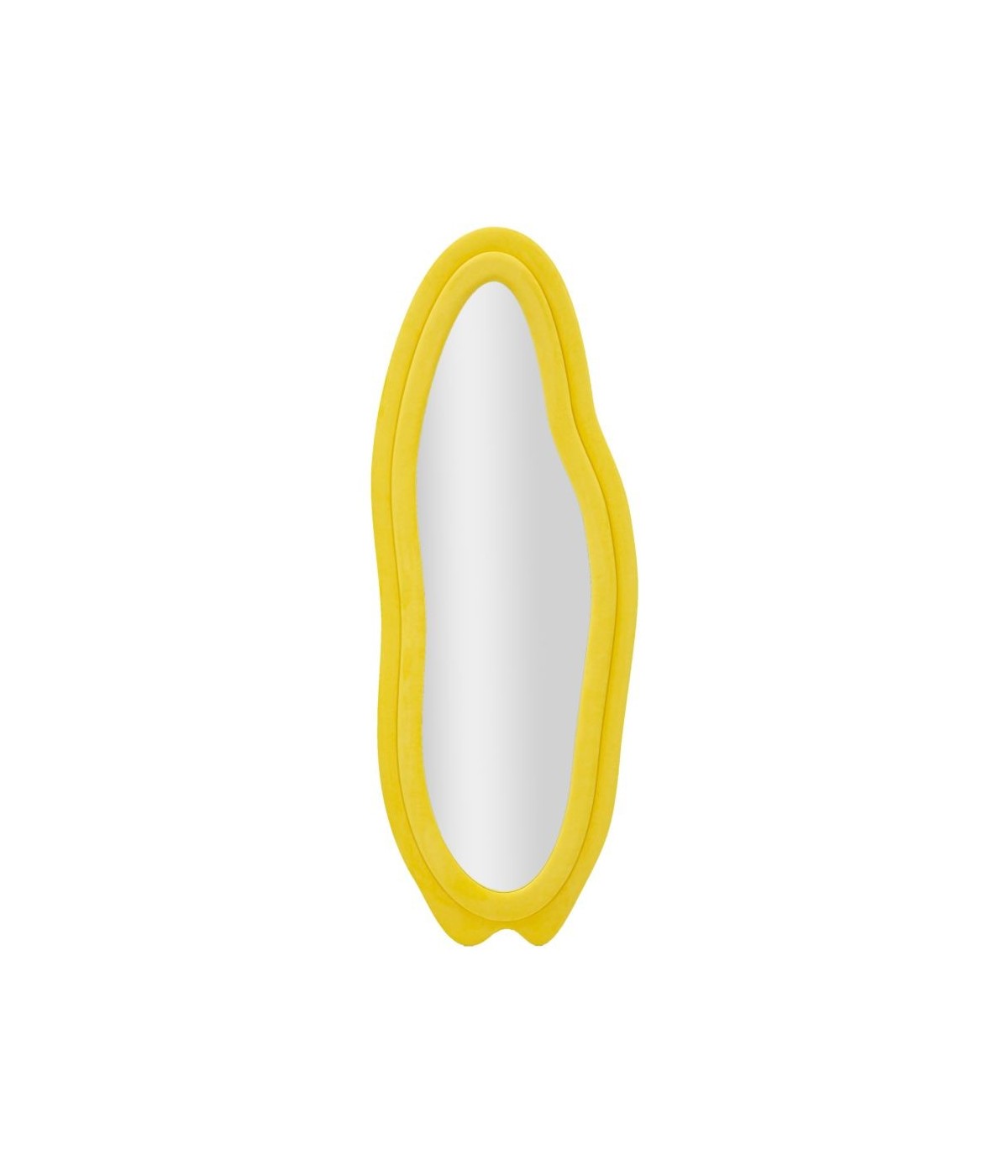 Specchio da parete con cornice in legno rivestita in velluto giallo, ideale per un tocco chic e vintage nell'arredamento domestico o in ambienti dal design raffinato.