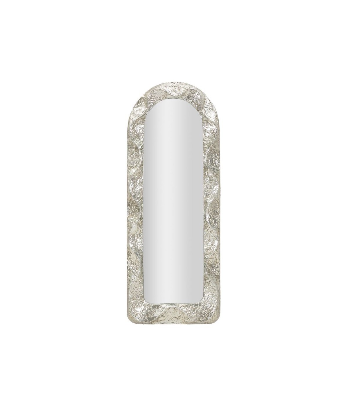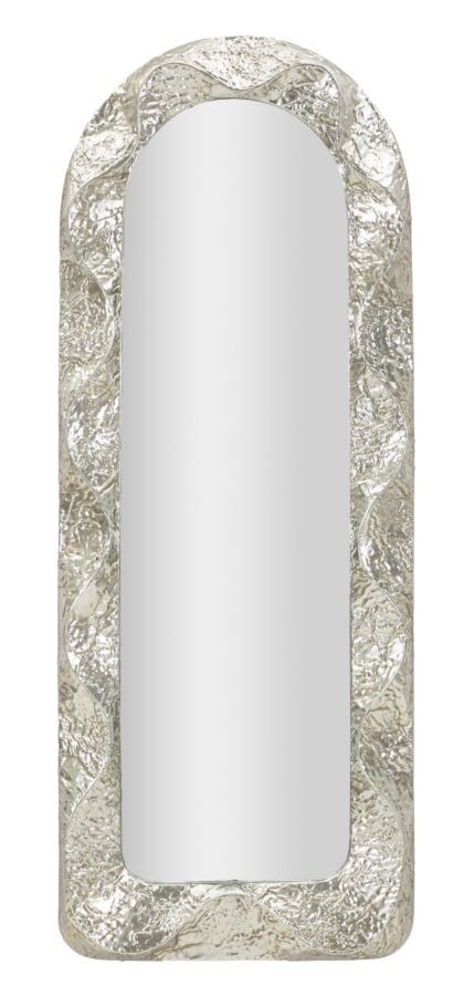 Specchio verticale con elegante cornice ad arco in finitura martellata argento. Le linee morbide e la forma architettonica lo rendono perfetto per ambienti raffinati e moderni. Ideale per l’ingresso, la camera da letto o la zona living.