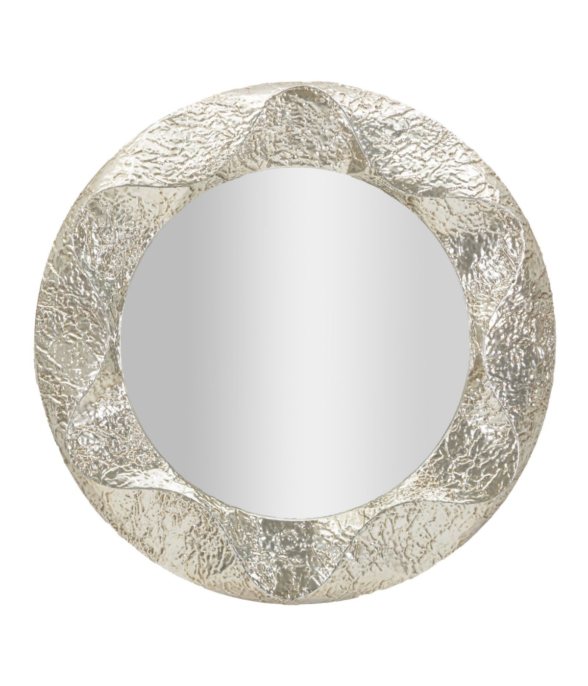 Specchio rotondo con ampia cornice decorativa in finitura metallica martellata. Uno stile sofisticato che valorizza ambienti moderni, classici o glam. Perfetto come punto luce su una parete importante.