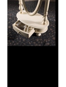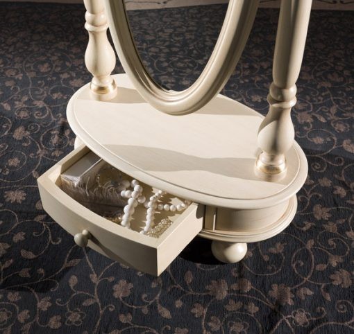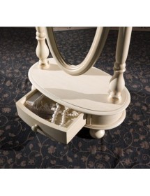 struttura con specchio ovale lavorato e basamento ovale con 1 cassetto e gambe a cipolla