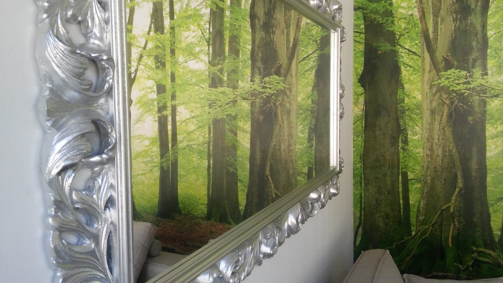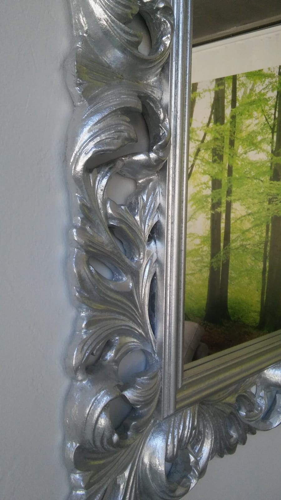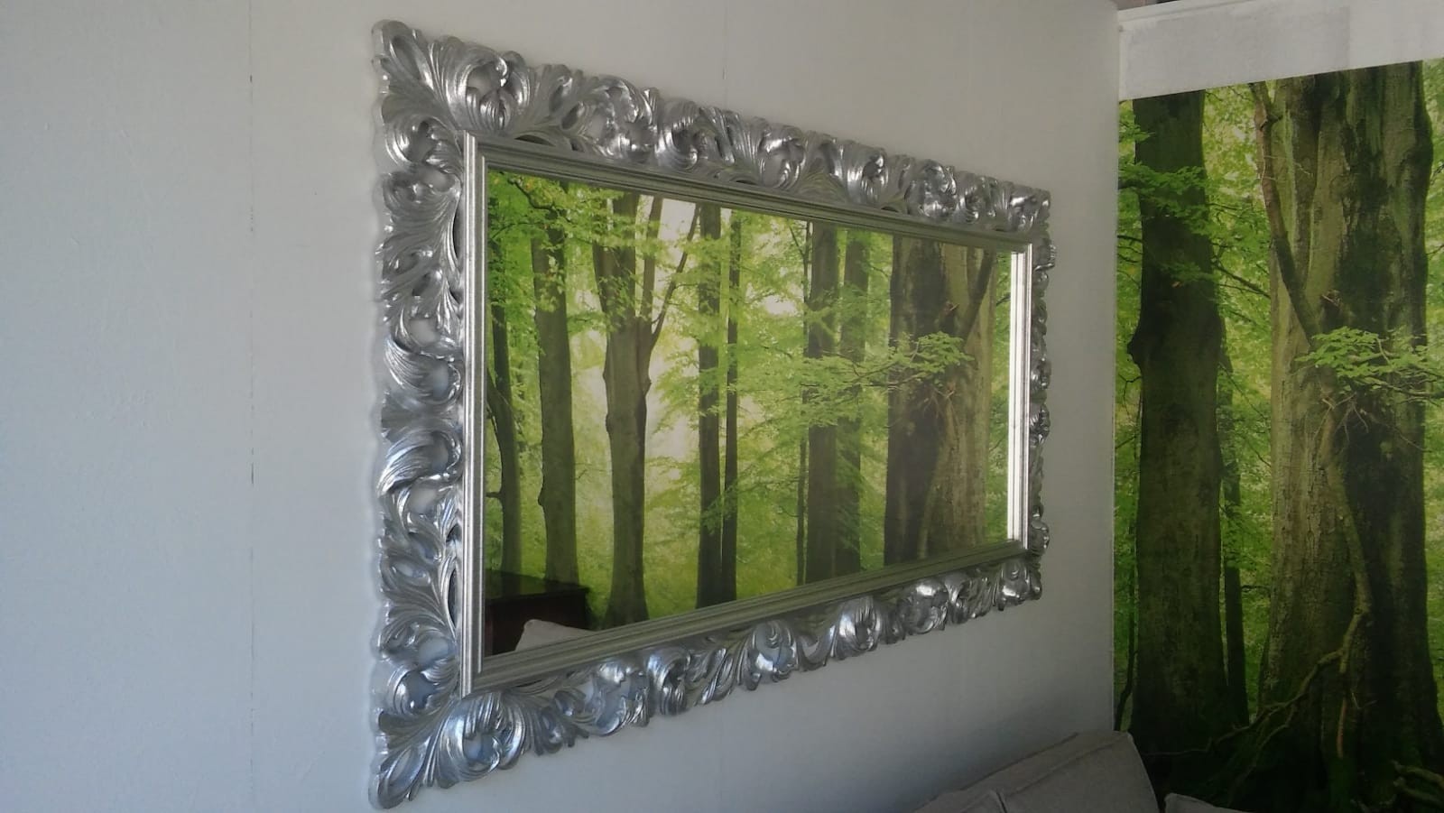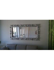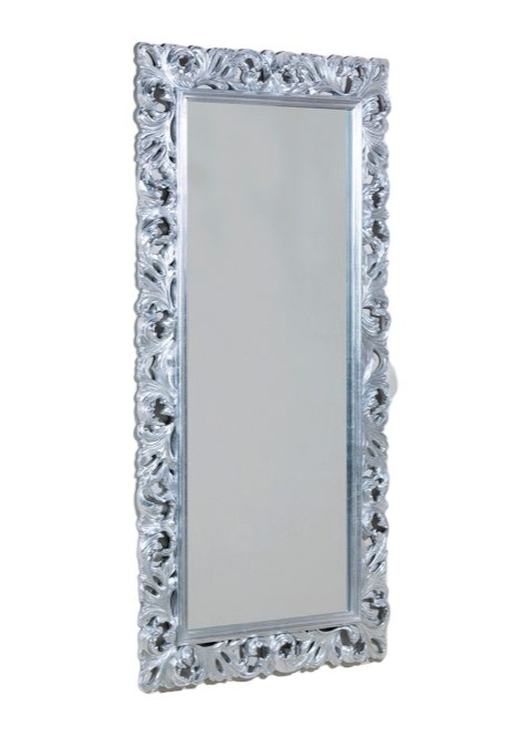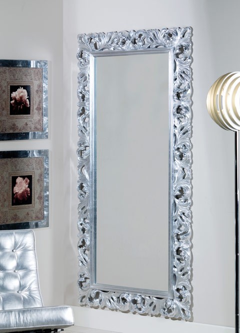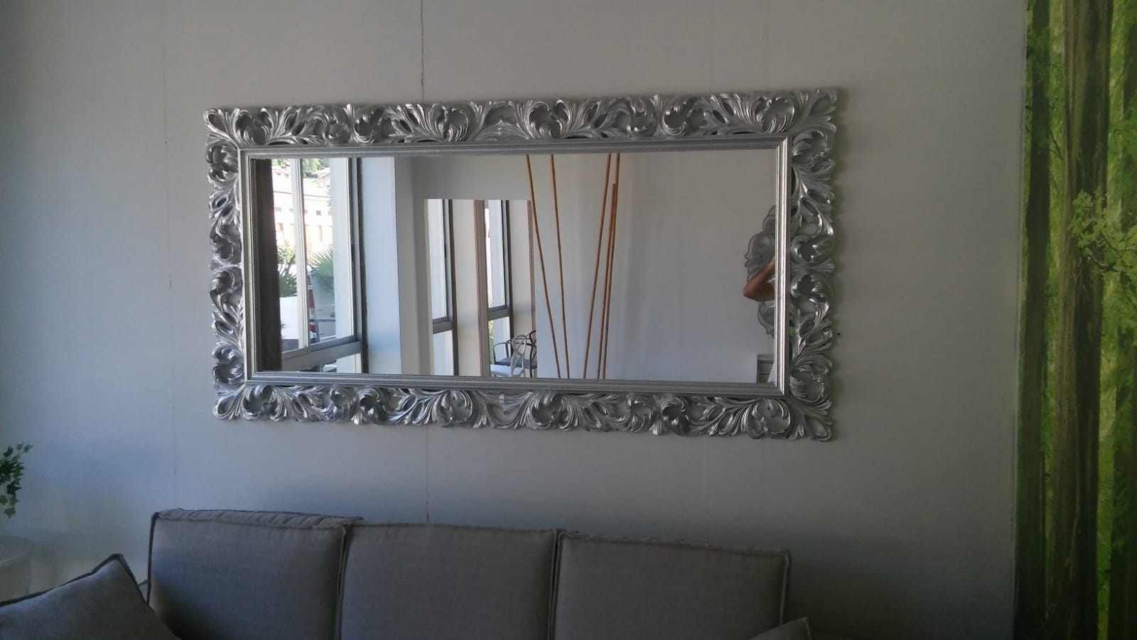 Specchiera rettangolare di ispirazione barocca riccamente lavorata con foglia argento. Si tratta di una grande specchiera che può essere posizionata in verticale per permettere di specchiarsi a figura intera, ma anche in orizzontale, sopra ad un grande comò o sopra una grande credenza.