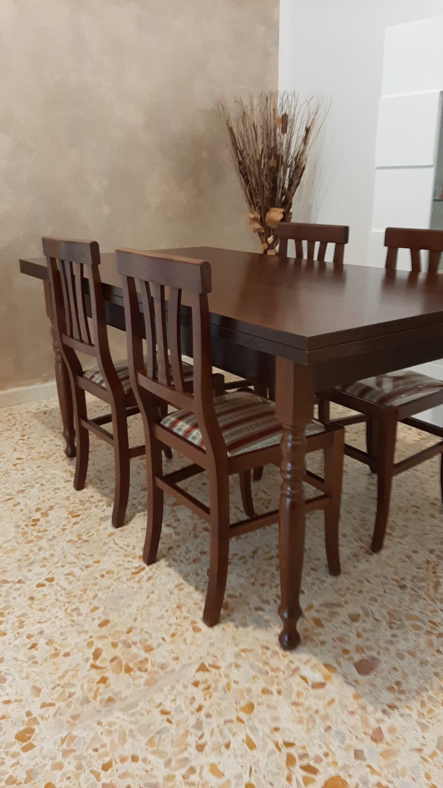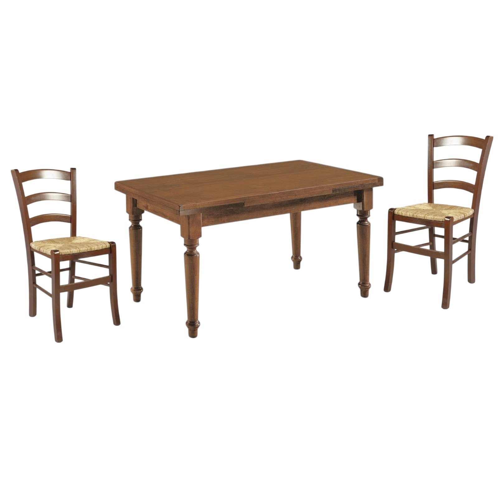 Set tavolo tinta noce gamba tornita 100x70 120x80 140x80 160x85 allungabile con 4/6 sedie seduta paglia